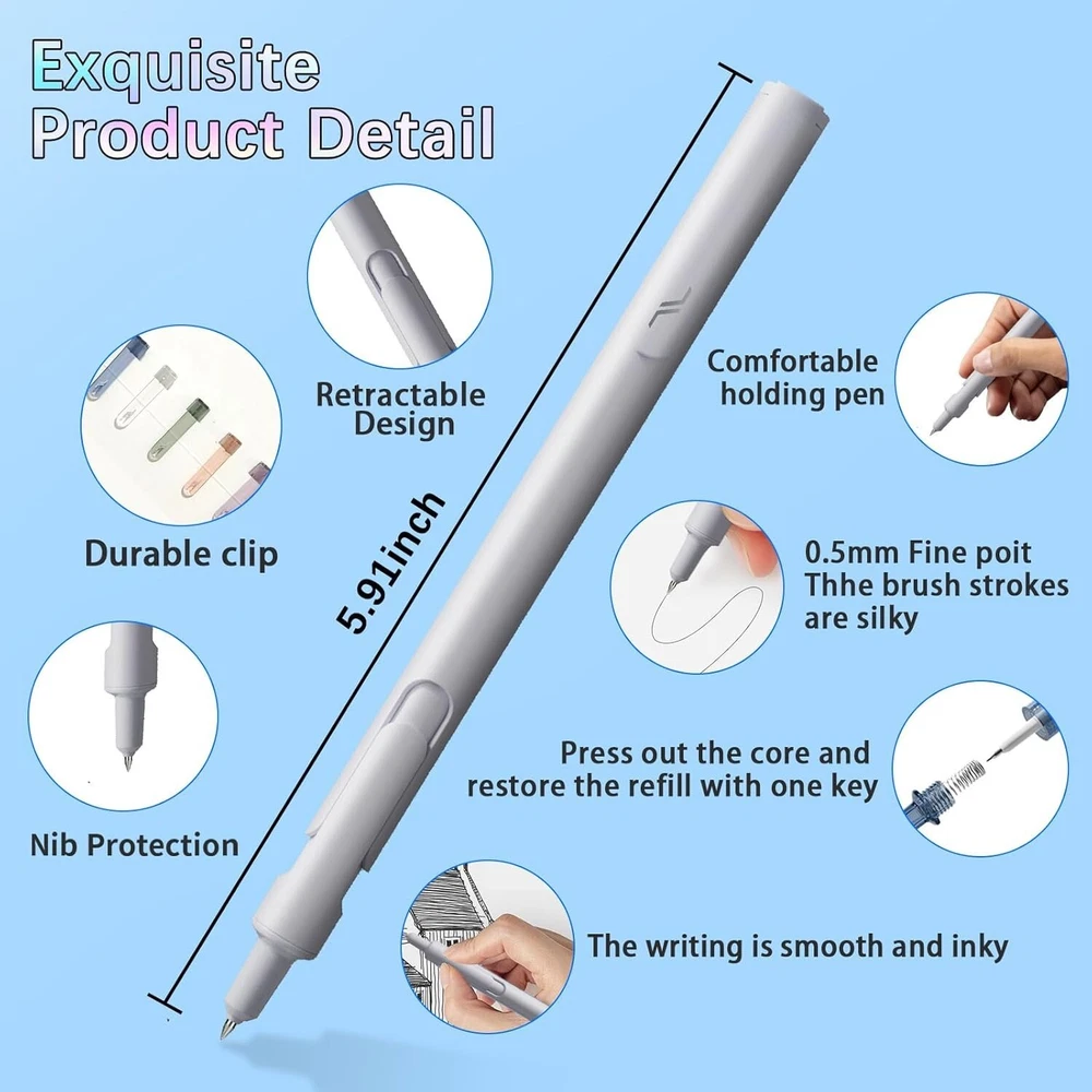 6PCS Gel Pens, Thin Tip Smooth Writing Pens, Telescopic Decompression Mode, Ball Point Pens, 0.5mm Fast Drying Black Ink Pens, Suitable For School Offices, Household Goods, Gifts Tor Men And Women About this item [2024 Upgrade telescopic design]: gel ink pens, fidget pen let children play and help them relieve pressure. These ballpoint pens for children with ADHD can soothe busy hands and brains, so whether you feel anxious or bored while working, waiting, or attending meetings, fine tipped pens can provide help. Let your child enjoy peaceful and fun moments to relieve stress without disturbing their attention - it's completely quiet here. Cultivate creativity, concentration and fun, and use AOWAO color gel pens,black pens, to improve your mood. [Quick drying ink pens]: Each set of AOWAO telescopic gel pen includes 6 bright colors. The gel pen allows you to express your creativity and add color to your works. The thin pointed pen is very suitable for all your writing needs. These pens use 0.5mm thin tip and fast drying ink to provide a smooth writing experience. The retractable gel pen uses fade resistant ink. The black neutral pen does not need to worry about the ink getting on the hand or desk, because it will not fade, do not jump writing experience, bleed or get dirty, and is also suitable for left-handed people. [Classic Design]: It is a versatile choice for any occasion. Whether you are taking notes, doodling, or just enjoying the fun of writing, AOWAO telescopic gel pen is your ultimate companion. Use this telescopic decompression mode pen to enhance your writing experience and experience the fun of smooth and accurate writing. Each writing pen comes with a durable clip that allows you to easily secure it in your notebook, binder, or pocket. [Gifts]: Colored neutral pens, quick drying glue pens, multi-color glue pens, suitable for bosses, wedding parties, Christmas gifts, bachelor parties, teachers, colleagues, bosses, managers, friends, girls, colleagues, activity message boards, team gifts, teenagers, and youth gifts, creating a good atmosphere for friends and family or any occasion. It is an excellent gift for offices, families, companies, students, gel pens sets, school supplies, office supplies, and jewelry for men and women