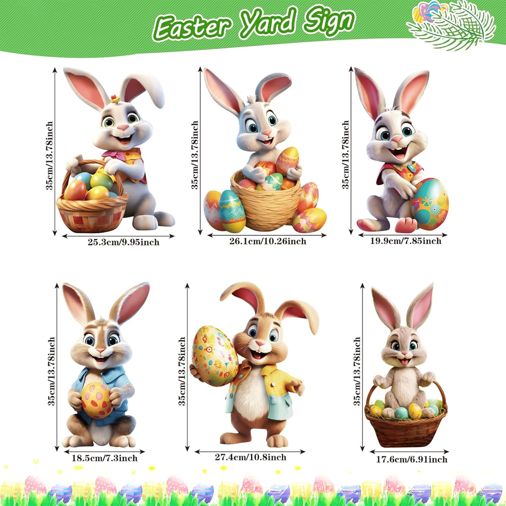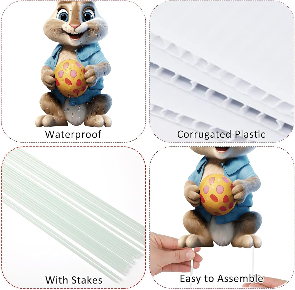 Store New Arrivals Add to Favorite View Feedback Contact Fast deliveries to the customer's home Quality customer service John Make the customers happy! 6PCS up to 48 Inches Bunny Easter Outdoor Decorations Lawn Yard Signs with Stakes, Waterproof PP Safe Material Cute Bunny and Egg Hunt Sign, Funny Rabbits Eggs Basket Decor, Garden Easter outside Ornaments Description Easter Outdoor Decorations Bunnies Yard Sign: If you love bunny, these Easter yard signs would be perfect to your decor. They will be a great feature on your lawn display, wish everyone who’s special a joy-filled Easter Day, it make the perfect spring outdoor decor. Package Include: This set includes 6 uniquely designed Easter bunny yard signs that feature adorable Easter-themed patterns.The 3D emboss effect gives the Easter garden signs a more dynamic and lively look,while the bright colors and cartoon bunny figures will attract attention and bring a joyful atmosphere to your yard Durable and Weather-Resistant: Made from high-quality,weather-resistant plastic cardboard,these Easter yard signs are designed to withstand outdoor conditions.Waterproof and durable,they can hold up well in strong winds and maintain their vibrant colors,and can be used year after year,making them a great investment for your Easter celebrations Bright and Colorful: The vibrant colors of the bunny and eggs create a joyful display that will be the highlight of your Easter celebrations Easy to Install: Each Easter bunny sign comes with 2 plastic stakes that allow you to securely anchor the sign in the ground.Simply insert the stakes into the sign,assemble,and place the bunny sign into the ground—no tools needed! The outdoor decoration bunny signs are designed to withstand wind and weather,ensuring they stay upright and in place Product description Easter Decorations Outdoor, Bunny Yard Signs Part Number Easter bunny br-0108 Style 6PCS Color Bunny Number of Pieces 6 Mounting Type Freestanding Color Brown Bunnies Material Polypropylene Model Number Easter bunny br-0108 Theme Holiday Included Components 6 Easter Bunny Yard Signs Item Dimensions L x W 14"L x 11"W Size Large ABOUT US We offer the best prices around on high quality products. Our E-store includes media such as books, movies, music and games while offering electronics, toys, sporting apparel, clothing, tools, general home, garden items and more. SHIPPING We are always working hard to ensure your package arrives as soon as possible. Please understand that some factors like weather, high postal traffic, and the performance of shipping companies are outside of our control. We offer free shipping to the lower 48 states and ship within 2 business days of payment, usually sooner. We do not accept P.O. Boxes. Please provide a physical address. For shipping outside of the continental USA, we only use eBay's Global Shipping Program. The item is shipped to KY and then sent to the rest of the world. International customers are responsible for all duties and taxes. Continue to 'check out' to calculate costs for shipping the item to your country. Messages regarding eBay's Global Shipping Program MUST be directed at eBay EXCLUSIVELY. RETURNS We offer a 30-Day Return Policy on items in which you are not completely satisfied with. You have the option of a full-refund or an exchange of the item. No returns are available on items shipped outside of the USA PAYMENT We accept PayPal. CONTACT US This page content is yet to come Please ad us to your favorite seller and visit again later Thank You CUSTOMER SATISFACTION We try our very best to make sure every customer is completely satisfied. If there's a problem, message us! We're happy to help. WE ACCEPT