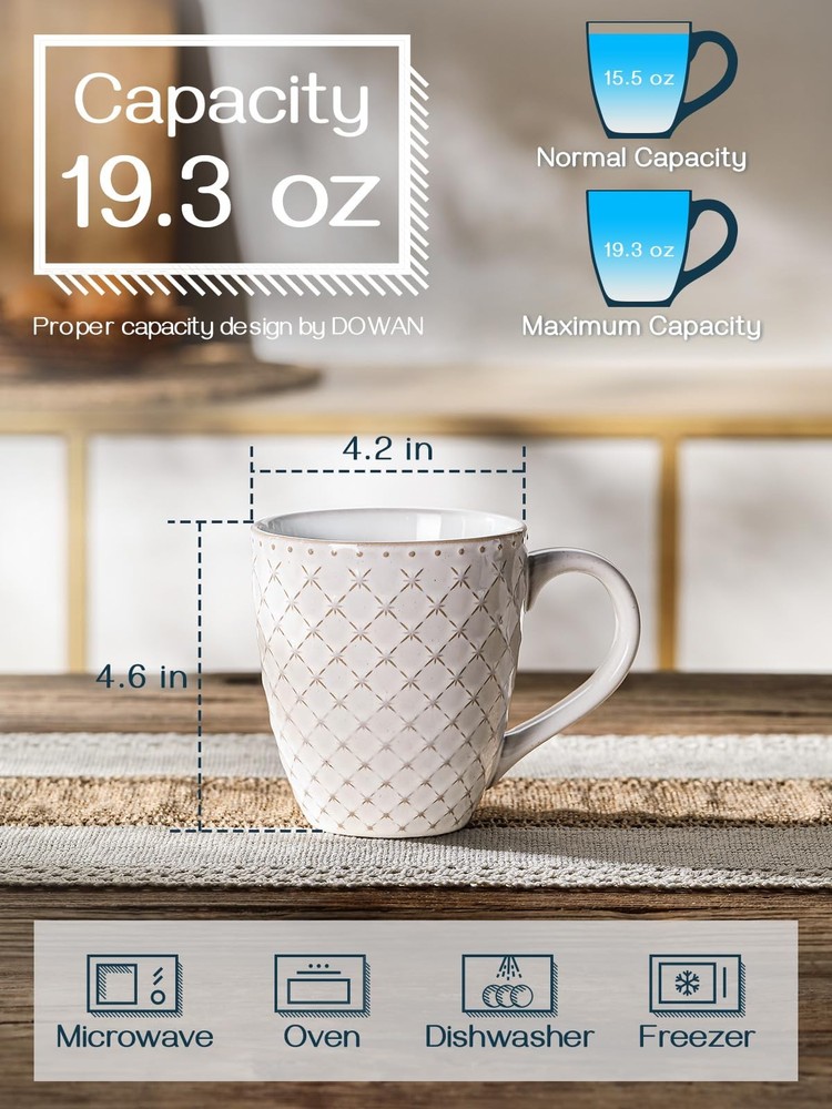Embossed Coffee Mug Set of 6 Farmhouse Style for Kitchen Decor: This 6-piece coffee mug set features 6 different embossed patterns, making each piece unique. The exterior of the mug is embossed and the interior glaze is a smooth ceramic surface. embossed coffee cup will enhance your drinking experience and add beauty to your home and kitchen. Practical yet refined: Sized at 19 ounces, these coffee mugs are deep and large enough for latté, cappuccino, tea, hot cocoa, coffee, milk, chocolate with something added, and other drinks. Suitable for home, office, party, restaurant, and holiday occasions. Sturdy and Healthy: Made of high-fired porcelain and stick-resistant glaze, which is not only durable but also ensures flavor and aroma of the drink. Lead-free and chip-resistant make mugs set healthy and sturdy for long-lasting daily use. Microwave, oven, freezer, and dishwasher safe. Easy to Grip and Steady: There’s enough space between the handle and the cup itself. Well balanced and comfortable to hold even when the mug is full. This porcelain mug has a weighted base, which makes it difficult to knock over and safe next to the computer. Gift-worthy Attributes: Looking for a memorable gift? This set of ceramic coffee mugs is a perfect choice for housewarmings, weddings, birthdays, or any special occasion. The stunning design, practical size, and durable craftsmanship make them a thoughtful and functional gift that will bring joy and cherished.