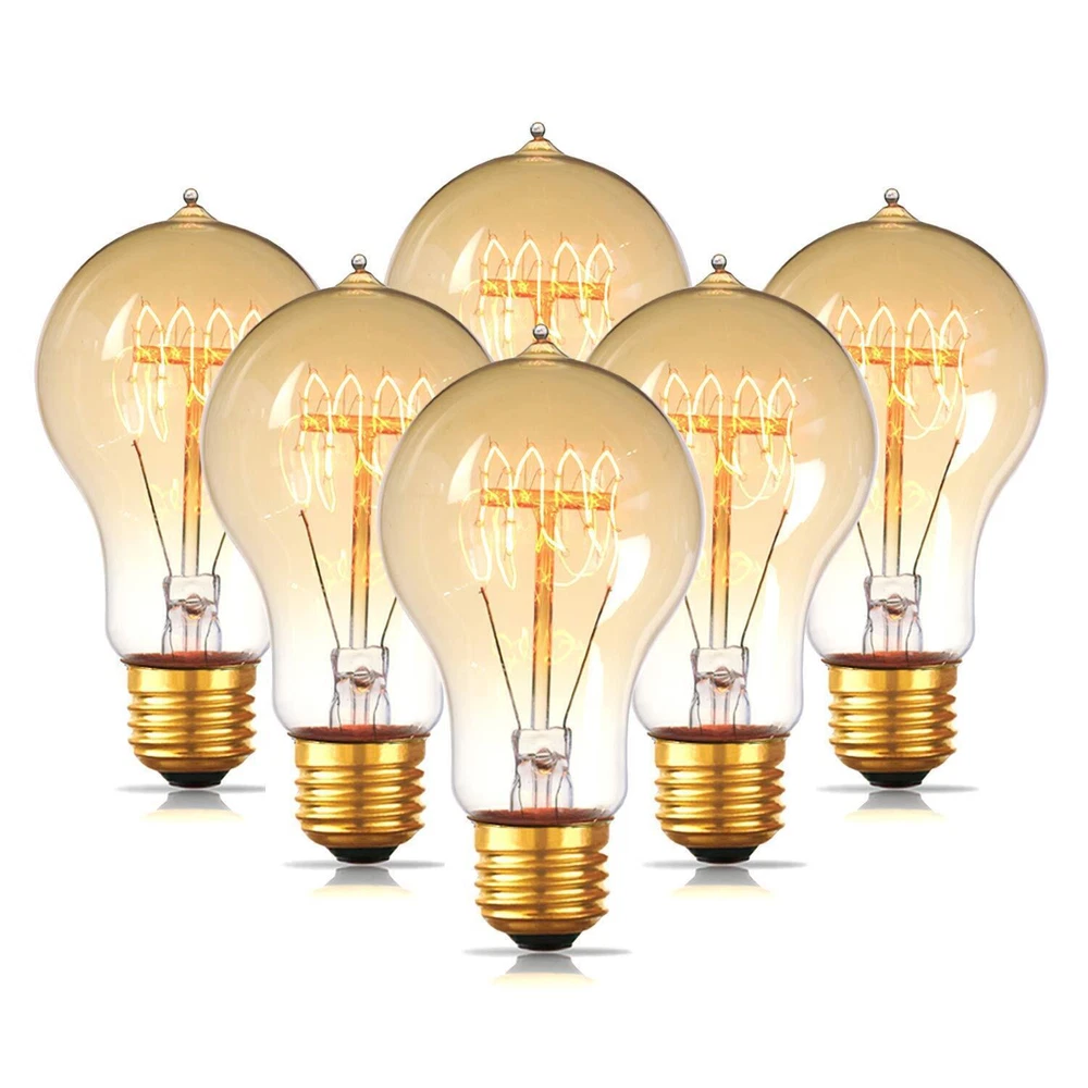 6-Pack Edison Light Bulb 60 Watt, Dimmable A19 Antique Vintage Old Fashioned E26 Incandescent Light Bulbs, Amber Warm White Light Type Incandescent Special Feature Dimmable Wattage 60 watts Bulb Shape Size A19 This A19 vintage edison light bulb with squirrel cage style filament, Amber glass, create to create classic atmosphere, fantastic for decorative lighting, standard (Medium) base E26 fit all home lighting fixture A19 old fashioned Edison Bulbs 60 watt are exactly like a traditional Edison teardrop shape with warm glow allow you to perfectly light any space which will be the perfect piece for adding a timeless charm to your house Designed in Edison vintage style appearance, suitable for home or commercial decoration, indoor or outdoor, such as chandeliers, pendant lighting, wall sconces, use at kitchen, living room, bedroom, restaurant to create warm and intimate lighting It comes with 6 pack 60W 110V 230LM Edison bulbs, each one packed in an individual box, make sure the bulbs are well protected during transit, Need no worry about receiving broken/damaged light bulb. If bulbs are damaged or broken during transit, we' ll make timely compensation Jslinter Light Bulb Made from high quality "Thomas Edison" style filament and premium outer glass. Long lifespan for 3500 hours, effectively reduces frequency of changing light bulbs, we strive to provide top quality vintage light bulb to you