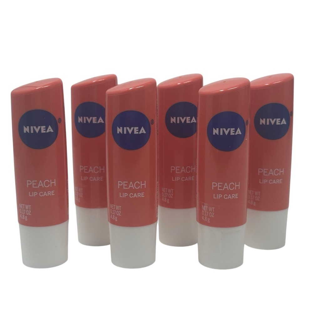 You're purchasing a lot of 6 brand-new, factory-sealed NIVEA Peach Lip Care tubes (0.17 oz / 4.8g each). This version has been discontinued and is becoming increasingly hard to find. The balm is enriched with Shea Butter, Castor Seed Oil, and Peach Juice Extract to provide smooth hydration and a light peachy scent. Ideal for collectors, resellers, or longtime fans of this discontinued formula. Each tube is clearly marked with the original UPC: 072140022860 , and was made by Beiersdorf AG, Germany . Features: Lot of 6 lip balms (0.17 oz / 4.8g each) Discontinued NIVEA Peach Lip Care formula Enriched with Shea Butter & Peach Juice Sealed tubes, never opened or used Made in Mexico / Distributed by Beiersdorf Inc. UPC: 072140022860 Ingredients include: Castor Seed Oil, Candelilla Wax, Shea Butter, Microcrystalline Wax, Peach Juice, and more (see last photo) Shipping & Returns: Free US Shipping 30 day returns (must be returned in original, sealed condition) Price: $21.99