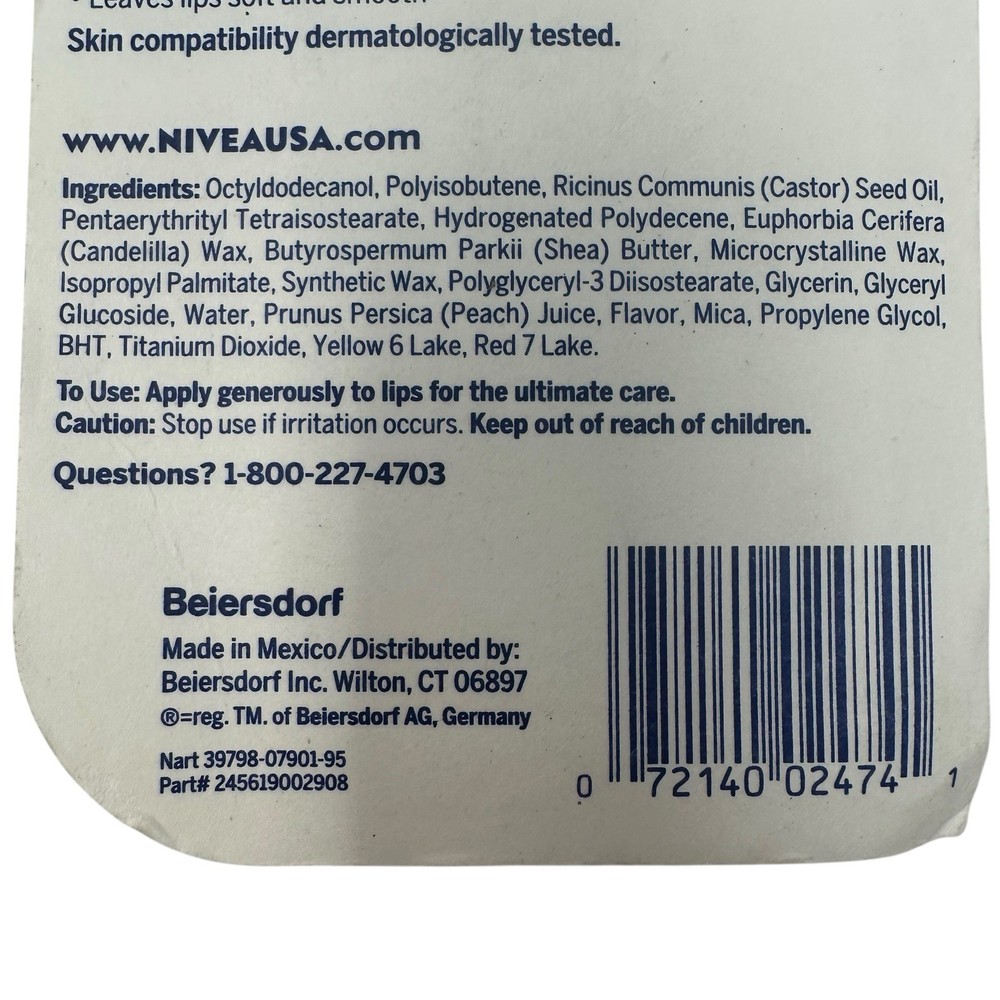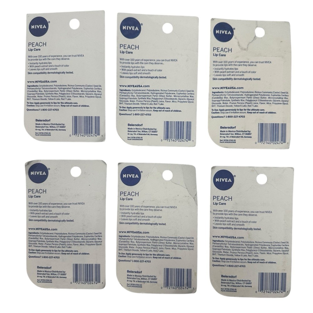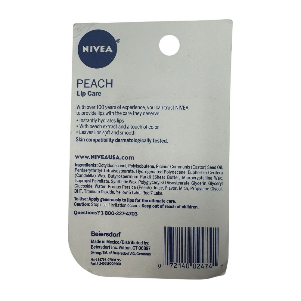Brand New / Factory Sealed. All six 2-packs (total of 12 lip balm tubes) are sealed and unused. Packaging may show some signs of shelf wear such as creases or light scuffs, but all units are intact and unopened. Please refer to photos for exact condition. Description: Keep your lips moisturized and feeling great all day with this lot of 6 NIVEA Peach Lip Care twin packs , for a total of 12 tubes (0.17 oz each) . Infused with peach extract and a subtle touch of color, these balms are dermatologist-tested and perfect for daily hydration. This bundle offers excellent value and makes a great resale lot, gift stock, or personal supply. Features: Brand: NIVEA Variant: Peach Lip Care Size: 0.17 oz (4.8 g) each / 0.34 oz (9.6 g) per 2-pack Quantity: 6 twin-packs (12 tubes total) Moisturizes & softens lips with peach extract Skin compatibility dermatologically tested Distributed by Beiersdorf Inc., Wilton, CT – Made in Mexico UPC: 072140024741 Shipping & Returns: Free US Shipping 30 day returns (must be returned in original condition) Price: $24.99 (lot of 6 twin-packs / 12 tubes)
