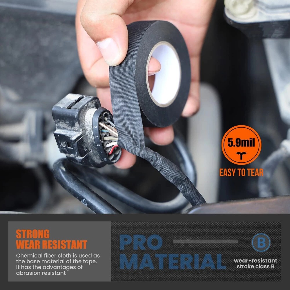 Automotive Electrical Tape: Professional automotive cloth tape 6 pack with 3/4 inch width, 66 feet length and proper 5.9 mil thickness Strong Fabric Wire Loom: Easy to tear fiber cloth is used as the base material of the tape, makes it puncture-resistant and abrasion and corrosion-resistant High Temp Heat Proof: Wiring tape has amazing high and low temperature stability which can work continuously between -40 ℉and 257 ℉ Engine Wire Harness Wrap: Mainly be used in the engine compartment and battery winding insulation and protection, meets excellent stain resistance and aging resistance Strong Adhesive: Our harness tape uses extremely strong adhesive natural rubber but does not turn into a messy goo, it is easy to stick and has low residue when removed