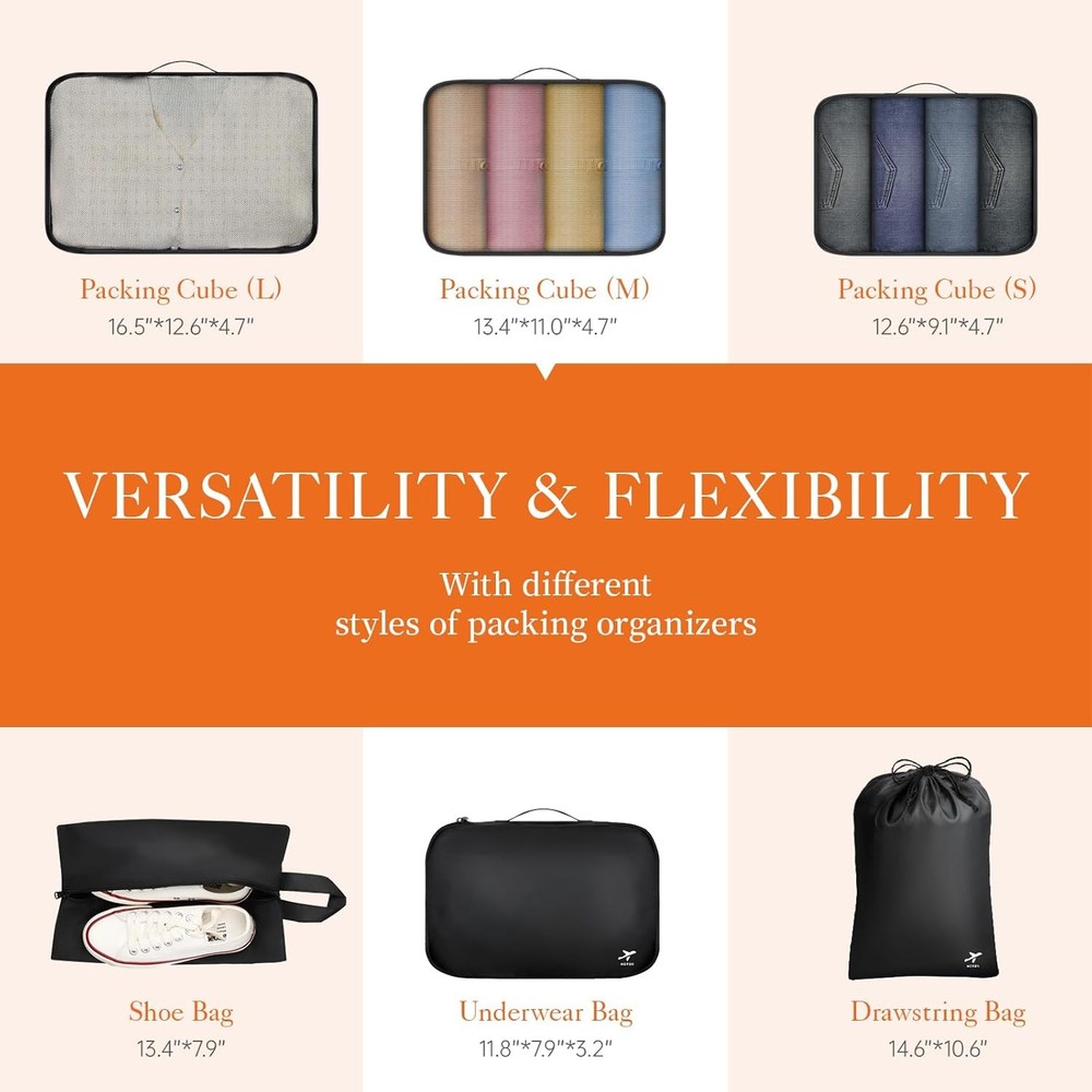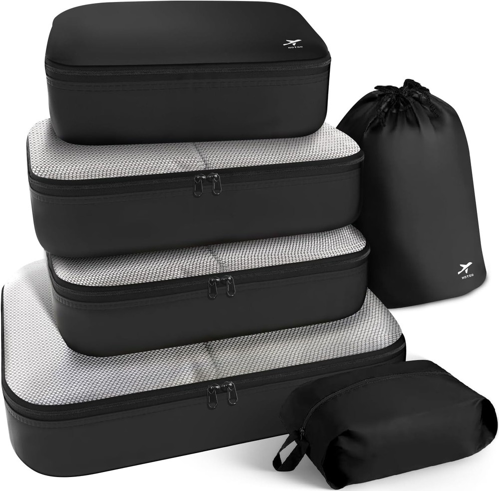 Free eBay listing template designed by dewiso.com HOTOR Packing Cubes for Suitcases - 6 Pieces, Light Packing Cubes for Travel, Premium Suitcase Organizer Bags Set, Space-Saving Luggage Organizers, Travel Accessories and Essentials, Black FREE AND FAST SHIPPING! About this item GET YOUR LUGGAGE WELL-ORGANIZED: With HOTOR 6-piece travel packing organizers, packing is no more a chore for traveling. Just one set is enough for organizing all your travel essentials like clothes, shoes, underwear, and more, making your luggage neat and shipshape. They are not only cruise ship essentials but also ideal for every occasion, like family breaks, business travels, vacations, hiking, camping, RV trips, etc. VERSATILE & FLEXIBLE: HOTOR travel cubes for packing feature 6 different sizes and styles of organizers for different items: 3 mesh bags, 1 shoe bag, 1 drawstring pocket, and 1 underwear bag. Moreover, these packing cubes can be used to stay organized at home, while traveling, and are perfect for camping or any outdoor adventure! You can easily fit them into your suitcases, totes, backpacks, duffel bag, etc. LIGHTWEIGHT & SPACE-SAVING: With the help of HOTOR travel bags, you can maximize the space in the luggage, creating space for other stuff. In addition, the travel organizer bags for luggage are easy to store and carry. They are collapsible and can be folded flat when not in use. The 6-piece set weighs less than 1.0lb and won't add extra weight to your luggage. NEVER FORGET THE ESSENTIALS: Before using these packing cubes for carry-on suitcases, have you often forgotten one or two of your essentials with you when going out? Now it's time to say goodbye to carelessness! Let HOTOR packing cubes help you to sort out all the travel must-haves and contain them in order! PREMIUM QUALITY: Featuring high-density and water-resistant fabric, these travel organizer bags for luggage can protect your clothes from wrinkles, stains, and moisture. On top of that, be rest assured that the metal zippers are built to last with frequent use. The widened 5mm two-way zippers slide smoothly without any jamming and snags. Product We offer a 30-Day Return Policy on items which you are not completely satisfied with. You have the option for a full-refund or an exchange of the item. No returns are available on items shipped outside of the US . Shipping We offer Free Shipping to the US and ship within 2 business days of payment, usually sooner. We use UPS express shipping. That's why your products are usually delivered within 3 days . Contact We try our very best to make sure every customer is completely satisfied. If there's a problem , message us! We're happy to help. 24/7 live chat available.