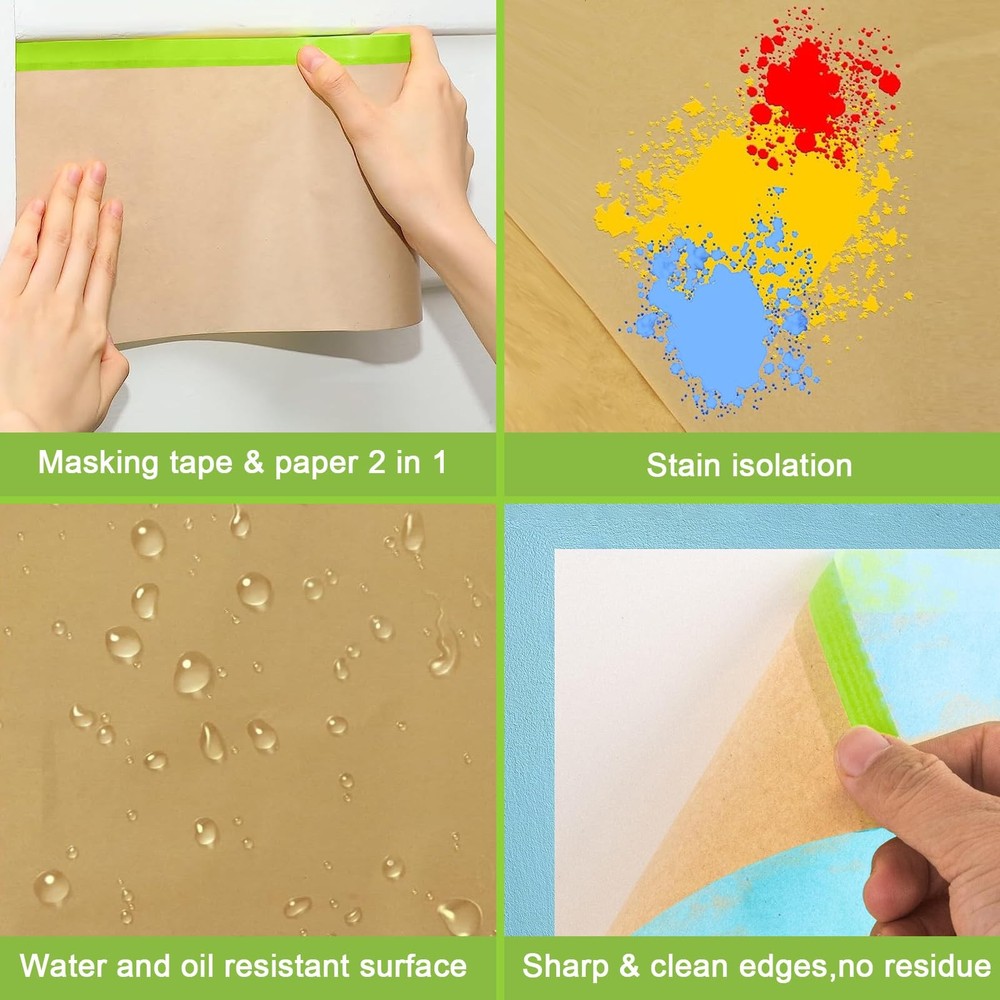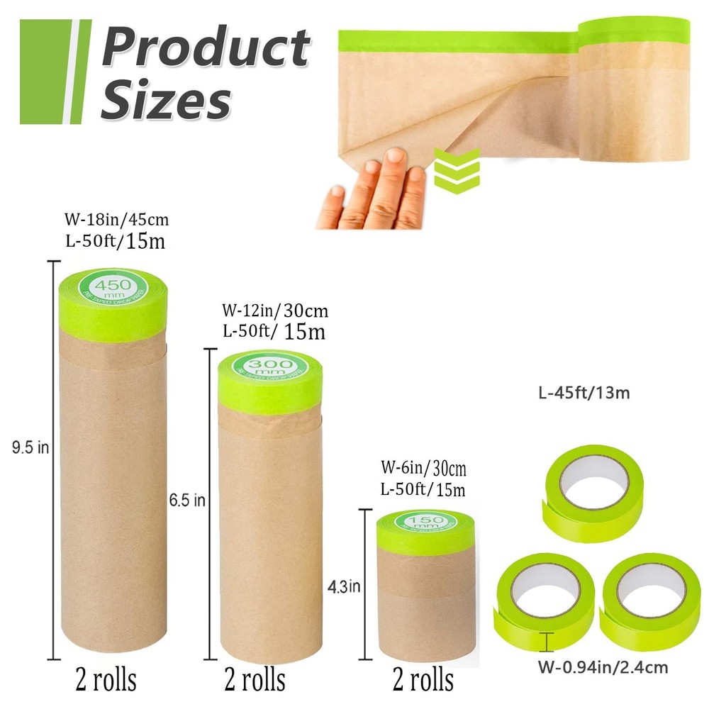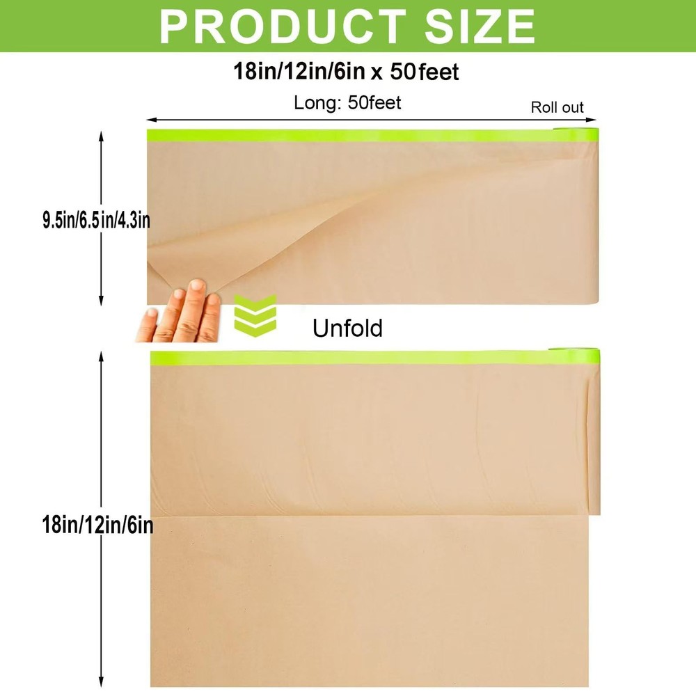 Masking paper made of premium paper and tape, with premium waterproof and dustproof effect, masking paper equipped with high-viscosity masking tape, has a better performance in home decorating and automotive painting.masking paper suitable for many scenarios, including spraying, workshop paint work, home painting and decoration. automotive paint tape is strong and stable, leaves no residue after removal Pre-taped masking paper mainly use for masking and dust protection. For example: protect household appliances and furniture from dust and pigment during house decoration, car automotive painting, wall painting and so on... Very popular among pro painters and DIYers Package include 6 rolls multi size masking paper, width is 6inch/15cm, 12inch/ 30cm and 18inch/45cm, each size two roll, length all 50 Ft, total 150ft long. can meet your various requirements 【Product Size Description】Masking paper sizes: 18in. x 50 ft. x 2 rolls, 12in. x 50ft. x 2 rolls, and 6 in. x 50 ft. x 2 rolls; masking tape size: 0.94 in. x 50 ft. x 3 rolls. 【Masking Tape & Paper 2 in 1】 Using masking paper with adhesive is the easiest way to save painting time.This pretaped masking paper features with premium masking paper and painter tape together, cover and secure with one action, quick and easy protection for most surfaces. 【Powerful Anti-penetration Function】Our pre-taped painter paper is made of high-quality kraft paper that is waterproof and oil-repellent , it resists tearing and high penetration resistance, it can effectively protect the surface of the object. 【Strong Adhesive & Clean Removal】 The waterproof masking tape used in this pre taped protective paper can be removed cleanly and easily up to 30 days, leaving super sharp lines, no bleed, without sticky residue. 【Suitable for Most Area and Surfaces】Our adhesive masking paper use for any are and surface, including:car,window,trims,doors,floor protection from paint spill,over-spray and spatter, Also used as auto body masking paper for automotive aftermarket during auto car repair and spray painting operations. 【Easy to Use】 Our paint masking paper is super easy to apply, you just need to unroll the paper roll and stick the sticky side firmly on right position,then cut it with scissors or tear it by hand, the painters paper roll will cover the protected object evenly.