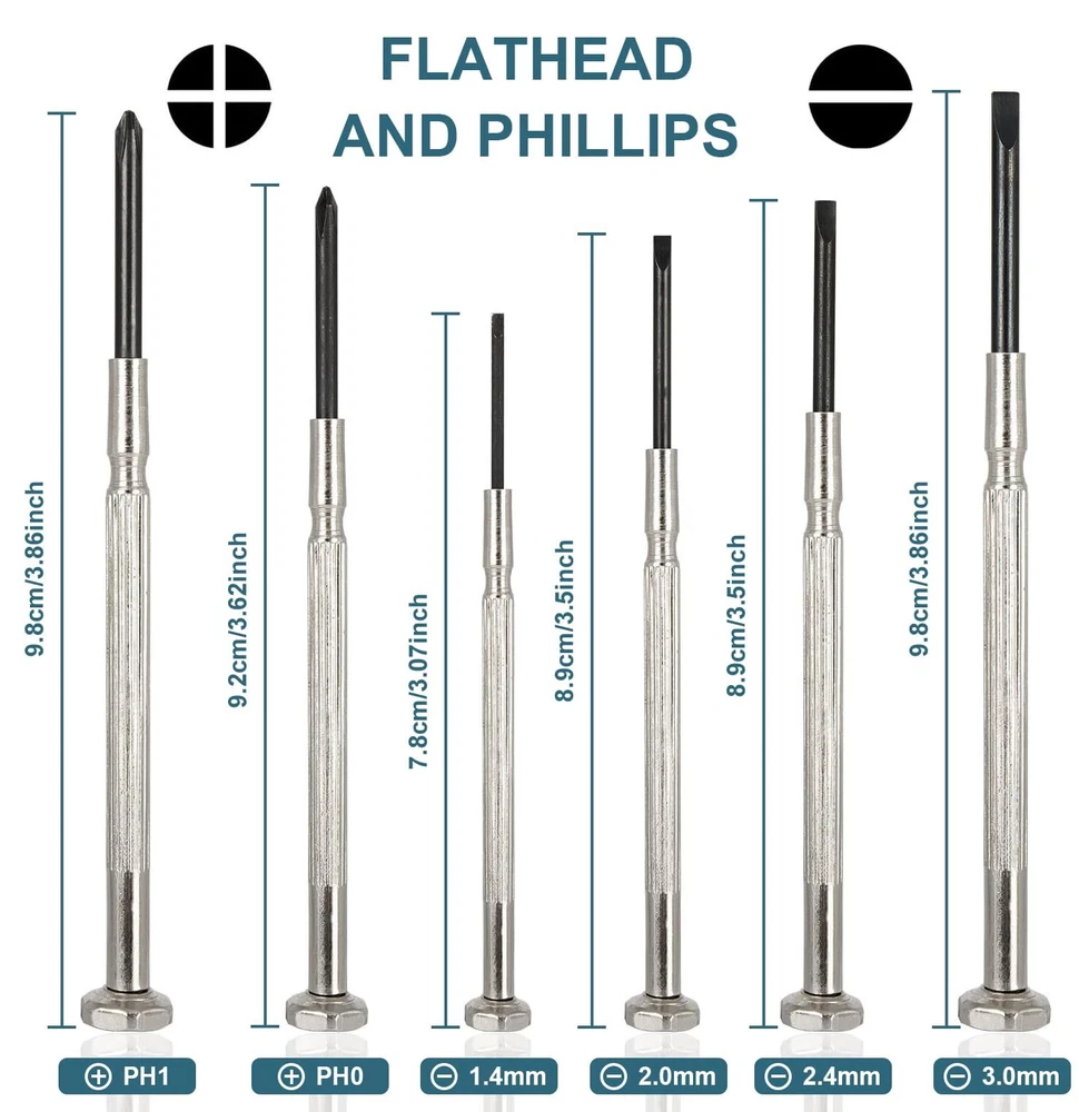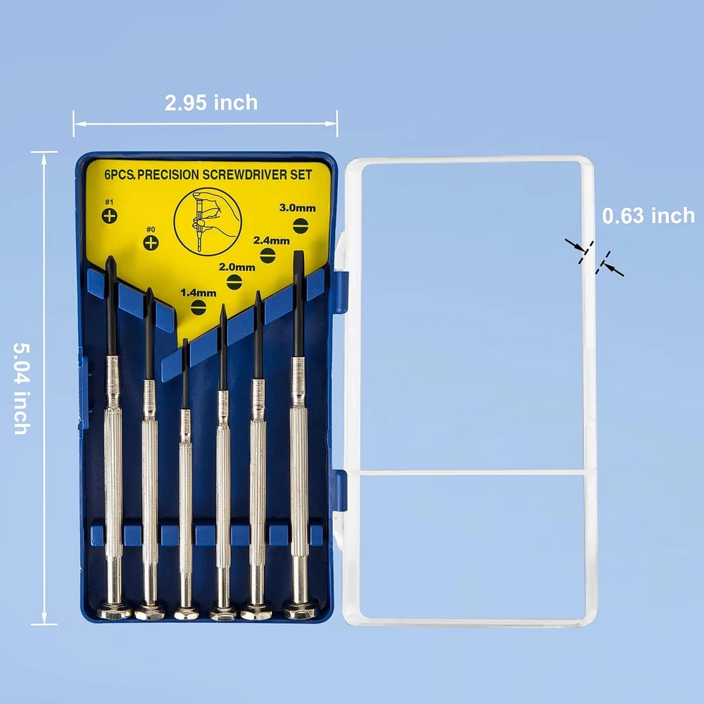 In daily life, do you always need a set of screwdriver that is easy to carry and use, for maintaining some small equipment, such as glasses, watches, jewelry and other small electronic products? has such a screwdriver set, comfortable to use, rust resistant and durable. It is the best choice for your daily use. You can also buy it as a present for your friends and family. They're gonna love it. Mini Screwdriver Set Product Description: Product material: chromium vanadium steel. Package size: 5.04 inches * 2.95 inches * 0.63 inches. Set includes: 2 screwdriver sizes (0 and 1), 4 flat-head screwdrivers sizes (1.4mm, 2.0mm, 2.4mm, 3.0mm). Tip: Keep the screw drivers tool set out of reach of children. The precision screwdriver set is made of high strength steel with black oxide. Durable and corrosion resistant. Rotary design: The rotary end cap design makes it very easy to remove or secure screws. A wide range of applications: suitable for glasses, laptops, tablets, smart phones and other small digital equipment maintenance. 6 Different Sizes: Our mini screwdrivers include 2 screwdriver sizes (0 and 1) and 4 flat head screwdriver sizes (1.4 mm, 2.0 mm, 2.4 mm, 3.0 mm). Six sizes make it easy to handle your daily needs Rotating Tail: This miniature precision screwdriver set has a rotating tail, and the rotatable design makes the jewel screwdriver set effortless to use and easy to handle for maintenance High Quality Material: The small screwdriver set is made of high quality chrome vanadium steel material with an open surface blackened, effectively improving its corrosion resistance, rust prevention and durability Convenient to Carry: The eyeglass repair kit comes with a plastic storage case to help you clearly distinguish between the different sizes of screwdrivers. Easy to store and grab, it's a must-have gadget for on-the-go use Wide Range of Uses: The mini screwdriver is suitable for the maintenance and repair of alarm clocks, watches, glasses, and a variety of precision devices, and it accommodates a variety of daily needs, making it the perfect choice for you