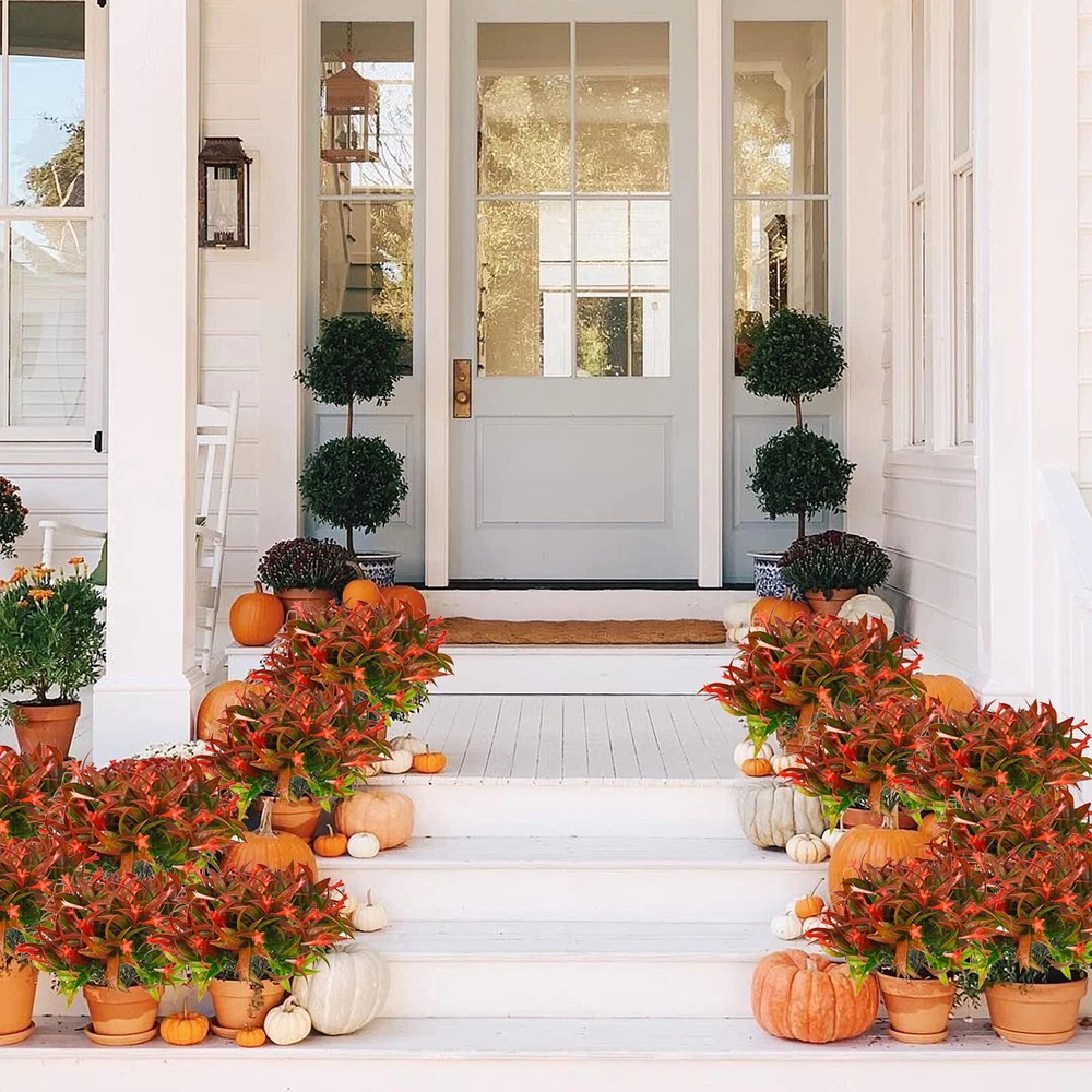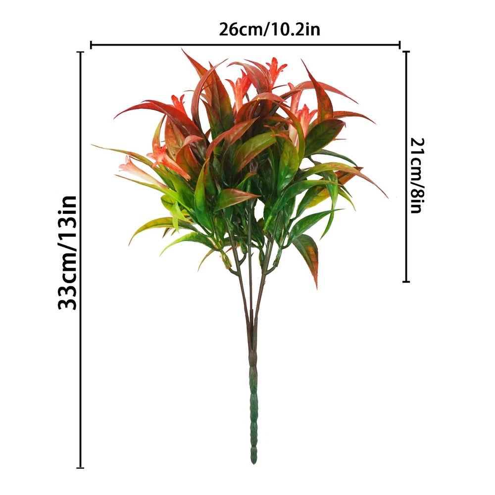 Size and Package:13.4"H x 8.7’’W. One package includes 6 bundles of outdoor faux plants. 6 bunches can filler a 8" pot, that looks very full and thick. 12 bunches can be "planted" in 2 of 8" pots. They were also nice accent pieces, will perfect to arrange around smaller flowers or large plants Easy to "Plant":The artificial flowers for outdoors can be easily organized and fixed on vase, wall pots, wood boxes, outdoor containers, hanging pots and fences. If the size is too big for you, you can trim them to the size you want with scissors or pliers UV Resistant Artificial Outdoor Plants:These outdoor fake plants are made of high quality plastic, uv protection, weather proof. it's sturdy, attactive, and don't worry keep it live.“Plant” these fake plants outdoor on kitchen, yards, kitchen, balcony, window boxes, front porch, fence, patio, entrey way and yard. the uv fake outdoor plants can hold up themselves nicely in the sun, rain or wind Look Real & Care Free:Dusts accumulated from long-term use can be washed away with water, If you place them outdoor, the rain will do the job for you Warm Tips:The fake outdoor plants are packed tightly for shipping, Please stretch out the sprigs to get the best looking of the fake greeenry shrubs. if you worry they will fade in the sun, so just hit them with a coat of outdoor UV spray once a week or so and you have pretty, fuss-free flowers all seasons