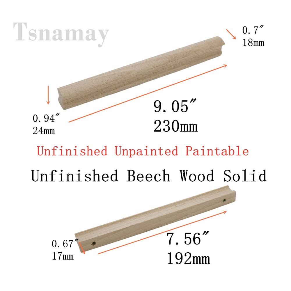 Hole diameter:7.56"/192mm; 9.05"x0.7"x0.94"/230x18x24mm(LWH); Base 0.67"/17mm,screw M4x24mm Beech Wood:The original ecological wood,smooth and burr-free.Unpainted and unwaxed, color freely Beech wood reddish, with strong impact resistance, uniform texture, soft tone, suitable for middle and high-end furniture, handicrafts The simple and timeless look works for cabinet, drawer, wardrobe and dresser; Greet for kitchen, bedroom, bathroom and even the office Package Includes:6pcs x Drawer Pull + *24mm Screws