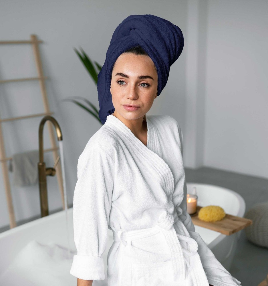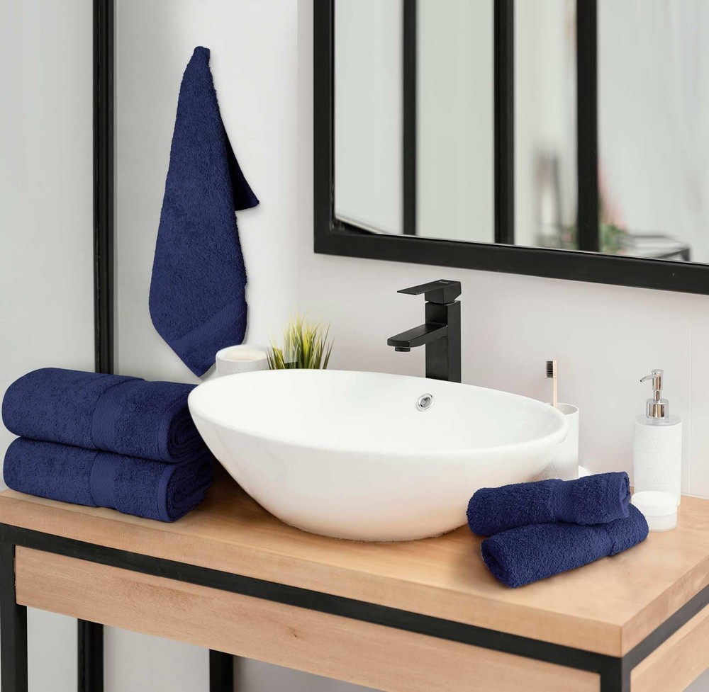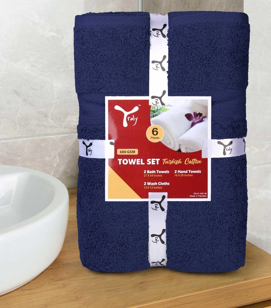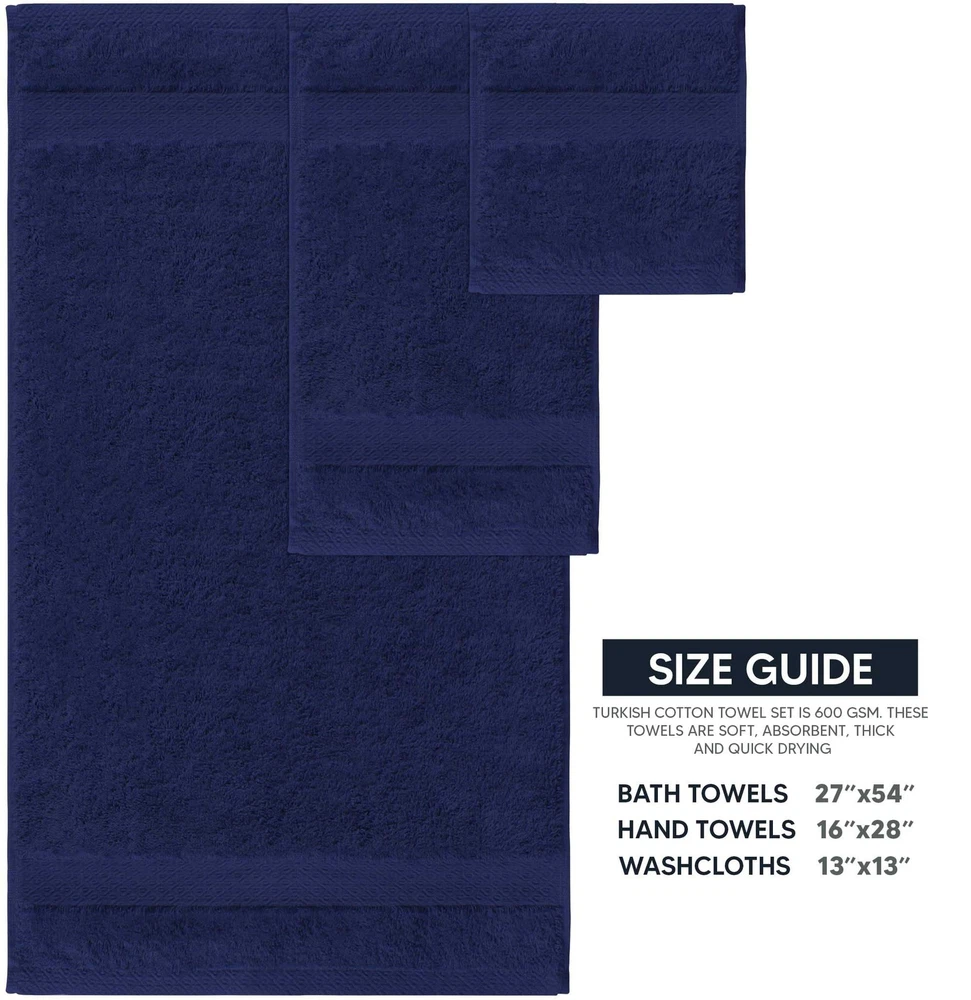 Experience the epitome of bathtime bliss with our plush 6-piece Navy Blue Turkish cotton towel set. Crafted from 100% premium Turkish cotton, these towels boast exceptional absorbency, softness, and durability. Immerse yourself in the luxurious comfort reminiscent of a high-end spa, right in your own bathroom. Set Includes: 2 Bath Towels (27" x 54") 2 Hand Towels (16" x 28") 2 Washcloths (13" x 13") Plush Turkish Cotton: Made with 100% absorbent Turkish cotton, these towels offer absorbency, softness and durability, perfect for pampering yourself after a relaxing bath or shower. Hotel-Quality Indulgence: Experience the luxurious softness and absorbency of these cotton towels, replicating the feeling of a five-star spa in your own bathroom. Complete Spa Set: This 6-piece set includes 2 bath towels (27" x 54"), 2 hand towels (16" x 28"), and 2 washcloths (13" x 13") for all your drying needs. Elegant Touches: Available in a variety of beautiful colors to add a touch of luxury and elevate your bathroom décor. Easy Care for Longevity: Wash towels in cold water with gentle detergent, tumble dry low. Remove makeup promptly to prevent stains.
