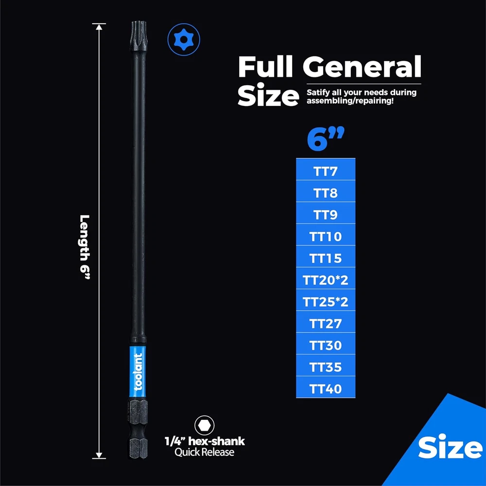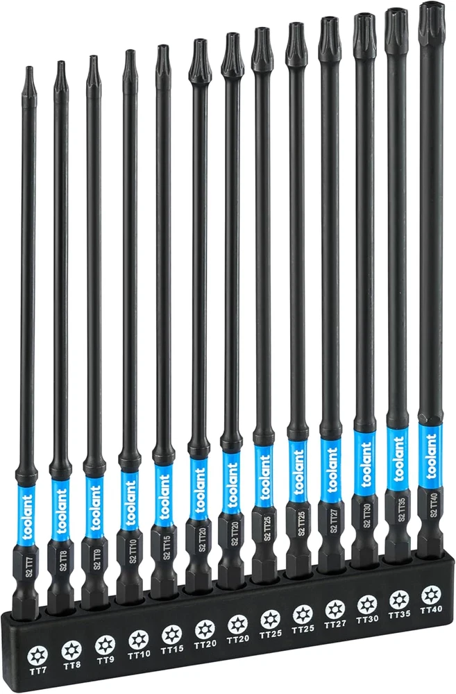 toolant impact security torx bit set 13pcs. Torsion zone to absorb torque peaks to avoid breakage. 10 times life expectancy versus standard bits. For impact driver, drill and screwdriver. 13pcs tamper proof torx bits-tt7, tt8, tt9, tt10, tt15, tt20*2, tt25*2, tt27, tt30, tt35, tt40-1/4” quick release hex-shank, 6” long. CNC machined tips, S2 alloy steel body, hardened core to increase bit strength and reduce fracture. Manganese Phosphate surface to prevent rust. Strengthened magnetic impact torx bits helps you easy pick up screws. The magnetism doesn’t decay after multiple uses. Widely used in home repairs, automobiles, woodworking and other screw driving applications. All day after-sale service. Thanks for choosing toolant. Product Description toolant Impact Torx Bit Set Features S2 Alloy Steel Industrial heat-treated high quality steel body to ensure durability CNC Machined Magnetic Tip CNC manufactured precision-engineered magnetic tips reduces breakage and cam-out Torsion Zone Absorbs high torque of impact driver to avoid fracture when heavy screw driving,10X lifetime over standard bit Phosphating Surface Rust-proof treatment to ensure good condition even in humid environment SAFETY TORX BIT LONGER FOR WIDER APPLICATION 1 MOTORCYCLE 2 MACHINE 3 CHAIR toolant Impact Bit Set Add to Cart Add to Cart Add to Cart Add to Cart Add to Cart Customer Reviews 4.6 out of 5 stars 3,316 4.7 out of 5 stars 5,568 4.5 out of 5 stars 633 4.6 out of 5 stars 173 4.6 out of 5 stars 237 Price $13.99 $ 13 . 99 $12.99 $ 12 . 99 $11.99 $ 11 . 99 $20.99 $ 20 . 99 $39.99 $ 39 . 99 Material S2 Alloy steel S2 Alloy steel S2 Alloy steel S2 Alloy steel S2 Alloy steel Impact resistance √ √ √ √ √ Drive System torx hex philips impact bit set torx Magnetism √ √ √ √ × Number of Pieces 27 20 11 52 8 Size T7-T40 Metric:1.5-8mm SAE:5/64”-5/16” ph2 1",2",4"&6" 1"&3.5" T30-T70