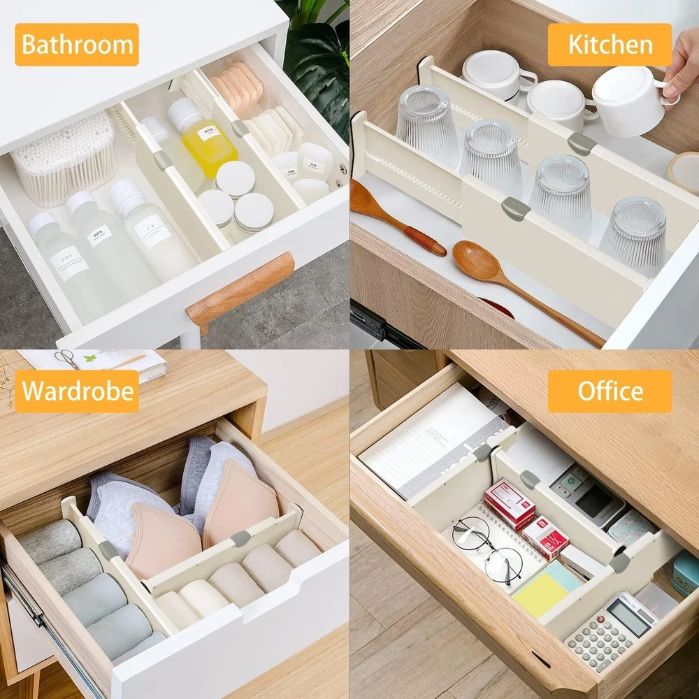 Finally got my drawers organized! These dividers slide perfectly and click into place without any tools. They fit my kitchen and bathroom drawers exactly, keeping everything neat and accessible. Love how versatile they are!