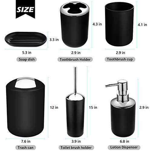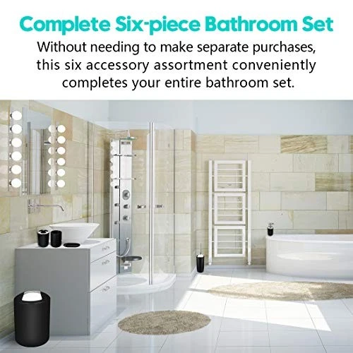 Return Policy Fast Delivery Trusted seller 6-Piece Bathroom Accessories Set, Toothbrush Holder with Cup, Soap Dispenser & Dish, Toilet Brush, Trash Can, Tumbler Set (Black) Product Description Set Includes :1 Soap Dispenser, 1 Toothbrush Holder, 1 Toothbrush Cup, 1 Soap Dish, 1 Toilet Brush Holder,1 Trash Can Elegant Design : take your bathroom decor to stylish new heights with this bathroom accessories set, very stunning and a great touch of extra elegance to the bathrooms, perfect for giving as a gift for housewarming or a wedding Fully Functional Completed Set : A completed bathroom accessory set which equips everything you will need to organize your toiletries. Toothbrush holder features 3 - holed openings, 2 small ones allow you to keep your toothbrushes and 1 larger hole to place slim toothpaste, making brushing teeth in one grab Durable And Amazing Quality : This 6-Piece Bathroom Accessory Set is made of durable plastic that can outlast competing products. It’s also ideal for kids' bath for its durability and not easy to break like ceramic set. Our high quality plastic bath accessories will resist to constant use, keeping their look just as elegant and new over time Premium Quality Liquid Soap Dispenser Pump : We know how frustrating it can be to use a flimsy pump that leaks or just does not work. No matter how your bathroom set looks like, a bad pump can ruin the experience. That’s why we included a hard plastic pump for the liquid soap dispenser in this set Shipping Returns Payment Shipping Shipping is FREE to all addresses other than APO/PO boxes in the lower 48 states. All our stock ships from US-based warehouses. Shipped via USPS or UPS (depending on location and package weight) Unless stated otherwise, all orders will ship within 24-72 hours of your payment being processed. Check our feedback to see the great reviews of FAST shipping we offer. Returns Seller does not accept returns Payment We currently accept payment via eBay managed payments only. Once payment is cleared, we will dispatch your shipment within 1-3 business days. Please refer to the "Shipping" tab for more information regarding shipping speed to your destination.