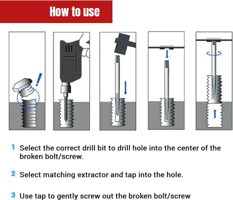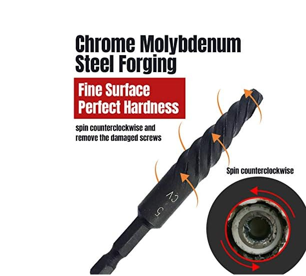 Juego de 6 Extractores de Tornillos Rotos Herramienta para Quitar Pernos Dañados MATERIAL: Fabricado en acero al cromo molibdeno, con bordes afilados que cortan fácilmente tornillos y tuercas atascados. TAMAÑO: Incluye 6 herramientas, 1 mandril de cambio rápido de 1/4 de pulgada y 5 extractores: N.° 1: 1/8”-1/4” (M3-M6), N.° 2: 1/4”-5/16” (M6-M8), N.° 3: 5/16”-7/16” (M8-M11), N.° 4: 7/16”-9/16” (M11-M14), N.° 5: 9/16”-3/4” (M14-M18). DISEÑO: La hélice de acción rápida facilita la extracción de tornillos. El vástago hexagonal de 1/4 de pulgada se adapta a todas las herramientas eléctricas con mayor facilidad y seguridad, especialmente para bloquearse en el mandril de cambio rápido. Extractor de tornillos pequeño. APLICACIÓN: Esta es una herramienta profesional para extraer tornillos. El extractor extrae rápida y eficazmente tornillos y tuercas dañados, desgastados, oxidados y rotos de superficies metálicas con relativa facilidad. Le proporcionará mayor comodidad en su trabajo diario, como reparaciones de automóviles, decoración del hogar, artesanías, etc. Fácil de extraer y útil para extraer roscas desgastadas. EMBALAJE: En un blíster resistente y elegante. Se recomienda usar un sistema de rotación manual eléctrico, girando a baja velocidad hasta extraer el tornillo roto.