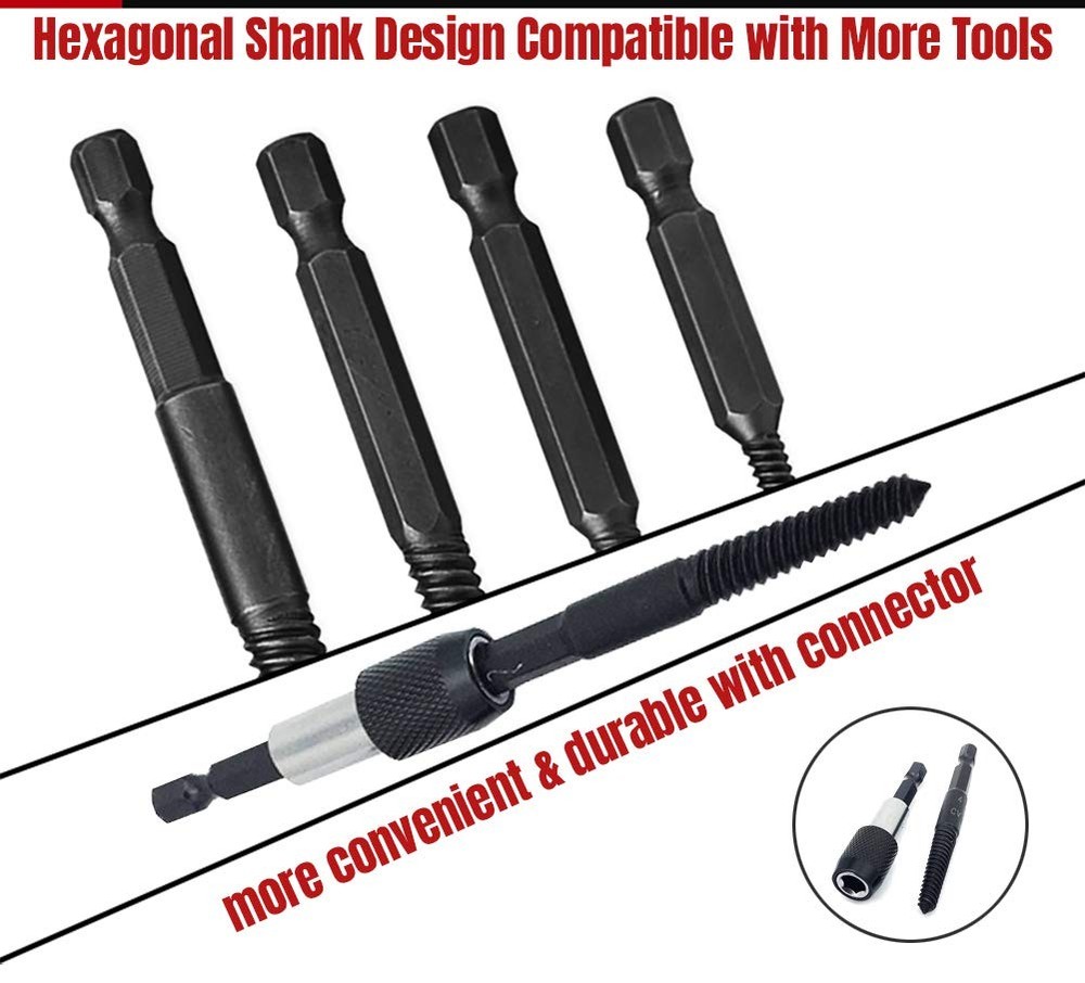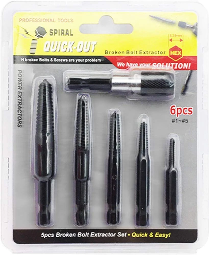 6pcs Damaged Screw Extractor set, Broken Bolt Extractor Set with 1/4 Quick Change Arbors Tool Kit Fine Thread Bad Screw Stud Remover for stripped Screws nuts & Bolts MATERIAL: Manufactured from chrome molybdenum steel, with sharp cutting edges that easily bit into seized screws & nuts SIZE: Includes 6 tools, 1 PC 1/4 inch quick change arbors and 5 PC extractors: #1. 1/8”-1/4 “(M3-M6), #2. 1/4”-5/16” (M6-M8), #3. 5/16”-7/16” (M8-M11), #4. 7/16”-9/16” (M11-M14), #5. 9/16”-3/4” (M14-M18) DESIGN: Rapid acting helix aids screw removal, 1/4 inch hex shank fits into all power tools more easily and securely, specially for locking into quick change chuck APPLICATION: Remover quickly and effectively extracts damaged screws and nuts,stripped, rusted, broken from metal surface with relative ease. It will provide your daily work more convenience in car repair, home decoration, for craft production etc PACKAGE: PACKAGE: Beautiful and strong blister packing.It is recommended to use electric manual rotation during use, rotating at low speed until the broken screw is removed.