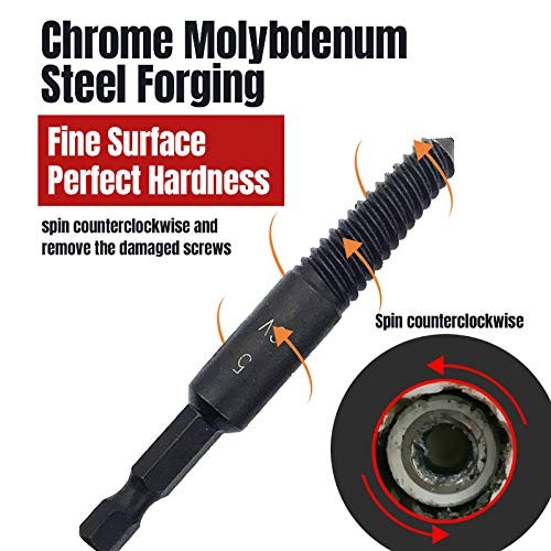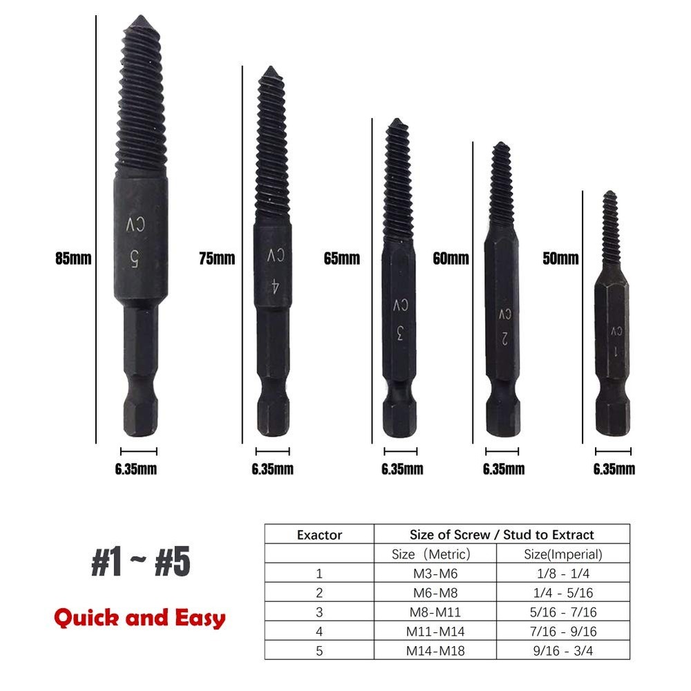 This screw extractor set is a lifesaver for stripped or damaged bolts! The chrome molybdenum steel construction makes it super durable, and the sharp cutting edges grip stubborn screws effortlessly. The quick-change arbor and five different sizes cover a wide range, making it versatile for any job. The helix design bites in fast, saving so much time and frustration. Perfect for DIYers and pros alike—highly recommend!