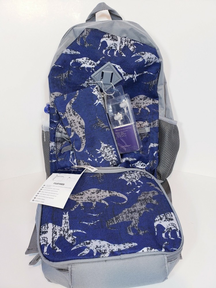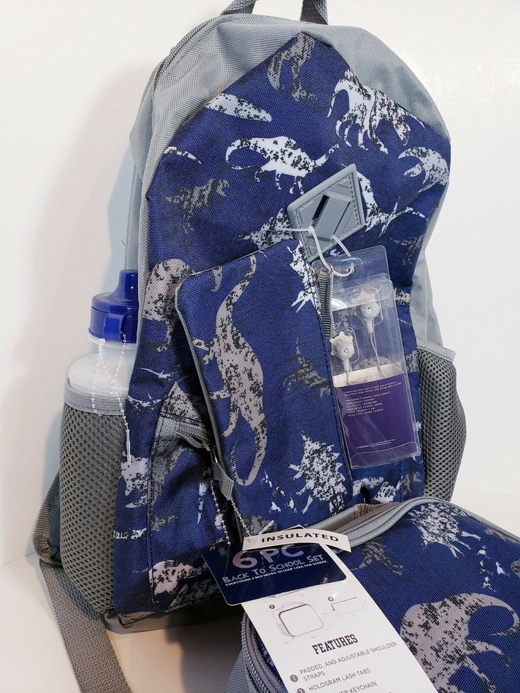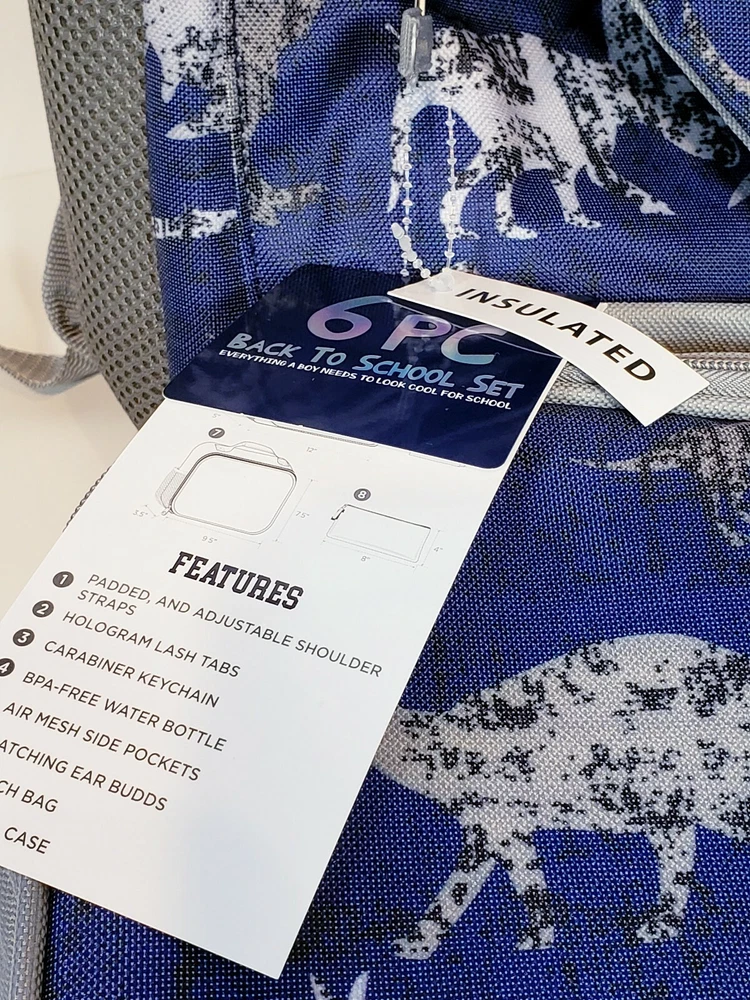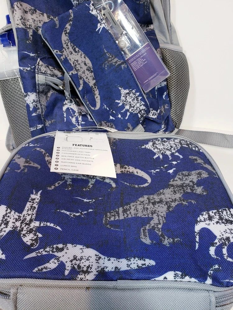 Love2design 6 Piece School Backpack Set Dinosaurs lunch bag ear buds. Features included Backpack padded and Adjustable shouldrr straps/ hologram lash tabs/ carabiner Keychain/ bpa free water bottle/ air mesh side pockets/ matching ear budds/ lunch bag and pencle case brand new .