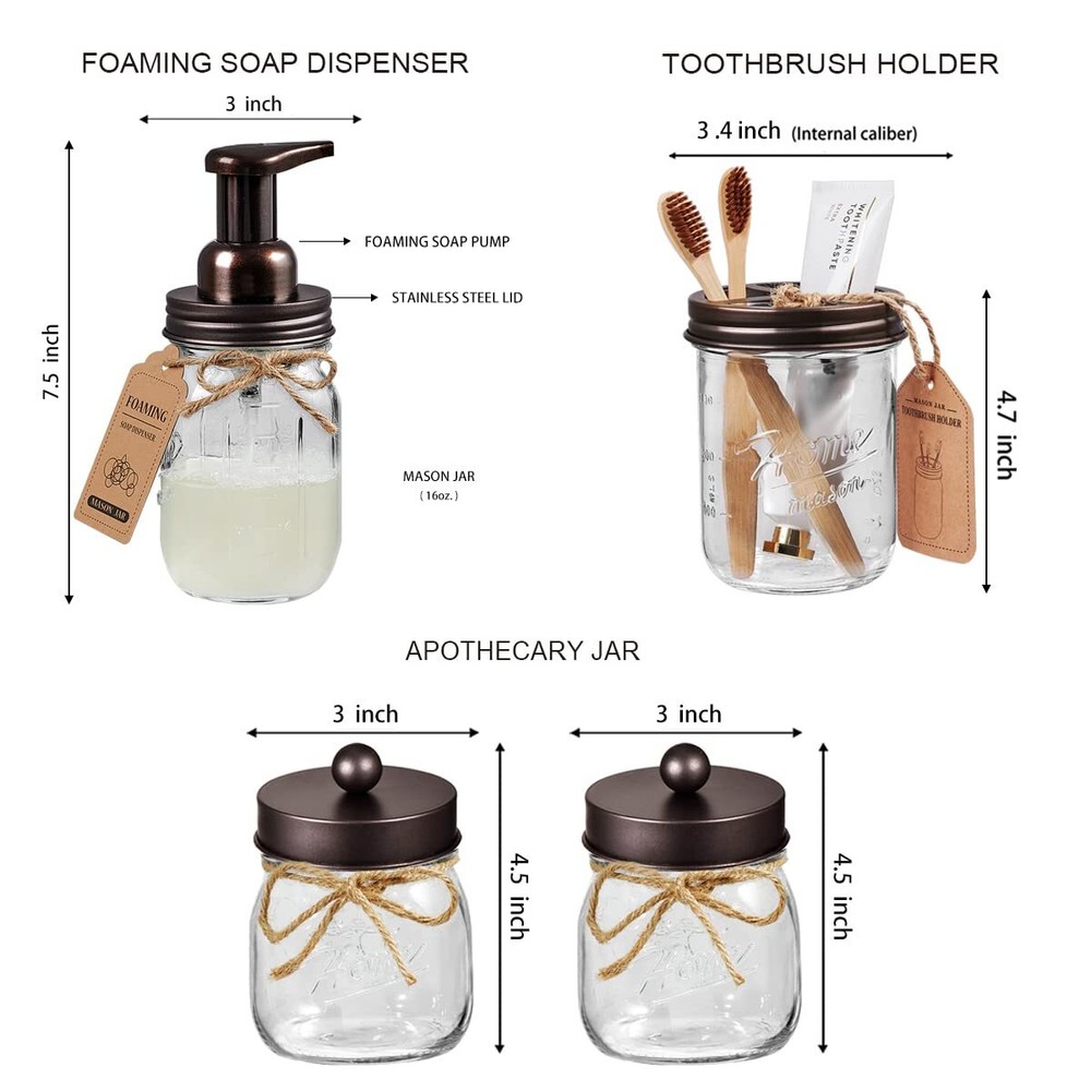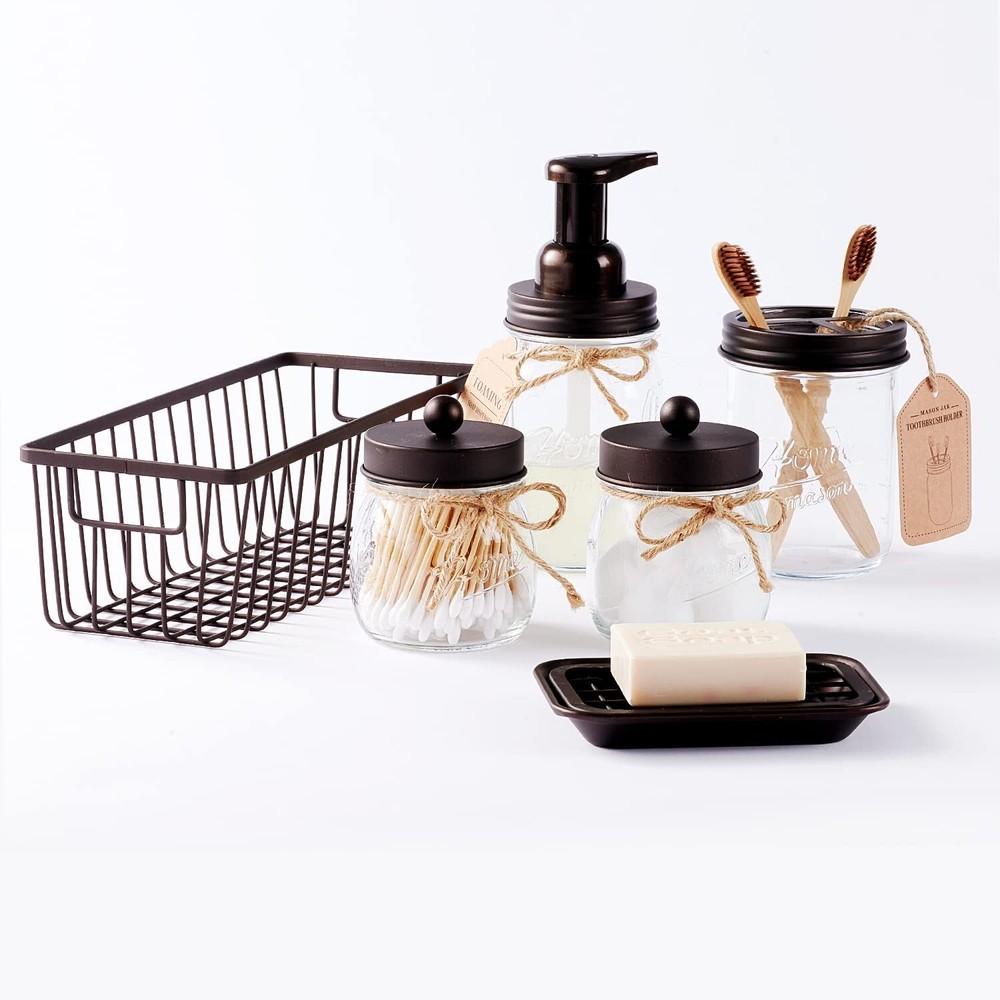 SheeChung 6Pack Mason Jar Bathroom Accessories Set - Foaming Soap Dispenser, Toothbrush Holder, 2Pack Qtip Holders, Bathroom Sink Set, Guest Towel Holder- Bronze Farmhouse Bathroom Accessories: Elevate your bathroom decor with this rustic mason jar bathroom set. Designed to match various bathroom decor styles. this set includes: 1 foaming soap dispenser (with 1 replaceable pump head), 2 mason jar cotton swab holders, 1 soap dish with a metal wire holder, 1 wire basket for guest hand towel storage, designer waterproof stickers for added charm. Foaming Soap Dispenser & Toothbrush Holder: This 16oz foaming hand soap dispenser creates luxurious foam with a single push. Its easy-to-use, press-to-dispense pump head makes it simple to refill. Works with any foaming soap or by mixing liquid soap with water for customized foam. The toothbrush holder fits both standard and electric toothbrushes, razors, and toothpaste, helping to keep your bathroom neat and organized. Qtip Holders & Soap Dish: The set includes 2 mason jar holders, perfect for organizing cotton balls, pads, swabs, or floss picks. The NO-screw lid design provides quick and easy access to your bathroom essentials. The soap dish, paired with a metal wire frame, allows for proper drainage, keeping soap dry and prevent moisture buildup, while adding a stylish touch to your bathroom. Metal Wire Basket: This versatile metal wire basket is ideal for organizing and saving space in your bathroom. Its open-wire design allows easy access to mason jars, guest hand towels, and other bathroom accessories. It also works well in the kitchen or pantry for storing snacks, fruits, vegetables (onions, potatoes), pasta, canned goods. With excellent weight-bearing capacity, it's durable enough for everyday use. Gifts Idea: Made from eco-friendly glass and brushed stainless steel, these reusable and recyclable mason jars are built for long-lasting durability. This farmhouse bathroom set makes a thoughtful gift for housewarmings, weddings, birthdays, or special occasions. Ideal for friends, relatives, colleagues, and loved ones, it adds a touch of rustic charm to any bathroom or home. SHIPPING Domestic Buyers - We have confidence in our products, but if you are not fully satisfied please contact us within 30 days of purchase and you will get full refund. - We ship within 3 business days of payment, usually sooner - We offer FREE shipping on all orders! - We only ship to the lower 48 states, no APO/FPO addresses or PO Boxes allowed International buyers – please note: Import duties, taxes, and charges aren't included in the item price or postage cost. These charges are the buyer's responsibility. - Please check with your country's customs office to determine what these additional costs will be prior to bidding or buying. * Order Cancellation Policy ** You can return a product for up to 30 days from the date you purchased it. 1. The seller reserves the right to cancel the special case only due to eBay cancellation fee. 2. The decision of seller is the final. 3. The seller will respond to the cancellation request within 2 business days. Please wait for the result of cancellation. 4. In case the cancellation is not completed by some reasons, the buyer can follow the options below to get the refund. 4.1 The buyer can reject the item when it arrives. 4.2 The buyer can send the item back to the seller within 30 days If the buyer receives item (USA Shipment ONLY). The seller will provide the FREE return label to the buyer when the buyer opens " Return Item" case on eBay by using the reason as "Change my mind" ONLY. 5. When buyer has placed the order. The order will be processed and completed by automatic warehouse system within 5 minutes. In case that buyer sends the cancellation request after 5 minutes of placing the order, the request will be rejected. **Sending direct message to cancel the order is not allowed for every case.* Return Policy For the return case - If buyer would like to return the items for refund or replacement, please CONTACT SELLER to receive the free return label from seller. The refund or replacement will be processed with the tracking number of return label which is provided by seller only. The other ways of return which are not approved by seller will not be processed for the refund or replacement.