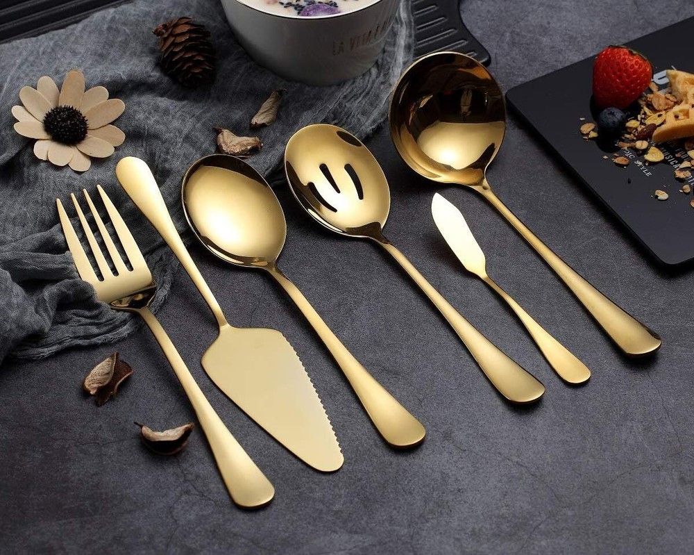 6-Piece Gold Serving Flatware Silverware Set,Stainless Steel Serving Utensil ... 【6-Piece Gold Serving Set】Include 1 Cake Server, 1 Slotted Serving Spoon, 1 Serving Spoon, 1 Cold Meat Fork, 1 Butter knife, 1 Soup Ladle 【Titanium Gold Noble Color】Stylish atmospheric flatware set, Let your tableware stand out,Let you eat with your family and friends,Have a wonderful meal. 【Quality Guarantee】Made of High Quality Stainless Steel, the edges are smooth and stylish, Mirror Polish, Rust proof, High hardness, Lead-free, Cadmium-free, Phthalate-free, BPA-free durable and Eco-Friendly. 【Best Gift】Perfect Ideal for Weddings,Valentine's Day,Catered events,party,Family reunion,Upscale catering,Theme restaurant, or home dinner, Perfect Gift for Wedding Housewarming Birthday Mother's Day Restaurant, or home dinner, and much more. 【Eco-friendly & Easy to Clean】This is a reusable environmentally-friendly ! Shipping We offer FREE shipping on all orders! We ship within Three business days of payment, usually sooner. We use a selection of shipping services such as UPS, FedEx, USPS etc. We only ship to the lower 48 states, no APO/FPO addresses or PO Boxes allowed. Local pickups and combined shipping options are not provided at this time. Return You can return a product for up to 30 days from the date you purchased it. Any product you return must be in the same condition you received it and in the original packaging. Please keep the receipt. Customer satisfaction is very important to us. If you have any problem with your order, please contact us and we will do our best to make you satisfied. Contact Us If you have any queries, please contact us via ebay. We usually respond within 24 hours on weekdays. Please visit our eBay store to check out other items for sale! Thank you for shopping at our store.