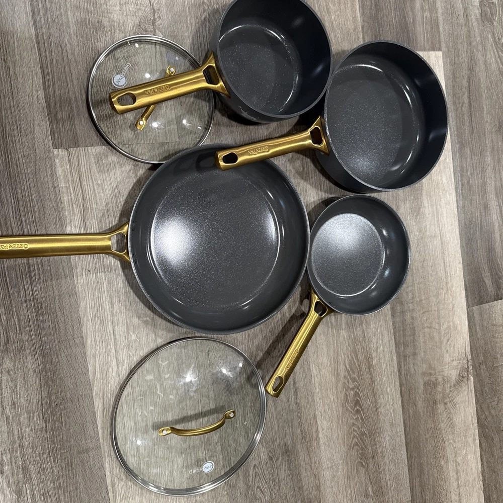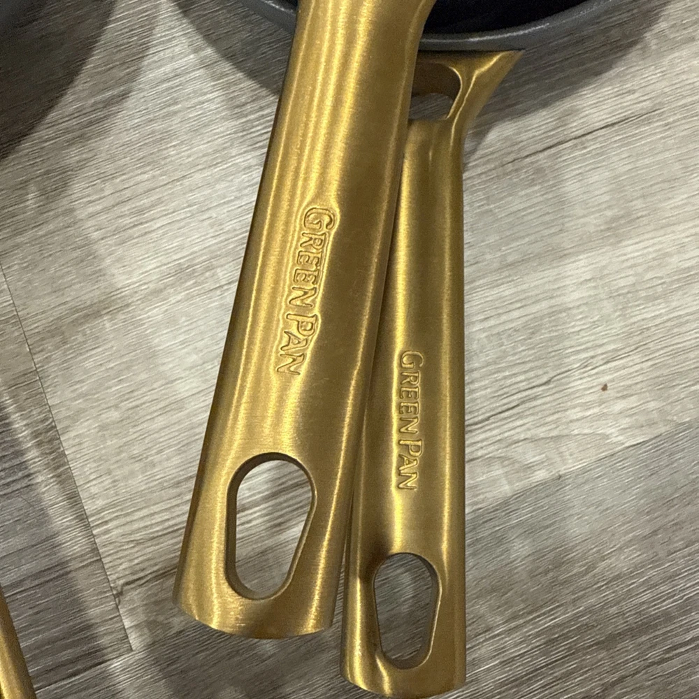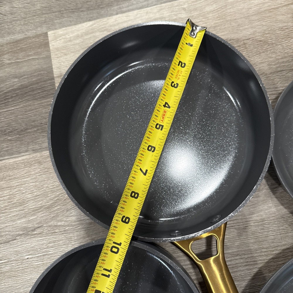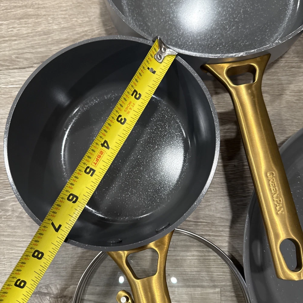 This 6-piece set of nonstick frying pans by GreenPan is perfect for any kitchen. With a sleek navy black and gold design, these round pans are compatible with induction, electric, gas, and ceramic stoves. Featuring a long handle, flat-bottomed design, and easy-clean surface, these pans are perfect for everyday cooking. The non-stick coating ensures easy food release and clean-up, while the dishwasher-safe feature makes for convenient maintenance. Upgrade your cooking experience with this versatile and high-quality set of frying pans. Insure if they been used or not so I marked as used Look at the pictures before making your purchase