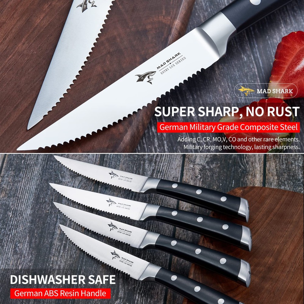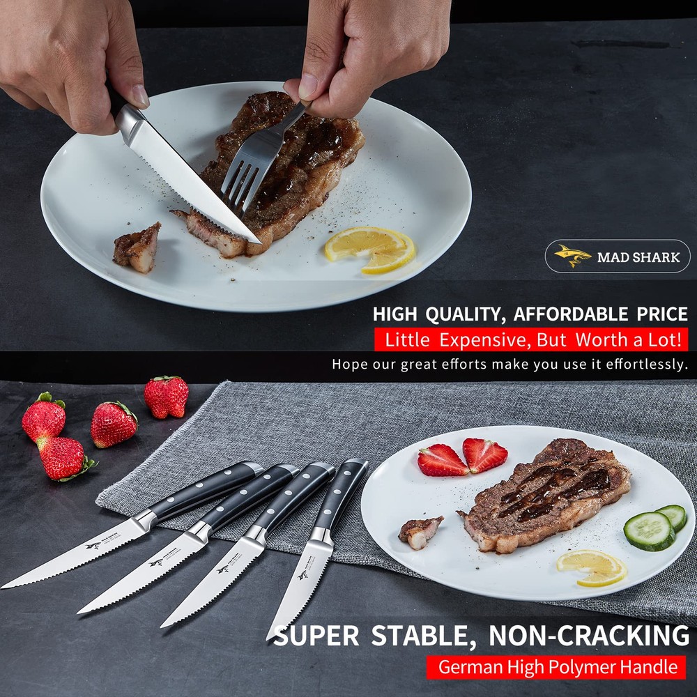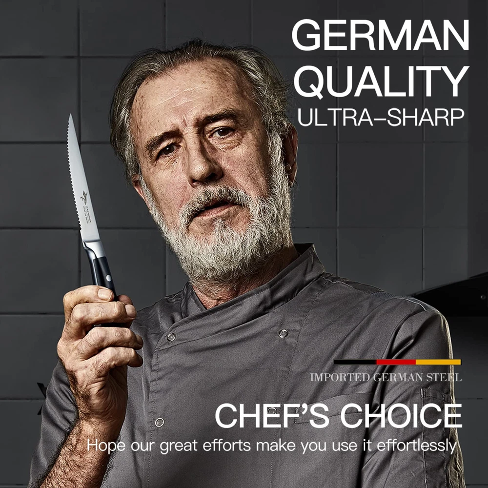 【Ultra-Sharp Blade】-- High-quality 6 pieces steak knives with micro-serrated edges that is ultimate sharpness, each serration point on this steak knife set is carefully spaced to maximize edge longevity against hard surfaces like ceramic plates yet provide a buttery smooth cut, peak performance has never looked so good at this price. 【Premium High Carbon German Steel】-- Cutting-edge technology, outstanding craftsmanship, stunning unique design, premium German HC stainless steel enables steak knife wear-resistant, durable, rust and stain resistant. 【A Multi-Purpose Kitchen Decor Must】-- Serrated edge blade design, allowing a smooth slice of steaks and other foods without tears and ridges. The upward curved tip is designed to assist in separating meat from the bone easily, it can also be used as utility knife, table knife and dinner knife. 【Ergonomically Handle】-- The durability and reliability of the steak knife are secured by the triple rivet design that attaches the handle firmly onto the blade. The ergonomic shape enables the right balance between the handle and the thin blade, ensuring ease of movement. 【Perfect as Gift】- The steak knives comes in a high-quality black utility gift box, making it the perfect gift for your family, lovers or friends who enjoy cooking, such as New Year, Birthday, etc, This is a great gift ideas