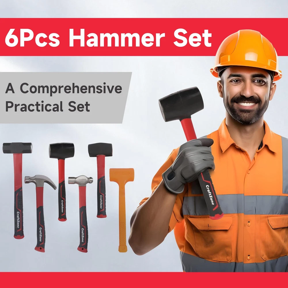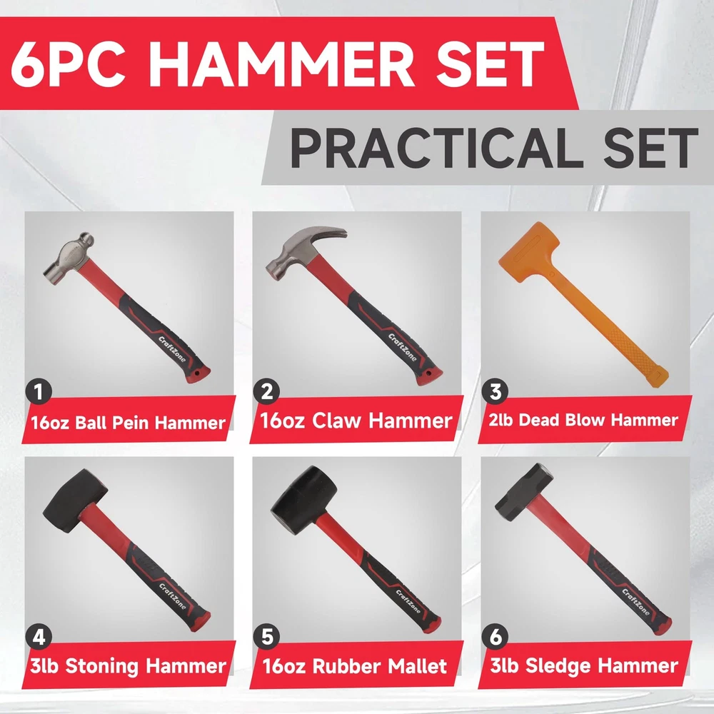 Complete Hammer Set: This 6-piece hammer set includes essential hammers for all your DIY and home repair needs: 2lb Dead Blow Hammer, 3lb Sledge Hammer, 3lb Stoning Hammer, 16oz Ball Pein Hammer, 16oz Claw Hammer, and 16oz Rubber Mallet. Professional-Grade Dead-Blow Hammer Design : Crafted with forged carbon steel, this 2lb dead-blow hammer is capable of absorbing 100% rebound force, making it ideal for automotive repairs, machinery assembly, and delicate surface tasks. The antivibe hammer set design minimizes hand fatigue while maintaining precision impact control. Heavy-Duty Forging Hammer Construction : Engineered as a professional-grade forging hammer, our tool features triple-tempered carbon steel capable of enduring 10,000+ impact cycles. The mechanic hammer design ensures superior force transmission for metal shaping, stonework, and demolition projects. Multi-Purpose Ball Peen Hammer System : This ball peen hammer set is used for professional metalworking applications, featuring dual polished faces for flawless riveting and surface finishing. The optimized weight distribution makes it a perfect companion for jewelry making and industrial forging tasks. Anti-Slip Rubber Mallet Solution : The 16oz rubber mallet hammer causes zero surface marring on wood, glass, or automotive parts. Specially formulated non-marking rubber head is used for furniture assembly, tile installation, and precision alignment tasks with vibration-dampening control. Ergonomic Antivibe Hammer Technology : Featuring our patented Antivibe hammer set system with shock-absorbing fiberglass core, this dead-blow hammer reduces 70% vibration transmission. The textured grip is capable of maintaining secure handling in oily conditions, making it a mechanics' essential tool.