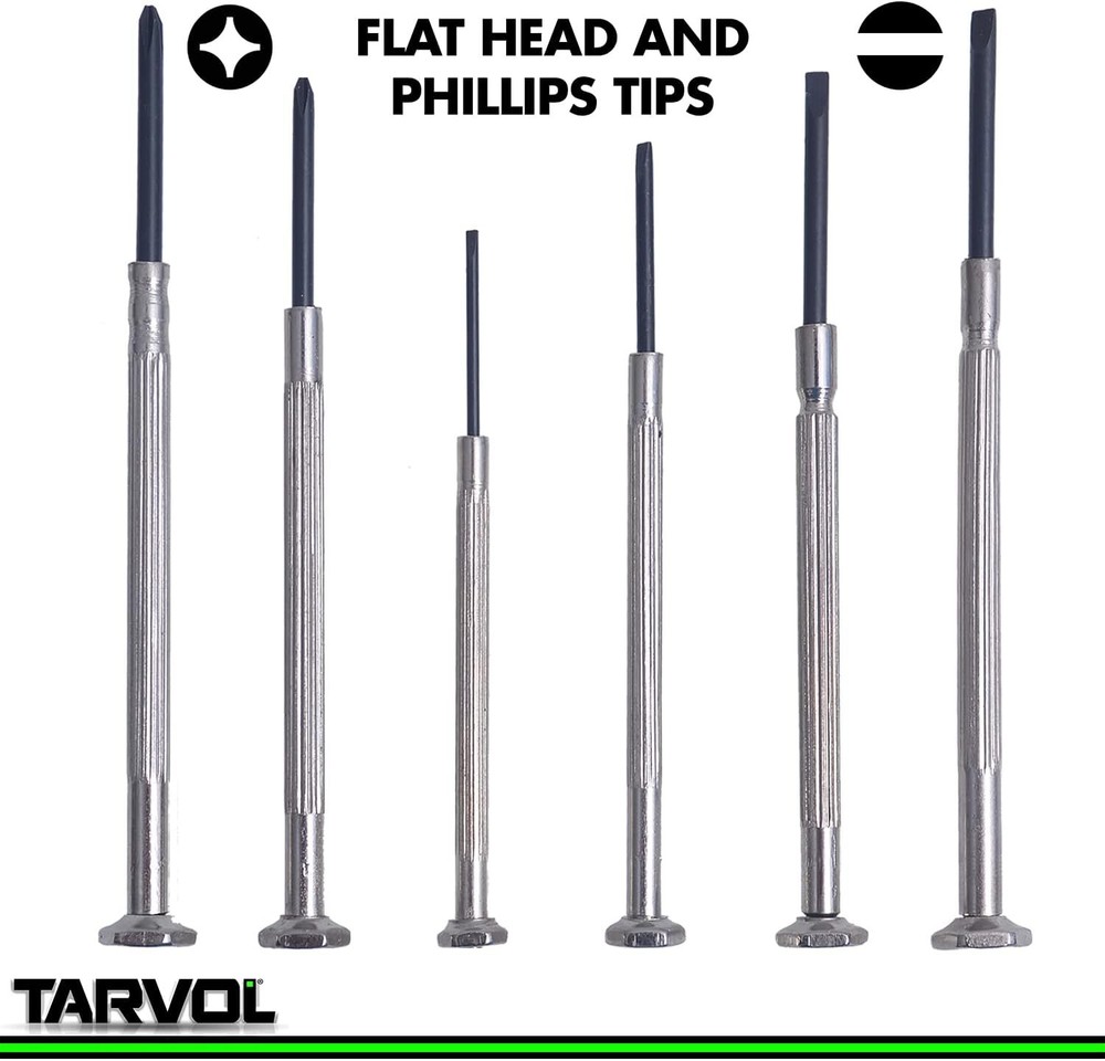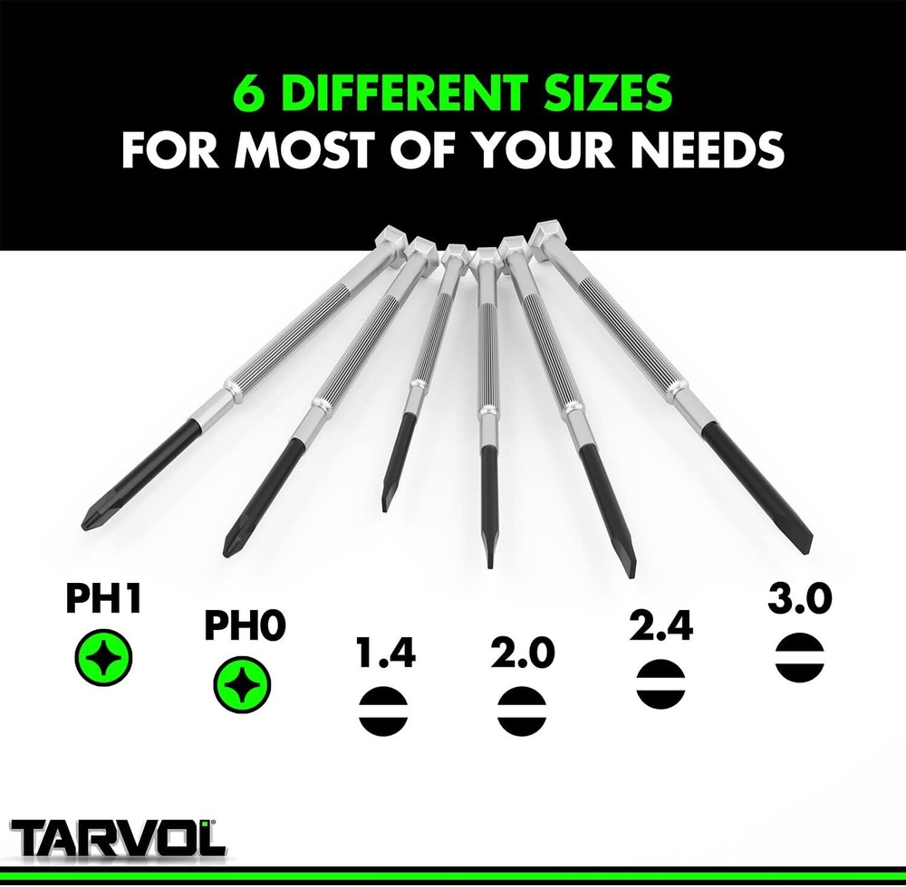 About this item 6 Different Sizes / Styles - Includes 0-Point and 1-Point Phillips and Flathead 1.4mm, 2.0mm, 2.4mm, 3.0mm Rust Proof Blades - Hard tempered black oxide shafts designed for longevity and durability Convenient Carrying Case - Plastic storage case to keep the screwdrivers organized Ideal For Fastening Small Screws - perfect for electronics, computers, watch repair, jewelry repair, and fixing anything with micro screws Product Dimensions: 5 x 3 x 1 inches