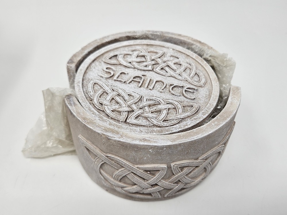 6 Piece Circular Slainte Irish Celtic Knot Resin Coaster Set with Base Holder New in Box