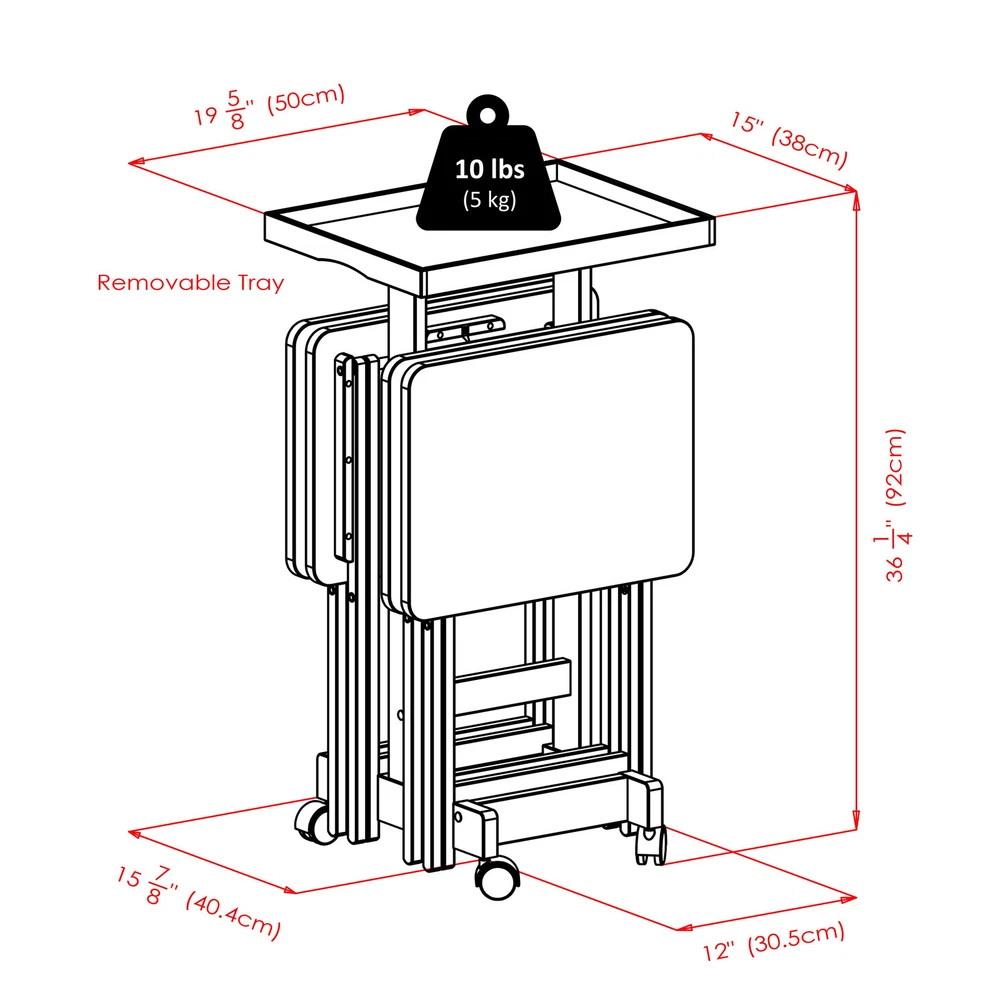 Perfect for entertaining or relaxing on the patio or in front of the TV, this set of Solid Wood Snack Tables comes with an upright stand that stores the folded tables securely and discretely when not in use. A removable wood serving tray that sits atop the stand provides extra table top space when needed. The stand rolls easily on casters, two of which lock to keep the unit stable. And with each of the 4 tables opening to a generous 19"W x 14.5"D, there is plenty of room for a meal, snacks and drinks. Made of Solid Wood in a Natural finish. Sold as 1 Each. 4 Solid Wood Folding Tables. Made of Solid Wood. Upright storage stand. Stand dimensions: 12"W x 15.9"D x 35"H. Removable Serving Tray 19.7"W x 14.9"D. Tables come fully assembled. Stand rolls on casters, two of which are locking. Parts replacement within 30 days.