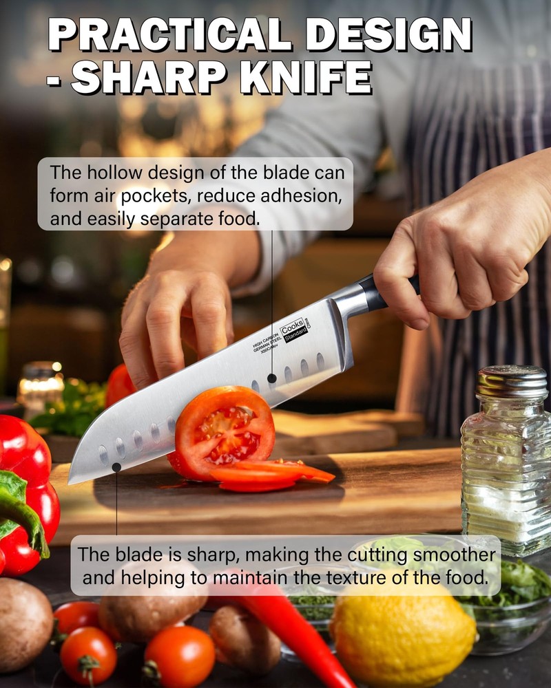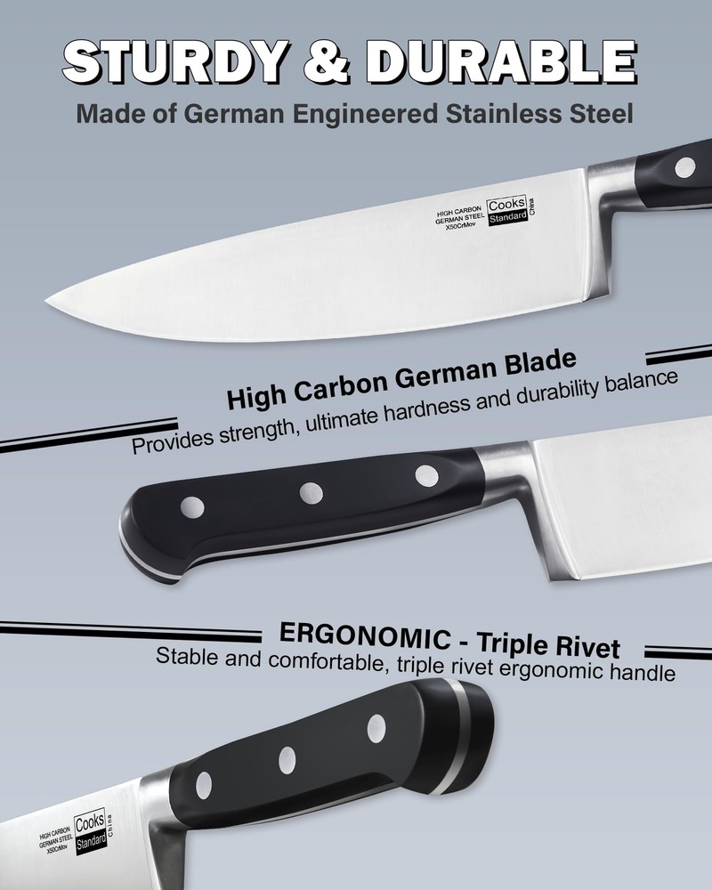 The 6-piece stainless steel knife set with Expandable block for extra slots includes: 8 inch Chef's Knife, 7 inch Santoku Knife, 5.5 inch Serrated Utility Knife, 4.5 inch Utility Knife, 3.5 inch Paring Knife, and an Expandable block. Blade material is German engineered and made of stainless steel that provides strength and balance. Blades are sharp, stain resistant, and releases food easily. Full tang construction with 3 rivets provides durability. Handles are ergonomically designed for Comfort and polished for hygienic benefit. 9 slot block for storage is Expandable and holds wide and long knives. Not dishwasher safe, hand wash and dry immediately. German High Carbon Steel Knife: Our knife set is professionally forged from high-carbon German stainless steel, ensuring excellent sharpness, high hardness, durability, and corrosion resistance Excellent Sharpness: Our blades are finely honed to create razor-sharp edges; Whether slicing or chopping, you will experience the exceptional cutting performance our knives bring to your cooking tasks Triple Rivet Ergonomic Handle: Designed with user comfort in mind, the ergonomic handle has a triple rivet design; This provides a safe and balanced grip while also enhancing the tool's overall durability Nine-Slot Knife Block: Designed with nine slots, the block has a stable pine wood inner layer and a durable outer layer, with a natural texture and unique beauty Durable and Safe: The knife block is equipped with four safety feet, providing a stable and secure base for your countertop, preventing scratches and damage