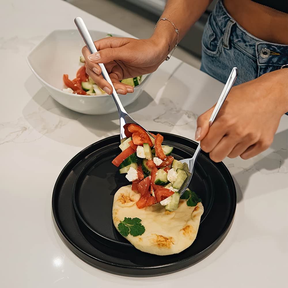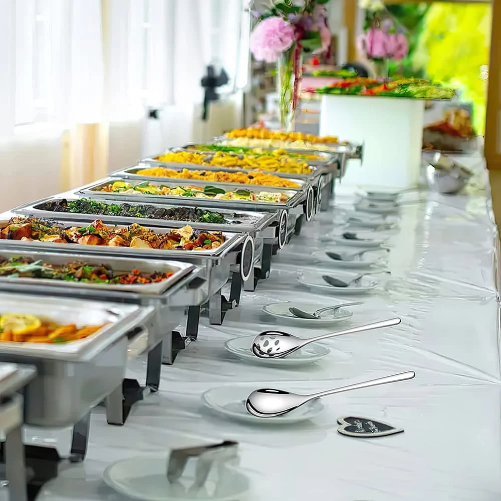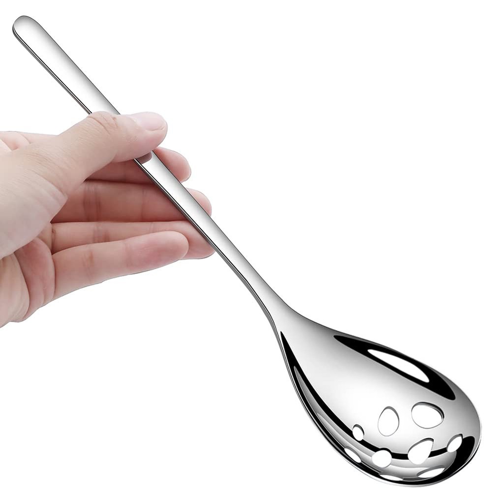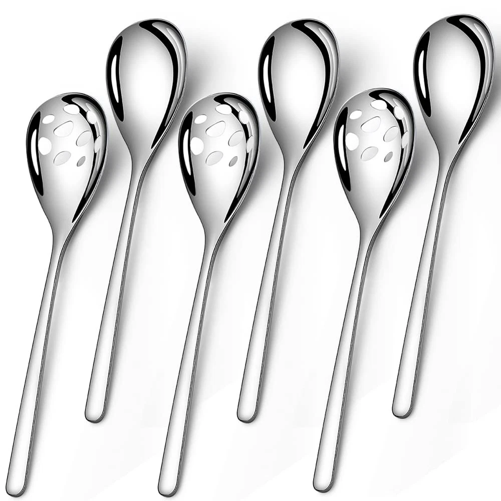 【Serving Spoons Set】This serving spoon set includes 3 solid serving spoons and 3 slotted serving spoons, each measuring 9.4 inches long. Use the slotted spoon stainless steel is ideal for draining excess liquid from salads, fruits, vegetables and the solid spoons to pour sauce or gravy. This dining serving utensils is perfect for restaurants, buffet banquets, family dinners and daily use. 【High-quality Stainless Steel】Crafted from high-quality 18/10 stainless steel, these serving spoons for buffet are rust-resistant, ensuring they will last for years to come without additional investments. The thick and sturdy structure of the spoons won't chip or bend even with heavy use, making them ideal stainless steel serving utensils. 【Proper Size】The length of the whole stainless steel serving spoon is 9.4 inches can easily handle big scoops of any type of food. With a proper size and comfortable handle makes them easy to hold, these slotted spoons are versatile enough for stirring salads, dishing out rice or potatoes, dividing food, and more. They are also great extra big serving spoons for parties or buffets. 【Simple Modern Design】The long handle will fix in your hand comfortable and well balance. These banquet spoons feature a simple modern design suitable for any style of kitchen tableware. Their graceful modern design makes them outstanding on your tabletop. They feature a mirror-polished surface without sharp edges that always maintains a shiny and bright appearance. 【Dishwasher Safe】The serving utensils set for parties is polished through multiple polishing processes to make it shiny like a mirror.You can put the spoon set in the dishwasher go through quite a few cycles in the dishwasher ,and it shines nicely each time it comes out of the dishwasher ,easy to clean.