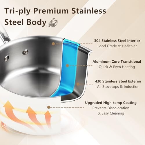 Return Policy Fast Delivery Trusted seller Tri-Ply Stainless Steel Sauce Pan Set with Lids 6PC, 1.5QT & 2.5QT & 3QT, Induction, PFOA Free, Dishwasher Safe,Sauce Pot, Cooking Pot, Tri-Ply Full Body Product Description High-quality Materials: It is a tri-ply full-body stainless steel saucepan with no PFAs, ensuring strength and durability. Layer 1 is 304 food-grade stainless steel for safe and healthy cooking. Layer 2 is an aluminum layer for even and quick heating. Layer 3 is 430 stainless steel for performance on all cooktops. Additionally, t is an outer layer of white high-temperature paint to protect the stainless steel from discoloration due to high heat, making it easy to clean. Thoughtful Design: The 6-piece saucepan set, which includes 1.5QT, 2.5QT, and 3QT suacepans and 3 glass lids, is perfect for everything from sauces to soups, making it an essential addition to any kitchen. With a satin polished interior and a stylish white painted exterior, these pots are not only functional but also serve as a decorative element in your kitchen. Healthy Cooking: Made from food-grade stainless steel that is free from PFAS, PFOA, and PTFE, this saucepan features non-coated materials and a satin finish, ensuring easy cleaning while remaining SGS approved for safe and healthy cooking. The high-quality stainless steel not only s food safety but is also resistant to rust, making it a durable choice for everyday use in the kitchen. Induction Ready: Our stainless steel saucepan set is compatible with a variety of cooktops, including gas, electric, induction, ceramic, and glass. They are oven safe up to 572°F, offering versatility for a wide range of cooking methods. Dishwasher safe. 100% SATISFACTION GUARANTEED: Our scanpans are of exceptional quality, rigorously tested. We also offer 24/7 online customer service to answer any questions you may have, ensuring a worry-free shopping experience. Shipping Returns Payment Shipping Shipping is FREE to all addresses other than APO/PO boxes in the lower 48 states. All our stock ships from US-based warehouses. Shipped via USPS or UPS (depending on location and package weight) Unless stated otherwise, all orders will ship within 24-72 hours of your payment being processed. Check our feedback to see the great reviews of FAST shipping we offer. Returns Seller does not accept returns Payment We currently accept payment via eBay managed payments only. Once payment is cleared, we will dispatch your shipment within 1-3 business days. Please refer to the "Shipping" tab for more information regarding shipping speed to your destination.