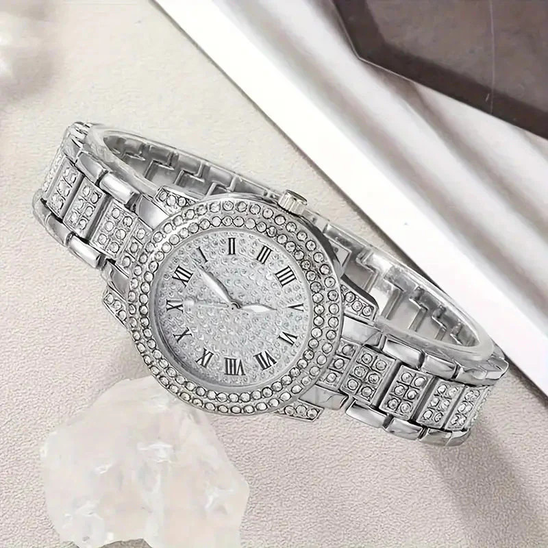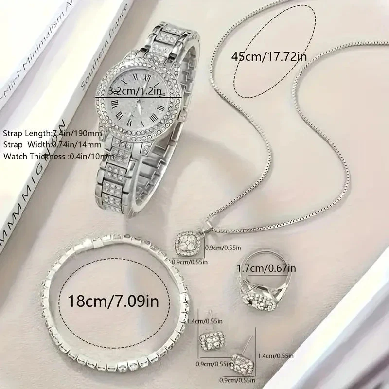 Title 6-Pieces: Elegant Women's Jewelry Set with Quartz Roman Numerals Watch PRODUCT DESCRIPTION Discover the perfect blend of sophistication and versatility with our 6-Pieces: Elegant Women's Jewelry Set with Quartz Roman Numerals Watch. Expertly crafted from high-quality zinc alloy, this stunning set features sparkling rhinestone embellishments that add a touch of glamour to any outfit. At the heart of this collection is a luxurious Quartz watch with classic Roman numerals, offering a timeless and refined aesthetic. Its simple yet elegant design makes it an ideal accessory for both everyday wear and special occasions. The watch's precise quartz movement ensures reliable timekeeping, combining style with functionality. This versatile 6-piece set includes complementary jewelry pieces that perfectly match the watch, allowing you to elevate your look effortlessly. Whether you're dressing up for a formal event or adding a chic touch to your casual attire, this set provides the perfect finishing touch. Premium Materials: Zinc alloy construction with dazzling rhinestone accents Elegant Style: Classic Roman numerals on the watch face Complete Set: Six beautifully coordinated jewelry pieces Timeless Design: Suitable for any occasion, from daily wear to special events Perfect Gift: An ideal present for loved ones or a luxurious treat for yourself Elevate your jewelry collection today with this exquisite set and make a statement that reflects your timeless fashion sense. Don't miss out—add this elegant 6-Pieces Women's Jewelry Set to your cart now! Powered by