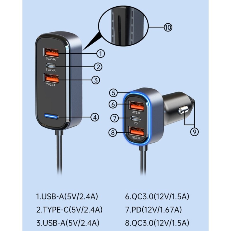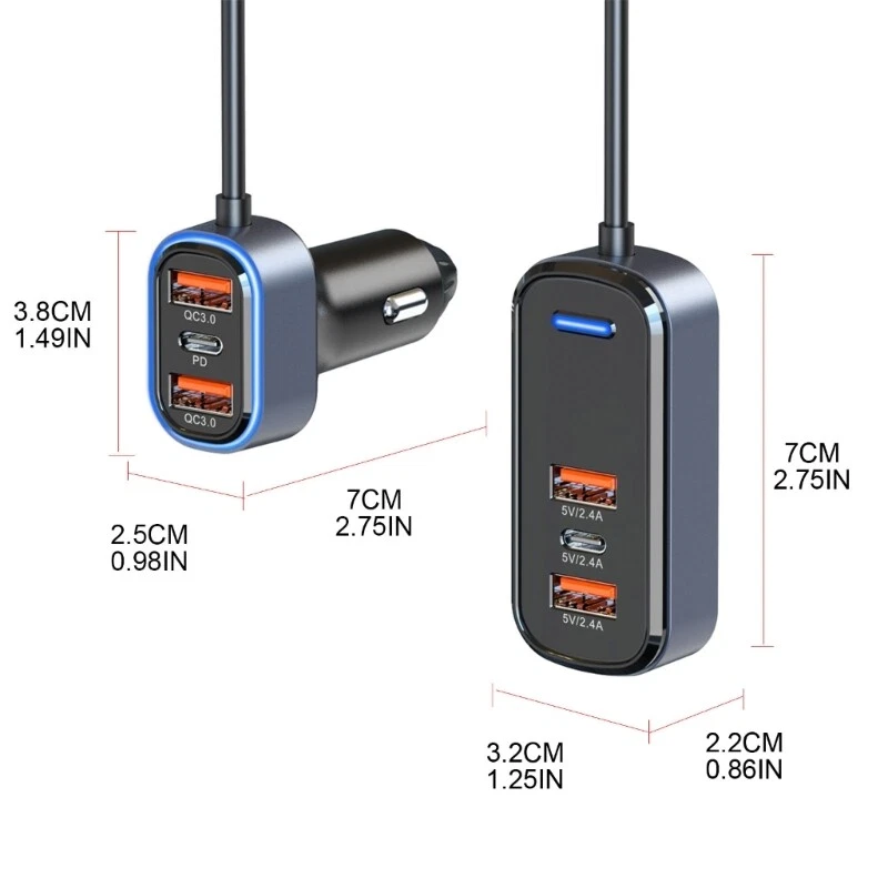 Features: 65W high-power output simultaneous charging of multiple devices 1 to 6 PD3.0/QC3.0 TypeC Extended charging hub fast- charging protocols such as SCP, FCP, QC2.0, QC3.0, and PD3.0 Multiple input overvoltage output overcurrent output short circuit over temperature Suitable for 12V-24V vehicles Specifications: Input: 12-24V Output of vehicle charging part: Port A: 5V/3A, 9V/2A, 12V/1.5A Port C: 5V/3A, 9V/2.22A, 12V/1.67A Simultaneous output 5V/3A Output of extension part: Port A: 5V/2.4A Port C: 5V/2.4A output of port A+port A: 5V/3.1A output of the machine: 65.5W Extended car cahrger size: approx 7x3.2x2.2cm/2.76x1.26x0.87in Car size: approx 3.8x2.5x7cm/1.5x0.98x2.76in Package Includes: 1PC 65W PD3.0/QC3.0 Car note: Due to the problems of lighting effects and shooting angles, there will be certain tolerances in the product, please understand. Please allow 0-1cm error due to the manual measurment.