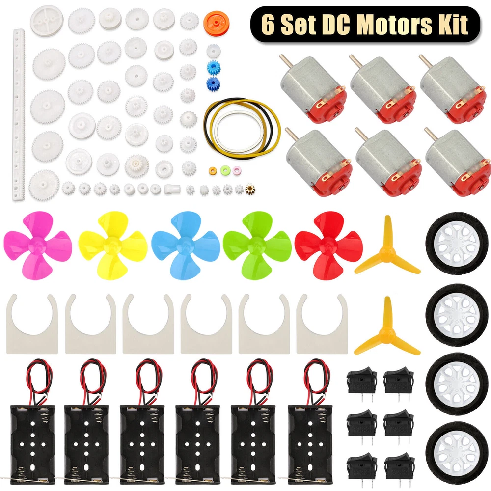 Product Description 6Set/95Pcs DC Motors Kit Mini Electric 3V 10000 RPM Strong Magnetic Repair DIY Features: Colorful Shaft Propellers: This set includes 5 pieces of 4-vane shaft propellers, and 2 pieces of 3-vane shaft propellers to fulfill your various needs. DC Motor: The high torque strong magnetic brushed electric 130 motor is perfect for science educational models, DIY STEM toys, and more. It is recommended to use a 3V battery drive to ensure optimal motor lifespan by avoiding high-speed operation. Wide Applications: This comprehensive motor kit contains everything you need for DIY toys, including minivans, cars, boats, planes, and electric toys. The mini wheels, axles, and plastic gears allow for the effortless assembly of small STEM toys. Package Includes: 6 x 130 Motor 6 x Battery clip connectors 6 x Motor mounting brackets 6 x Boat rocker switches 4 x Toy wheels 60 x Plastic gears 5 x 4-vane propellers 2 x 3-vane propellers If you have any questions, please feel free to contact us via ebay. We usually respond within 24 hours. Payment Shipping Returns Contact Us We accept all verified payments from ebay. Orders will be shipped after receiving cleared payment. Payment due within 7 days after auction ends and for buy it now listings. We ship most of our orders within 24 hours, and may up to 48 hours for. If you want faster shipping way. Please contact us before making payment. Sometimes due to problems with our transportation company system, your shipping information may be delayed to update. We recommend that you try again after 3-4 days. If you still haven't checked the shipping information, you can contact us by ebay message. Always believe we can figure things out with communication, if it comes to return, the pacakge must be intact and the same as you receive. If you have any questions, please feel free to email our service specialists 24 Hours a Day, 7 Days a Week. We will reply you ASAP. Return/refund is accepted within 30 days after the buyer receives the item. NO exchange will be accepted after 30 days from the date when the item is received. Please contact us first before returning your product!!! If you have any questions, our Customer Service staffs welcome you to email us. We strive to answer all questions and resolve any problems as quickly as possible. You can contact us 7*24, we will reply at the first time, and we will surely solve your problems. Note: 1.We try our best to reply to your emails as soon as possible, however, due to high volume of daily incoming emails and time zone difference, we may not be able to reply your emails immediately. Please allow 1 business days for us to response. If you do not receive any reply from us, please check your email ensuring your mailbox has not reached full size. 2.Due to some ISP SPAM filter settings, you may not be able to receive our replies; if you have problems receiving our emails, you may need to use a different email account to contact us. 3.Please give us the opportunity to resolve any problem. We understand the concerns and frustrations you might have, and will try our best to resolve the issues. Please email us before leaving any negative feedback or open any dispute on PayPal. 4.We care about our valued customers, and will always try to help you. So if you have any problems, please e-mail us immediately. Payment We accept all verified payments from ebay. Orders will be shipped after receiving cleared payment. Payment due within 7 days after auction ends and for buy it now listings. Shipping We ship most of our orders within 24 hours, and may up to 48 hours for. If you want faster shipping way. Please contact us before making payment. Sometimes due to problems with our transportation company system, your shipping information may be delayed to update. We recommend that you try again after 3-4 days. If you still haven't checked the shipping information, you can contact us by ebay message. Returns Always believe we can figure things out with communication, if it comes to return, the pacakge must be intact and the same as you receive. If you have any questions, please feel free to email our service specialists 24 Hours a Day, 7 Days a Week. We will reply you ASAP. Return/refund is accepted within 30 days after the buyer receives the item. NO exchange will be accepted after 30 days from the date when the item is received. Please contact us first before returning your product!!! Contact Us If you have any questions, our Customer Service staffs welcome you to email us. We strive to answer all questions and resolve any problems as quickly as possible. You can contact us 7*24, we will reply at the first time, and we will surely solve your problems. Note: 1.We try our best to reply to your emails as soon as possible, however, due to high volume of daily incoming emails and time zone difference, we may not be able to reply your emails immediately. Please allow 1 business days for us to response. If you do not receive any reply from us, please check your email ensuring your mailbox has not reached full size. 2.Due to some ISP SPAM filter settings, you may not be able to receive our replies; if you have problems receiving our emails, you may need to use a different email account to contact us. 3.Please give us the opportunity to resolve any problem. We understand the concerns and frustrations you might have, and will try our best to resolve the issues. Please email us before leaving any negative feedback or open any dispute on PayPal. 4.We care about our valued customers, and will always try to help you. So if you have any problems, please e-mail us immediately. powered by