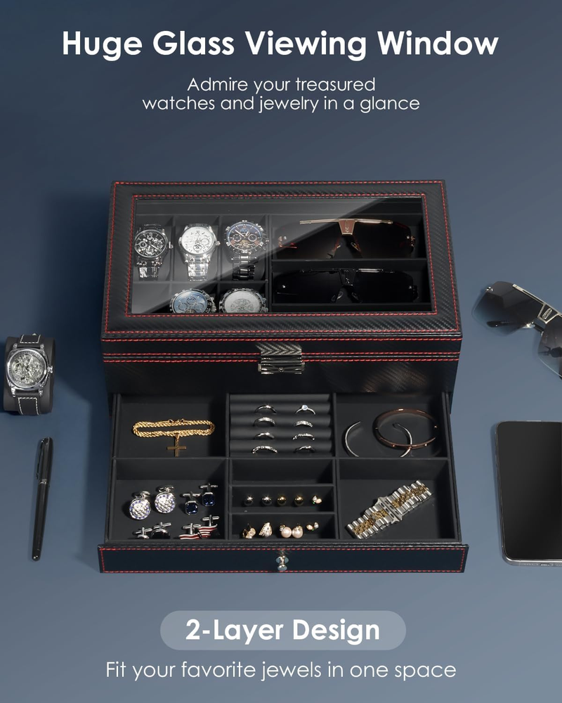 This watch organizer is a game-changer! The two-layer design keeps my watches and sunglasses neatly separated, while the spacious drawer fits all my jewelry without clutter. The quality feels premium, and it’s the perfect size for my dresser. Love how everything stays organized and protected—definitely worth it!