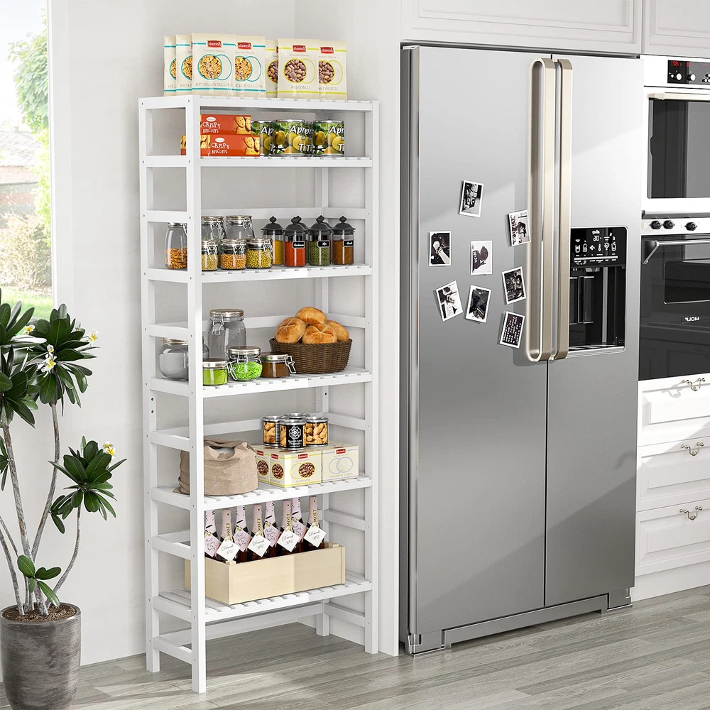HIGHT QUALITY BAMBOO SHELF UNIT - Keep clutter under control with this amazing tall storage shelf. Made of 100% natural bamboo material, durable and delicate. The surface of the shelf unit is coated with waterproof varnish, which can be used in the living room, study room, reading room, home office, bathroom, kitchen, and balcony. Our bookshelf can stand the test of time. 6-TIER ADJUSTABLE STANDING BOOKSHELF - Whether you decide to cascade your favorite house plants, show off your personal art gallery or collect your various books on this solid free-standing bookcase, its 6 adjustable shelves will support whatever you choose. Equipped with anti-tip fittings, the bookcase can be anchored to the wall so as to avoid wobbling or tipping. SPACE SAVER SHELF FOR SMALL SPACES - 23.6"L * 10.2"W * 63.4"H, 6-tier book shelf of 10.2” deep perfect fit any room, creating more storage space for your home without taking up too much space. The height of each storage shelf can be adjusted according to your hobbies or the height of the items. This white bookshelf will bring a natural aesthetic style to your home. MULTIPURPOSE STORAGE SHELF - Thick bamboo shelves with easy-to-tight screws can withstand heavy loads without being easily bent or deformed, each shelf can accommodate up to 33 lbs. Open wide design provides more space for storage, can be used as a bookcase, flower stand, kitchen shelf, bathroom rack for holding books, photo frames, plants, towels, baskets, and so on. DURABLE BUT LIGHTWEIGHT - Structured with solid bamboo for extended durability, overall weight is 18.7 lbs. You can easily move the storage shelf and place it wherever you want. Perfectly spaced bars prevent the books from falling into the gap. EASY ASSEMBLY - Tighten the shelves with screws as needed to complete the installation. Only 4 steps are required and no more than 10 minutes. Our easy-to-follow assembly instructions will guide you through each step. If the received item is defective, please feel free to contact customer support. EASY TO MAINTENANCE - The surface of the bookshelf is smooth and moisture-proof, it is not easy to get dirty after long-time use. If stained, please wipe it with a damp cloth.