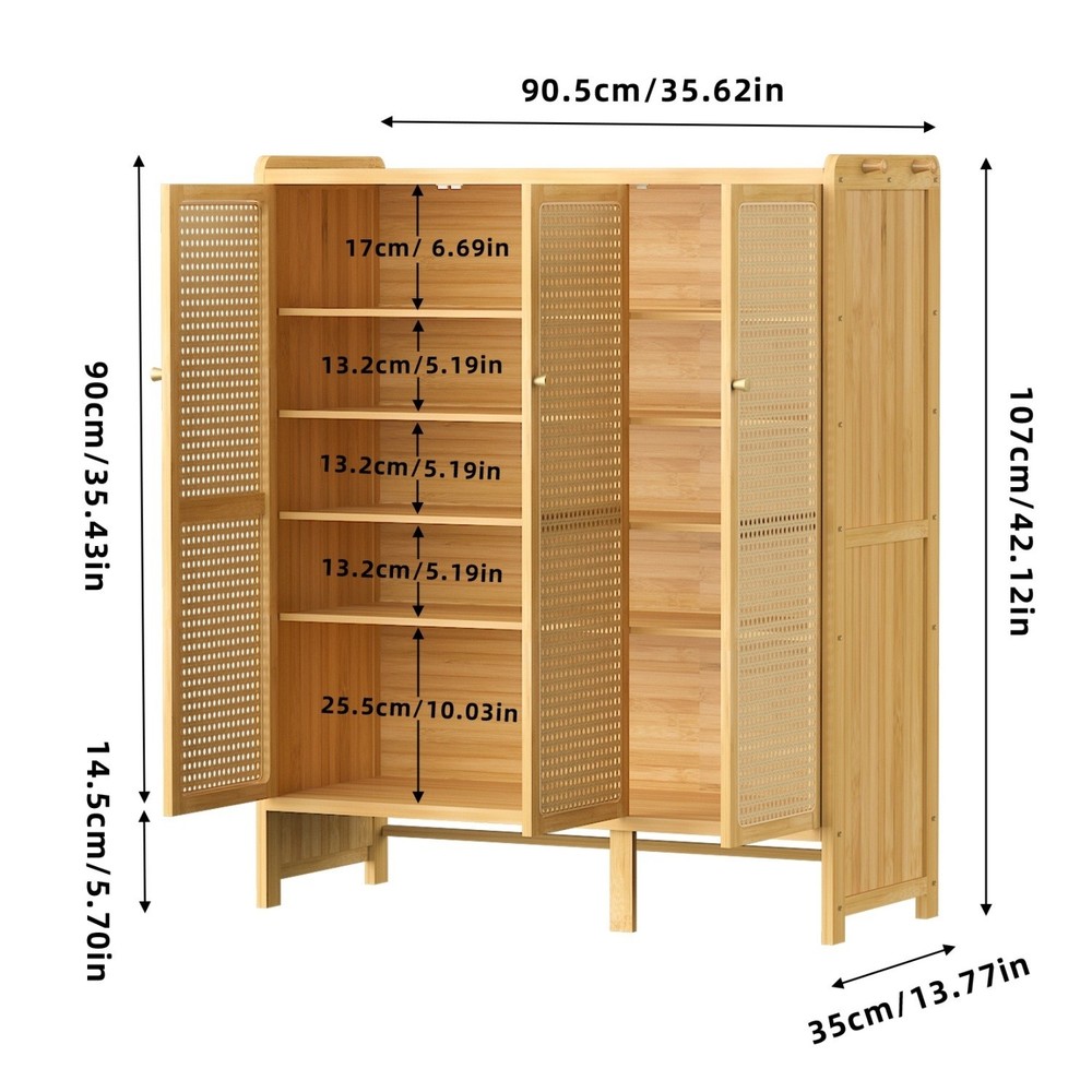 6-Tier Shoe Storage Cabinet 3 Hollow Doors Entryway Bamboo Shoe Rack Organizer 6-Tier Shoe Storage Cabinet 3 Hollow Doors Entryway Bamboo Shoe Rack Organizer US SELLER, FAST ARRIVAL! Features: Built with 5-tier ample interior shelves for accommodating up to 18-20 pairs of shoes. Includes a top surface for displaying planters, framed photos, keys, artwork, a mirror. All three doors have gaps in the rattan, vented to air circulation inside the cabinet. Breathable plastic rattan panel doors, not only add texture also promote ventilation. Rattan-wrapping edge, not only enhance beauty also prevent net from coming loose. The doors are fitted with magnetic closure, reduce the risk of doors being damaged. Magnetic closure easy to open and close, keeping shoes safely hidden , reduces wear. Comes an elegantly integrated aluminum door knob adds a refined finishing touch. Built with four hooks for hanging everyday essentials like handbags, umbrellas, hats. Constructed from bamboo frame with MDF shelves, lends super strength and robust. Natural bamboo structure, without any pungent smell, safe for the health of family. Strong package includes all the hardware and instruction for hassle-free assembling. Specifications: Shape: Rectangular Model: Shoes Cupboard Features: Well-ventilated Doors, With Shelves Materials: 70% Bamboo +20% MDF +1% Iron +9% ABS Color: Natural Wood Net Weight: 16.5kg/ 36.38 lbs Product Dimension: L * W * H total 90.5x35x107cm/ 35.62x13.77x42.12 inch Tabletop Surface: L * W 90.5x35cm/ 35.62x13.77 inch Weight Capacity: Top Shelf 10kg/ 22.05 lbs Each Shelf 5kg/ 11.02 lbs Package Included: 1 x Shoe Storage Cabinet 1 x Instruction Guide Payment Delivery details Terms of sales About us Contact us Payment 1.We accept payment by credit card, paypal, payoneer. 2.Upon on payment, please confirm your shipping address. Delivery details 1. All of our products are brand new. 2. All Mirror have passed drop test over 1.2m and quality inspection, ensures the mirror was shipped in good condition before shipment. Terms of sales 1.We are located in NJ, CA ,all the items will be shipped via USPS, UPS Ground, Fedex Ground with tracking number provided. 2. We cannot ship to Alaska, Hawaii & Puerto Rico Addresses. About us About Wisfor At Wisfor,we provide high quality LED bathroom mirrors,focus on the development and innovation of mirrorsand our company has over 10 years backed with professional service experience, and exports products to more than 130 countries around the world. There are severial series of mirrors, Bathroom Mirror with Light, RGB Frontlit &Backlit LED Mirror, Metal Frame Mirror,Decorative Wall Mirror,ect. And many shapes, rectangle, round, oval, and so on.We always focus on the development and innovation of high-quality LED bathroom vanity mirror, to meet your demand and to elevate personality and design tastes. Contact us 1. If you are satisfied with the transaction could you pls leave us a positive feedback 5-star that we will be appreciated. 2. Normally your email would get replied within 24 hours (Business Hours) and your issue will be followed up carefully till we 've reached an agreement. 3. If you have any questions or suggestions before opening a case or dispute ,or leaving any neutral or negative feedback, please contact us first,we will try our best to resolve your problem. Brand UNHO Model Shoes rack Features With Doors, With Shelves Item Height 42.12 inch Item Length 35.62 inch Item Width 13.77 inch Type Shoe Cabinet Mounting Free Standing Assembly Required Yes MPN CNA9VJ2GA Material Bamboo Number of Shelves 5 Item Depth 35.62 inch Item Weight 16.5kg Color Natural Wood Capacity 16-20 pairs Number of Items in Set One-Piece