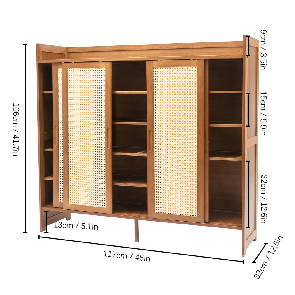 Specification Material: Natural Bamboo, ABS Surface Treatment: Painting Color: Brown Style: Simple Shape: Rectangular Number of Tiers: 6 Number of Doors: 4 Assembly Required: Yes Base Type: Legs Mount Type: Floor Standing Door Style: Grid Product Care Instructions: Hand Wash Recommended Uses for Product: Shoes Suitable Length of Shoes: Less than 12.6inch Each Tier Bearing Capacity: About 15kg/33.07lbs Product Size: 117*32*106cm/46*12.6*41.7inch Bottom Height: 13cm/5.1inch Tier Spacing: 15cm/5.9inch Two Elevated Compartments Height: 32cm/12.6inch Top Edge Height: 9cm/3.5inch Package Included 1*Shoe Storage Bench 5* Anti-slip Foot Pads 1* Allen Key All Accessories for Installation 6 Tier Shoe Storage Bench Bamboo Cabinet W/Two-way Sliding Doors 46*12.6*41.7in Specification Material: Natural Bamboo, ABS Surface Treatment: Painting Color: Brown Style: Simple Shape: Rectangular Number of Tiers: 6 Number of Doors: 4 Assembly Required: Yes Base Type: Legs Mount Type: Floor Standing Door Style: Grid Product Care Instructions: Hand Wash Recommended Uses for Product: Shoes Suitable Length of Shoes: Less than 12.6inch Each Tier Bearing Capacity: About 15kg/33.07lbs Product Size: 117*32*106cm/46*12.6*41.7inch Bottom Height: 13cm/5.1inch Tier Spacing: 15cm/5.9inch Two Elevated Compartments Height: 32cm/12.6inch Top Edge Height: 9cm/3.5inch Package Included 1*Shoe Storage Bench 5* Anti-slip Foot Pads 1* Allen Key All Accessories for Installation Application This product can store shoes with a length of less than 12.6inch and can be placed in the bathroom, living room, kitchen, entrance, and bedroom to store toiletries, decorative items, spices, small household appliances, books, various shoes, bags, umbrellas, small potted plants, keys, scarves, photos, toys, umbrellas, etc. Description In daily life, a clean and orderly space can make us feel relaxed and happy. When there are many disordered items, an organizer is essential. This shoe storage bench that is made of natural bamboo and ABS and adopts a painting process is durable and has a strong bearing capacity. It can help you store in order and bid farewell to messy items. With it, you are summing up happiness while putting things in order. Key Features Build to Last: High-quality natural bamboo, ABS, and painting process make this product environmentally friendly , strong, and durable, so it can keep beautiful and practical without frequent replacement. Strong Bearing Capacity: The firm material, full-board design, stable structure, anti-skid pads, and solid screws and legs make each tier bear a weight of 33.07lbs, so you can use it without worrying about collapse. Wide Space: The large size of 46*12.6*41.7inch, six-tier, and a raised bottom provide enough space for you to store multiple pairs of shoes and other items, thus creating a clean and tidy environment for you. Careful Design: The grid cabinet door and the raised bottom(5.1inch) promote air circulation, reduce odor, prevent the shoes from getting damp and mildew, and make it easy to place/find shoes. The fully enclosed back plate can effectively prevent dust from entering and shoes from falling. Beautiful Appearance: The beautiful brown, smooth lines, and simple style make the whole product retro and solemn. Wherever it is placed, it will be a beautiful landscape. Simple and Convenient: The simple structure and practical installation tools ensure you can complete the installation in a short time. The smooth guide rail and two-way sliding door design with rollers and handles allow you to push and pull the door with less noise and effort, and it will not occupy aisle space and can also prevent collisions. Effortless Cleaning: The smooth surface allows you to easily remove dust and residues with a wet towel. The raised bottom also facilitates cleaning. Ideal Gift: With good performance, this product can be used as a holiday or housewarming gift for family, friends, and lovers so that they can enjoy a more convenient and emotional life. High Space Utilization: 6-layer design realizes the maximum utilization of vertical space, which is very suitable for people with a small house and more shoes. Details Round Corners: Compared with traditional square corners, an arc de sign without a burr can better c are for your skin. Elevated Edge and Compartment: The 3.5inch edge on the top can effectively prevent items from falling. Two elevated compartments (12.6inch) provide more convenience for storing boots, etc. Clear Texture: The clear texture on the surface can restore the most realistic touch and give you a better feeling of use. Notes 1. Please note that our package only includes one shoe storage bench , not other items, and the panels of this product cannot be adjusted. 2. Bamboo products are made of natural materials, which will inevitably lead to different textures, knots, halos, gaps, and spots, but they will not affect beauty and use. 3. Please do not use corrosive detergent or hard objects for cleaning. It is recommended to use a soft cloth for wiping. 4. Bamboo products should not be exposed to the sun, or in a dark, and humid place for a long time to avoid cracking, deformation, and mildew. 5. Please don't let children climb this product. 6. Please allow the slight color difference caused by the shooting light and 1-3cm error due to manual measurement, and make sure you do not mind before ordering. Payment Delivery details Terms of sales About us Contact us Payment We accept ebay payment 。 Fees such as import duties, taxes are not included in the item price or shipping costs. These charges are the buyer's responsibility. Delivery details Shipping: 2-9 working days to: USA Terms of sales We maintain high standards of excellence and strive for hundred percent customer satisfaction. Feedback is very important to us. We hope that you contact us immediately before you give neutral or negative feedback, so that we can address your concerns. It is impossible to address issues if we do not know a