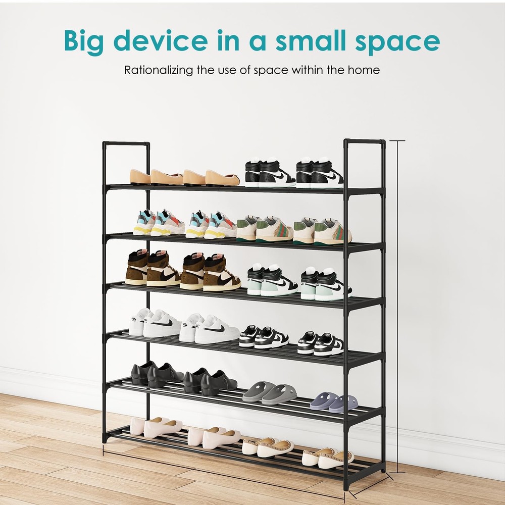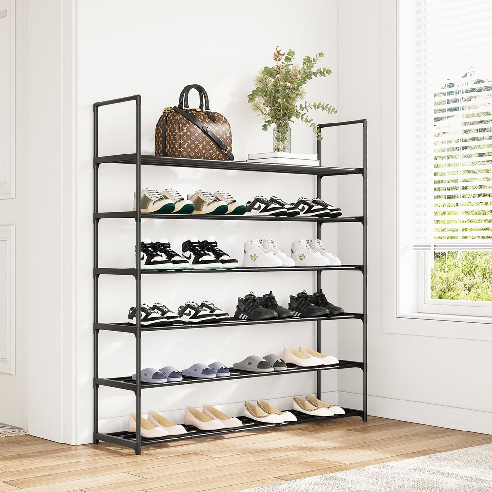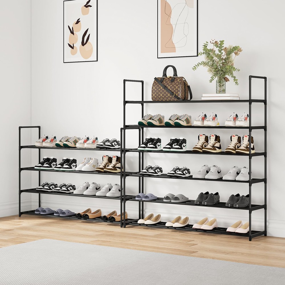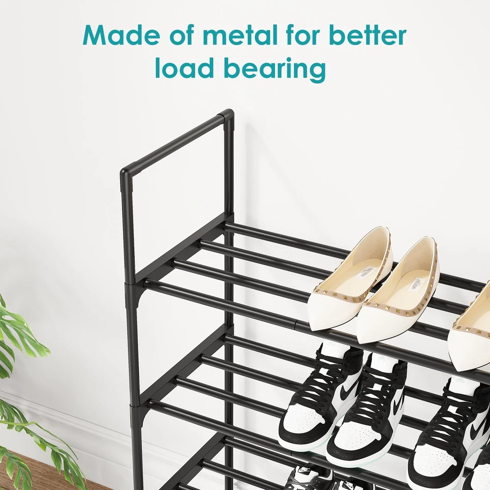 A shoe rack is an essential storage solution for any entryway or closet, providing an organized and tidy way to your footwear collection. These versatile racks come in various designs, from sleek and minimalist to rustic and decorative, to complement any home decor style. With multiple tiers or shelves, you can neatly arrange your shoes, keeping them off the floor and easily accessible. Constructed from durable materials like metal, wood, or plastic, a quality shoe rack offers sturdy support and ample space to accommodate numerous pairs. Whether you have a modest assortment or an extensive collection of shoes, a well-designed rack can transform cluttered chaos into an orderly display. Elevate your home organization and keep your shoes in pristine condition with this practical and space-saving solution. [Ample Storage Capacity]Efficiently organize your footwear with this spacious shoe rack measuring 11.2"D x 38.5"W x 42.5"H. Accommodates up to 16 pairs of men's shoes or 20 pairs of women's shoes, keeping them easily accessible. [Sturdy and Reliable]Constructed with robust thick metal tubes and quality plastic connectors, this shoe organizer supports up to 22 lbs per tier, ensuring your footwear is stored safely and securely. [Hassle-Free Assembly]Forget the tools! Our user-friendly design features numbered parts and clear illustrated instructions, making assembly quick and easy for anyone. [Low Maintenance Cleaning]Designed with a smooth, easy-to-clean surface, this shoe storage organizer wipes down effortlessly with a damp cloth, helping you maintain a tidy space with minimal effort. [Versatile & Stylish Design]With its sleek design and compact dimensions, this metal shoe shelf fits seamlessly into any room, including your closet, entryway, bedroom, or living room, enhancing your decor while providing functional storage.