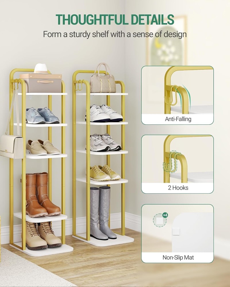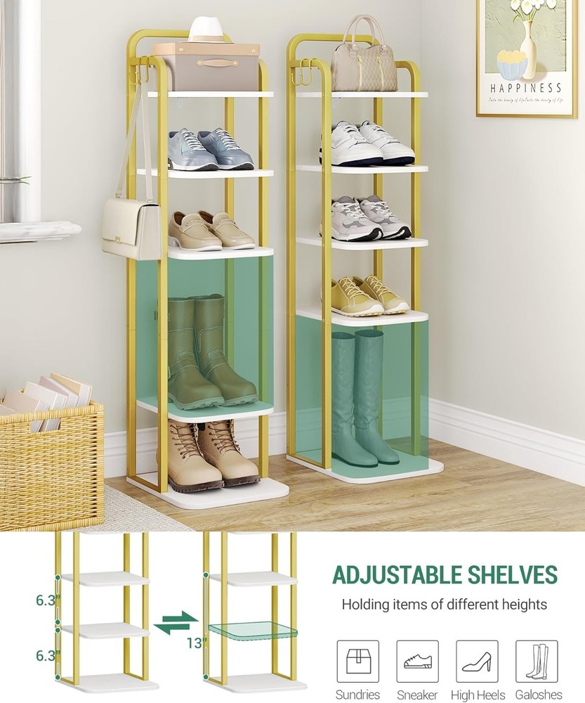 This shoe rack is a game-changer for small spaces! It fits perfectly in tight spots while holding plenty of shoes vertically. Love that it's adjustable and the extra hooks are super handy for keys or bags. Sturdy yet lightweight, and looks great as a plant stand too. So versatile—saves so much floor space while keeping everything organized. Highly recommend!