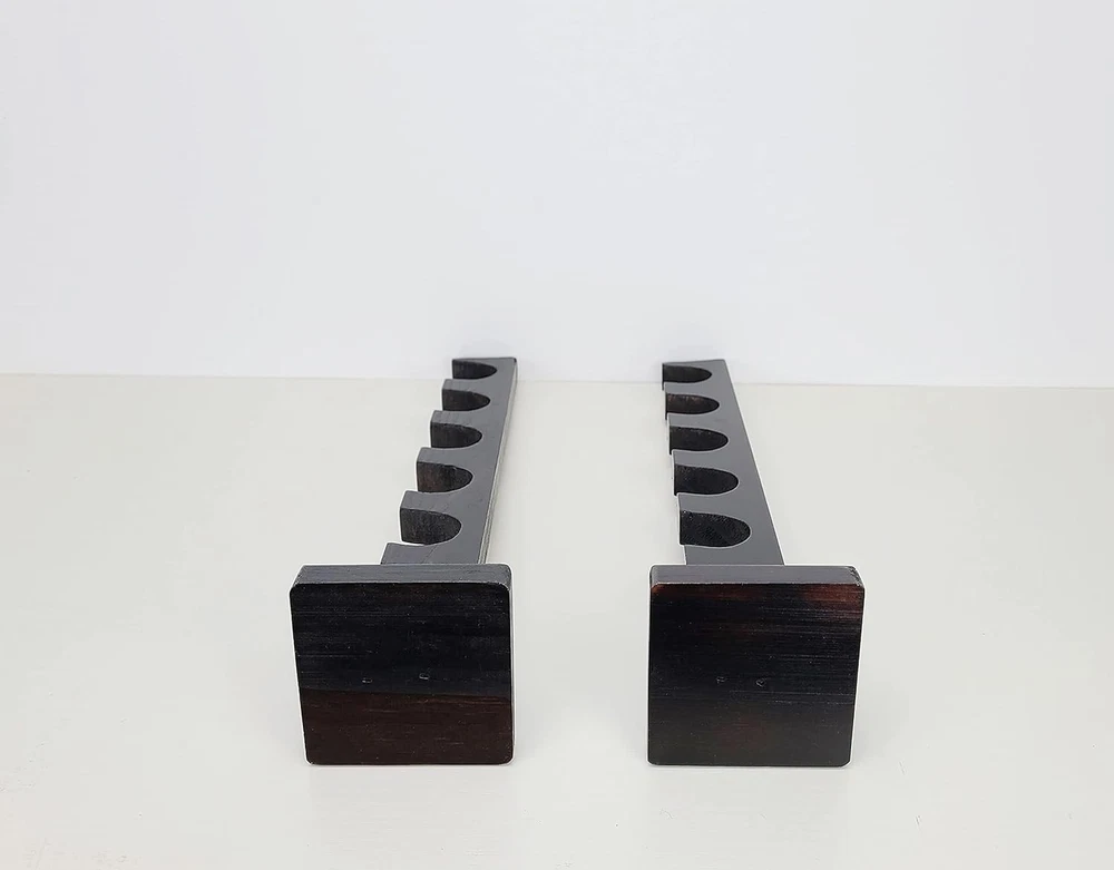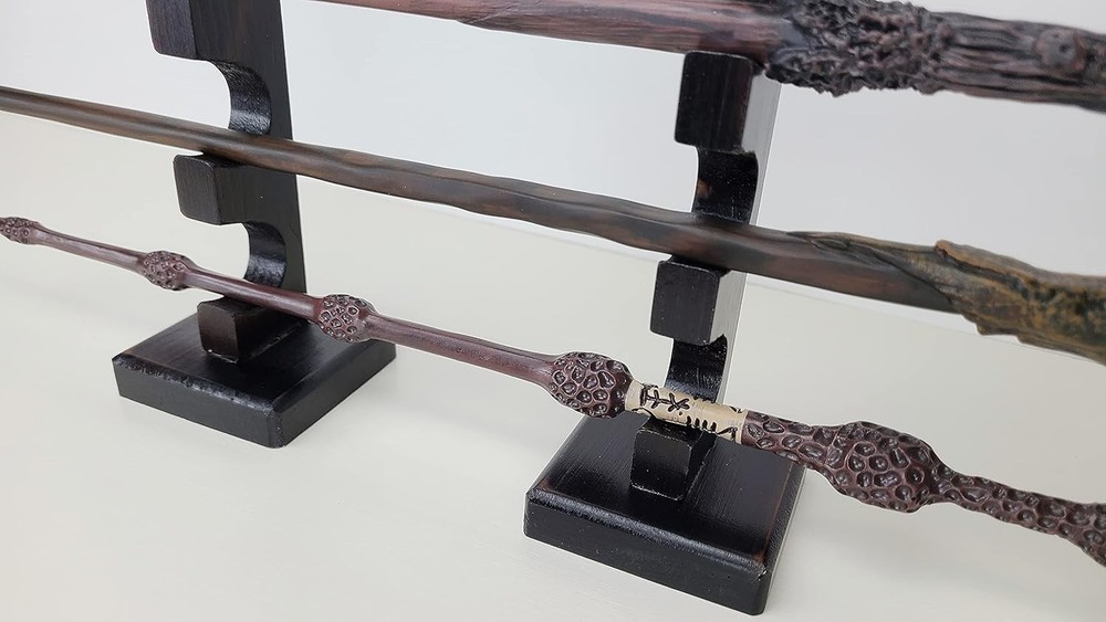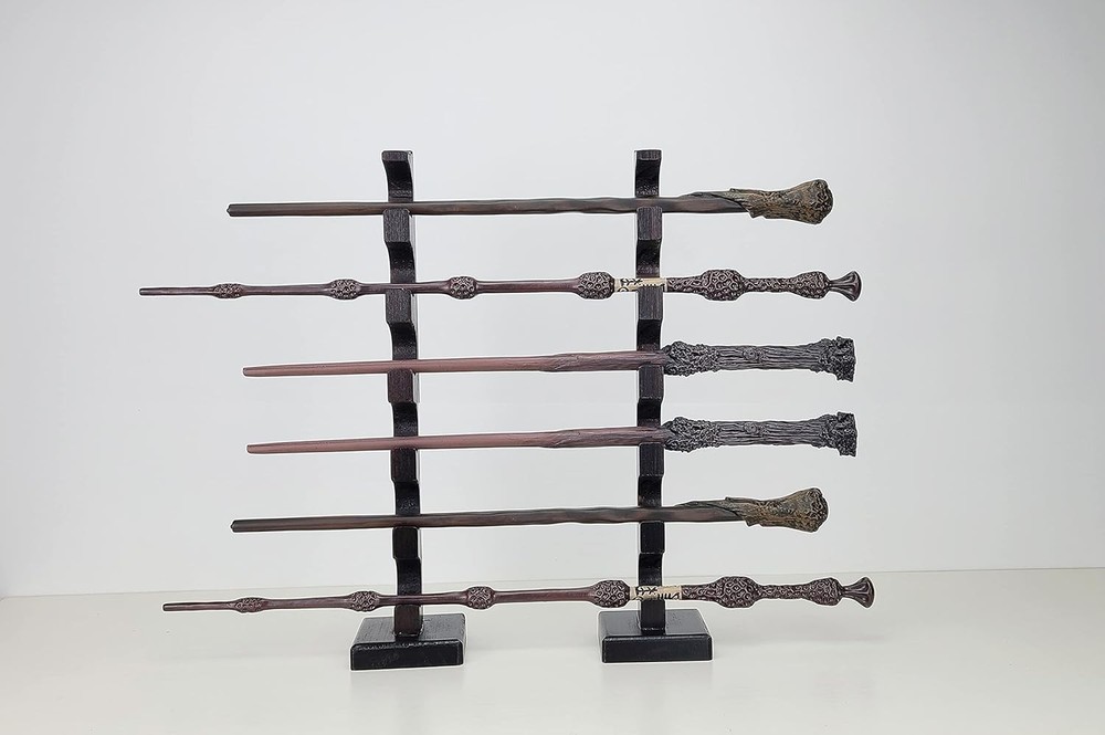 About item ELEGANT DISPLAY - The way this wand stand displays provides an amazing decoration for your home or office SOLID & STURDY - Made of high quality solid wood, with big base, it's very stable to hold 6 wands MULTI-PURPOSE STAND - Comes with 2 separated parts, it perfectly fit long or short wands and swords SIZE MATTERS - Measuring 2.5"x2.5"x12.5", holes size 1", compact and nicely display your wands Amazing Gift Idea for Wands Enthusiast. Material: Pine Wood with dark finish. Wands not included