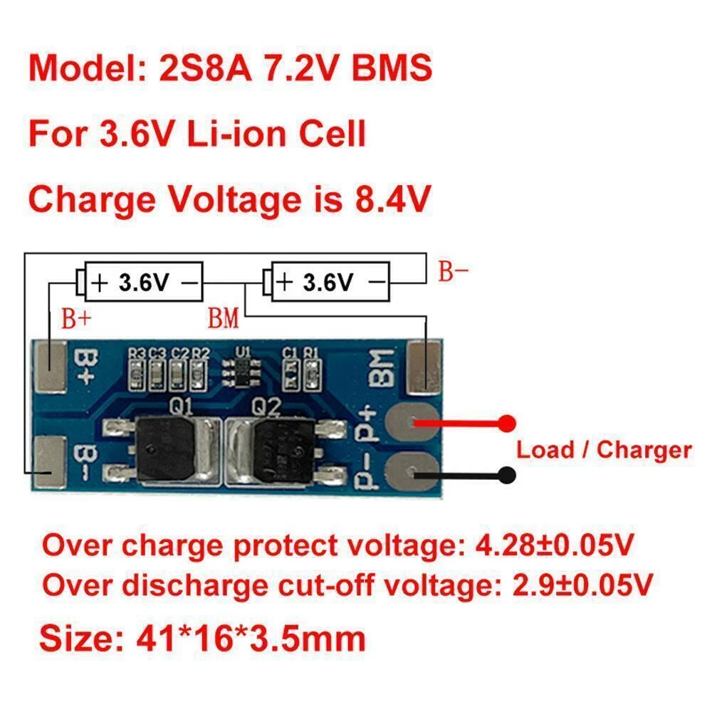 Hot Sale 12V 3S 7P 40A BMS Li-ion Battery Pack DIY Kits Case Holder Fr 18650 Power Wall// 11.99 USD 1.99 USD 12V 3S 7P 40A Li-ion Battery Pack DIY Kits Case Holder for 18650 Power Wall ACUS 6.99 USD 2.99 USD 12V 3S 7P 40A BMS Li-ion Battery Pack DIY Kits Case Holder Fr 18650 Power Wall 6.99 USD 2.99 USD 48V 13S Power Wall 18650 Li-ion Battery Module Battery Box Holder BMS PCB Board. 17.44 USD Free shipping 24V Power Wall 6S Battery BMS PCB Board Battery Holder Box Module 40A DIY ACUS 12.96 USD 0.99 USD 3S 40A BMS 12V 3S7P Battery Bracket Protected Board for 18650 Lithium Battery * 8.99 USD Free shipping Daly BMS 3S-16S 12V-60V 15A-60A Li-ion LiFePo4 BMS Common Port w/Balance+NTC lot 13.5 USD Free shipping 12V 3S 7P Li-ion Battery Storage Case Box with Power Display/ 3S40A BMS/Holder 13.69 USD Free shipping 24V 21700 DIY Power Wall Battery Box Case 6S 40A BMS Battery Pack Ebike Battery 11.47 USD Free shipping Daly Smart BMS 3S-16S 12V-60V 40A-100A Li-ion LiFePo4 Battery BMS Bluetooth ACUS 32.9 USD Free shipping Daly BMS 3S-16S Li-ion LiFePo4 5A Active Balancer Battery Equalizer Board Newest 21.5 USD Free shipping Daly BMS 3S-14S 15A-60A Li-ion LiFePo4 Battery Protection Board with Balance USA 16.47 USD Free shipping Product Description New Arrival Daly New KMS/ Regular Smart BMS WIFI Bluetooth Module for Lifepo4 Li-ion Battery 13.7 USD Free shipping Daly KMS Smart BMS WIFI Bluetooth Module for Lifepo4 Li-ion Battery Accessories 21.07 USD Free shipping Daly Smart BMS 3S-16S 12V-60V 40A-100A Li-ion LiFePo4 Battery BMS Bluetooth USA 42.9 USD Free shipping Insulation Epoxy Plate for 3.2V 320Ah 310Ah 280Ah 90Ah 12.8V Lifepo4 Battery USA 22.99 USD Free shipping JK 4S-8S 100A-300A SMART BMS Li-ion LiFePo4 Active Balancer BMS BT/RS485 Lot USA 10.95 USD Free shipping JK 8S-24S 60A-200A Smart BMS LiFePo4 Li-ion Active Balance Board BT Lot ACUS USA 10.07 USD Free shipping Daly BMS 3S-16S 12V-60V 15A-60A Li-ion LiFePo4 BMS Common Port w/Balance+NTC USA 12.42 USD Free shipping DALY Smart BMS 20S 72V 100A Li-ION Bluetooth BMS Common Port with Balance + NTC 99.9 USD Free shipping BMS 13S 48V 20A Battery Charging Board Li-ion Protection ACUS 12.56 USD Free shipping 18650 48V 13S8P Lithum Battery Box Case Bracket Holder +Nickel Battery Pack Kits 50.9 USD Free shipping 13S 48V Battery Case 13S4P Holder Nickel Strap13S 48V 30A BMS Battery Box DIY 8.91 USD Free shipping 13S6P 48V Lithum Battery Case 18650 Holder+Nickel/30A BMS For Battery Pack DIY 21.35 USD Free shipping 6V4Ah battery case + holder Specification: Replace 6V4Ah Lead Acid Battery for LiFePO4 Lithium Ion Battery Pack。 Can hold cells: 6 pieces 18650 cells. 18650 cells: can hold 6 pieces 18650 cells. Battery pack: 18650 2S3P 3S2P. External dimension: 70*47*101mm. Internal dimension: 60*43*88mm. Application Area: Emergency Light, Electronic Weighing, Toy Car, Solar System. It's just an empty box+holder without a battery! 2S 8A 7.2V BMS Feature: High precision voltage detection circuit; Charger terminal with high voltage device; Integrated three-stage overcurrent detection circuit (overcurrent 1, overcurrent 2, or load short circuit); MOS transistor can control battery charging and discharging; Low standby current consumption. Specification: Overload voltage: 3.65v ± 0.05v. Surge voltage: 2.0-2.5v ± 0.05v. Max continuous current: 8A. Max. Peak Current:10A. Working temperature: -40 --- +50. Storage temperature: -40-+80. Small current: less than 3uA. Life Cycle: more than 50000 hours. Resistance: less than 300mΩ. Short cut protection: protective, charging can be repaired. Size:41*16*3.5mm. 2S BMS Cnnection Instruction: B + Connect battery positive; B-Connect battery negative; MB connects the point between battery 1 and battery 2; P + positive charge/discharge; P charge/negative discharge Note: Lithium battery protection plate cannot be used for lithium iron phosphate battery, Hernia lamp, electric drill battery pack, electric fish electromechanical pool group, electric. Moving bicycle battery pack, children's car battery, motor or motor products, 1W fisheye LED light, for the above combination of purchase customers please pay attention! The DESCRIBED power range is suitable for the following products: MASSager battery pack, LED light backup power supply, 12V electronics, solar street lamp battery pack, monitoring backup power supply, andOther products. 0.12*8mm*10Meter battery nickel strip Feature: Good gloss, good ductility and weldability. Suitable for spot welding. It is suitable for the manufacture of nickel-metal hydride batteries, lithium batteries, combined batteries and power tool communications, special lamps and other industries. Material: Nickel and Steel. Width: 8mm. Length: 10m. Size: 0.12*8mm*10Meter. Package includes 1*6V4Ah battery case. 2*18650 2*3 battery holder. 1*2S 8A 7.2V BMS. 1*0.12*8mm*10Meter battery nickel strip. You may also like JK BMS LCD Display/ RS485 Converter/ BMS Power Switch/ 4.3inch LCD Display Lot 10.95 USD Free shipping 12V YT5 Motorcycle Starter Battery Plastic Shell Case fr 18650/32650/26650 Pack/ 12.74 USD Free shipping 12V 12Ah 55Ah 70Ah Battery Case for LiFePO4 32700 18650 Empty Storage Box ACUS 11.99 USD Free shipping LCD Display RS485 Converter Adapter Power Switch Transfer Board for JK BMS LOT 7.16 USD Free shipping Daly Smart BMS 3S-16S 12V-60V 40A-100A Li-ion LiFePo4 Battery BMS Bluetooth ACUS 32.9 USD Free shipping POLLY DP-6 Battery Case 36V 48V 52V 10S7P 13S6P 14S5P for DIY eBike Battery ACUS 57.99 USD 5.99 USD 12V 30Ah Battery Case Box LiFePO4 Li-ion DIY for Solar System Energy Storage 20.02 USD Free shipping Daly BMS 3S-16S Li-ion LiFePo4 5A Active Balancer Battery Equalizer Board Newest 21.5 USD Free shipping JK Smart BMS 8S-20S 200A Li-ion LiFePo4 BMS with 2A Active Balance BT/RS485 Lot 10.95 USD Free shipping Striped Fiber Adhesive Tape Battery Pack Insulation Wrap Fiberglass Parts 50M 6.62 USD Free shipping Daly Smart BMS WIFI Bluetooth Module for Lifepo4 Li-ion Battery Accessories USA 19.