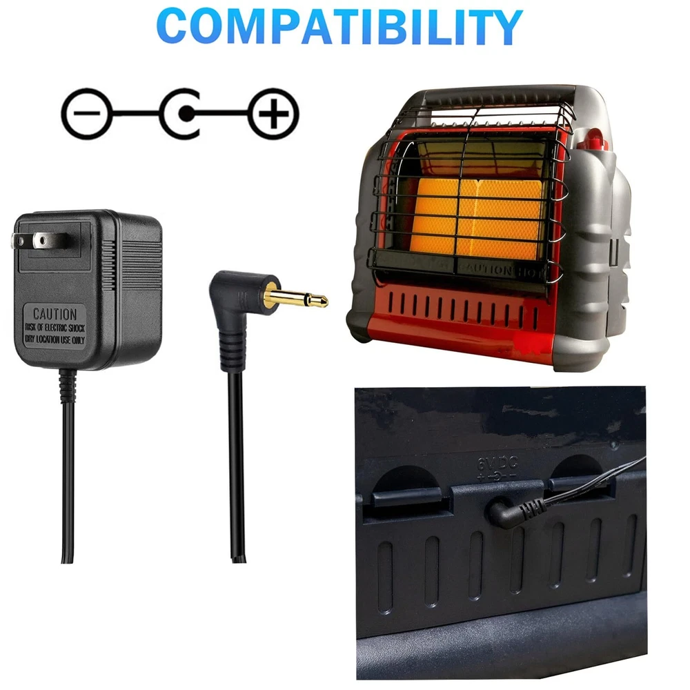 【POWER 】:Input volatage is 110V-120VAC @60Hz; Output rating is@ 6VDC, compatible with Mr. Heater Big Buddy Heater can be used Length: 6.5ft; Adapter Color: Black.our AC adapter ensures a stable power supply to your heater. 【Compatible with】:heater accessories are compatible with Mr. Heater Big Buddy Heater MH18B, F274800 F276127 F274830 F274865,It also works seamlessly with the popular Mr. Heater Big Buddy Heater MH18B and Tough Buddy Heater models, including MRH-MH18B and MRHMH18B,Not compatible with Mr. Heater MH9B, MH12B series heaters building supplies. 【Extended Power Cable and Work for】:Featuring a generous 6.2 FT power cord, Heater adapter provides you with the freedom to move and position your heater wherever you desire. the 6volt power supply cord replacement tool is intended to power the built in fan compatible with Mr. Heater Big Buddy Heater MH18B and Tough Buddy Heater accessories to distribute heat. Intended for Mr. Heater Big Buddy Heater MH18B and Tough Buddy Heater to power the fan Keep your machine running with this 6 Volt Power Adapter. This ac adapter provides an alternate power source for D size batteries and plugs into any standard 110 volt outlet. This 6 volt adapter is specially designed for Mr. Heater Big Buddy Heaters and powers the built-in fan to distribute heat evenly. 【Safety Features】: Over current protection; Total power protection; Over voltage protection; Short Circuit Protection. 【Charger Security】6VDC Power Supply with high quality copper core, low resistivity, high strength and tensile resistance, cord shell was made of PVC material, strong and durable, charging your digitech safety. 【MONEY BACK GUARANTEE】 - If, for whatever reason, you are unsatisfied with your purchase you may return it for a full refund. We pride ourselves on high quality product and promise you will have the best