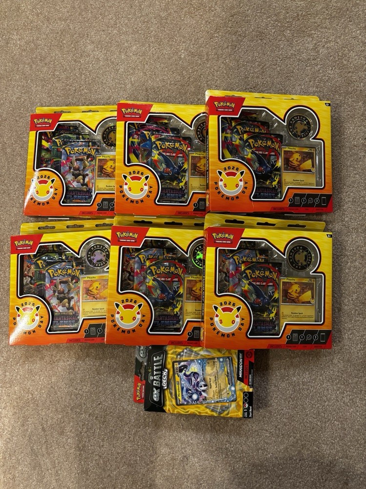 Lot incldes 6 sealed pokemon day 2026 collection boxes, a sealed Miraidon ex battle deck, and 18 trainer gallery cards in which 9 are japanese.