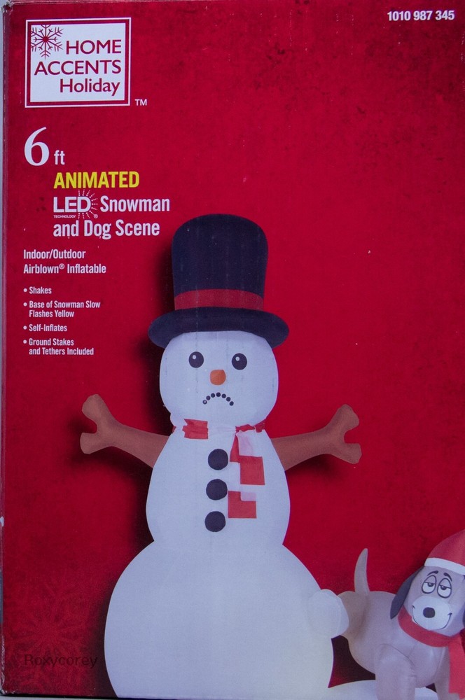 DESCRIPTION: Gemmy Christmas Animated Snowman & Dog Scene Airblown Inflatable Shakes and the base of the snowman flashes yellow Self inflates in seconds 6 ft H x 4.7 ft W New in box *All Electronics sold in our store use a US plug and are designed to run on the US 120v standard.* All international buyers are asked to consider this before purchasing because an adaptor will be required. RETURNS: Your satisfaction is important. Please contact us via eBay regarding any problems before leaving negative feedback. Any defects, damages, or material differences with your item, must be reported to us within 7 days of receipt of the item or 30 days from date of shipment Returned merchandise must be postmarked within 30 days of the shipment notification Return shipping will be paid by the buyer We will contact you within 14 days after receiving the item Refund will be given as money back or exchange if available