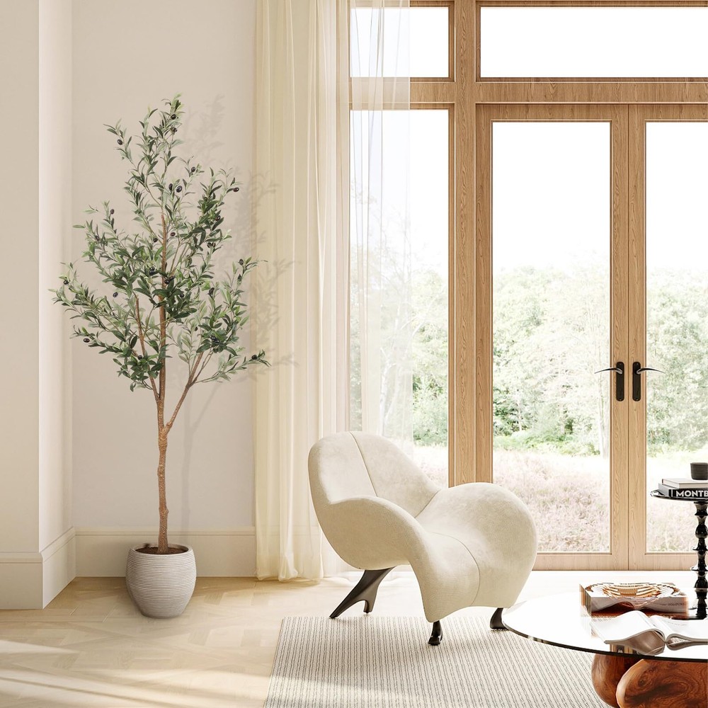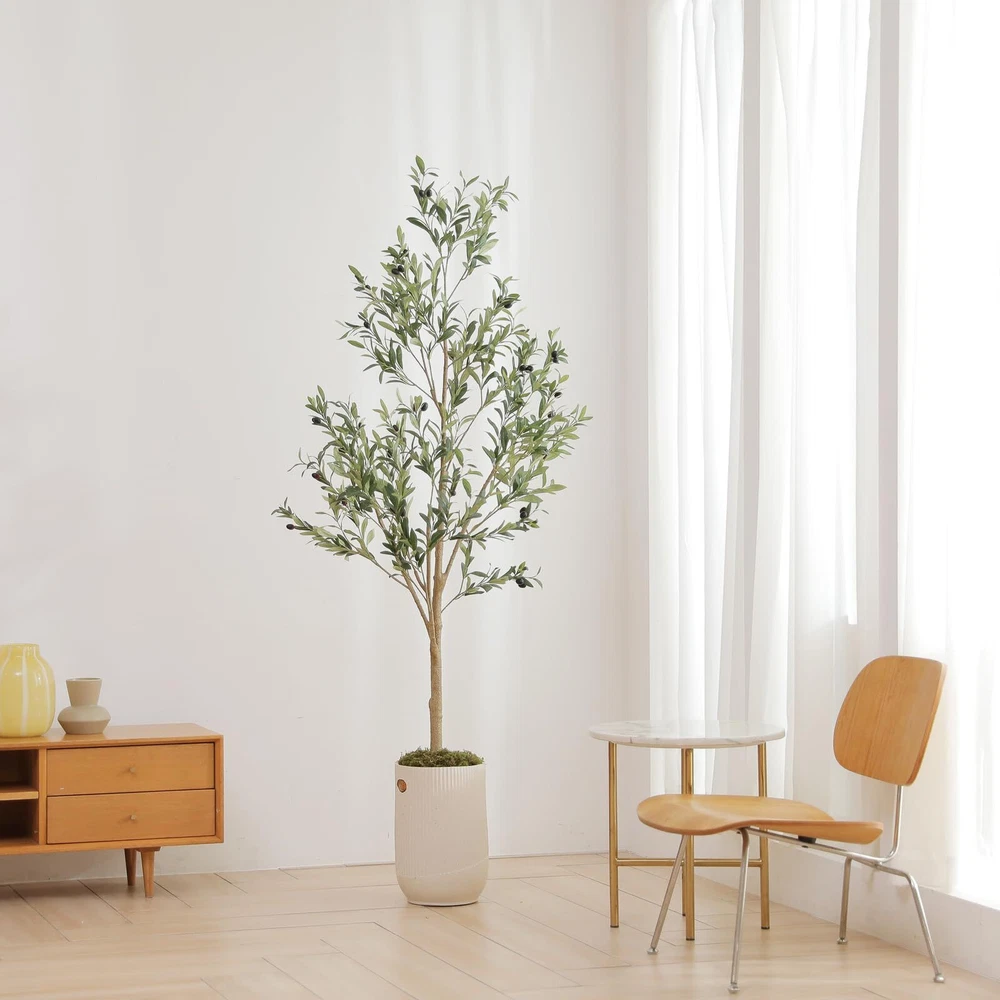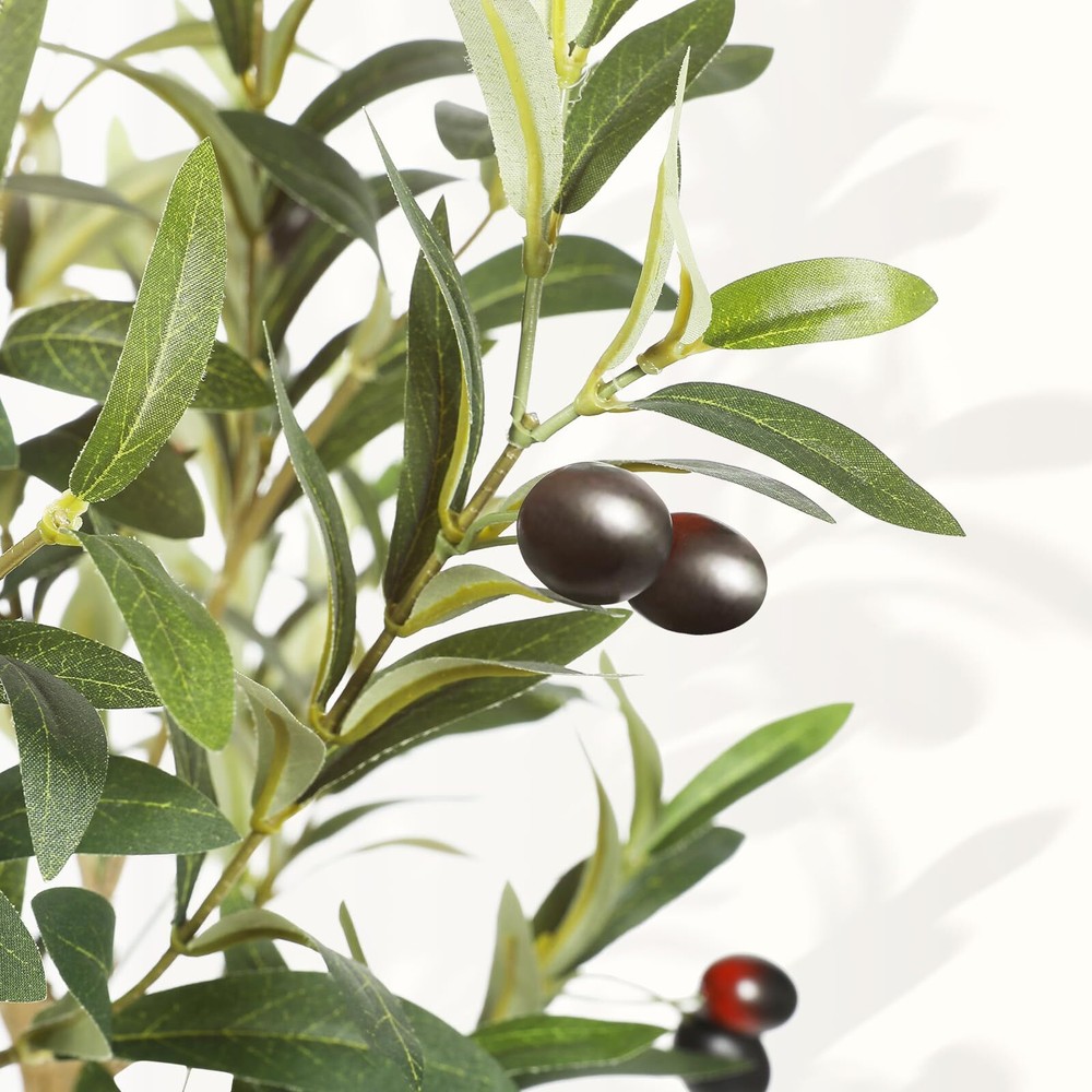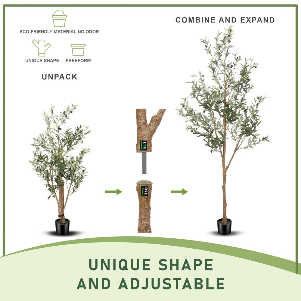 【All Year Round Decor】Our lifelike artificial plants will give your home a real boost. They never wilt and look fresh year after year. And if you keep a few artificial trees stored away, you can change them up with the seasons or brighten up a room anytime you want. It's a Nice Faux Corner Plant Decoration for office house living room home indoor & outdoor 【Unique Shape and Free Maintenance】Always forget watering your lovely plant? Tired of dead plants? Try these olive trees artificial indoor! You don't have to worry about watering it, no more dead olive tree plant. You will love how it brings life to your room without the added maintenance of a live plant 【Sturdy and Adjustable】Our faux olive tree outfitted with sturdy inner metal wires, the branches and leaves themselves are adjustable so you can really craft your ideal artificial olive tree. This fake olive tree will maintain its height, color and shape for years without pruning and shaping to ensure the aesthetic is maintained 【Safe Materials and Lifelike】This artificial olive tree is made of durable and premium silk material(real touch, waterproof. The black nursery pot is made of hard PP material with cement poured inside which to prevent children, pets knock it down. we suggest to placing it in bigger decorative planter to make the fake tree be more perfect 【Perfect Dimension】This tall faux olive tree overall tree is 6ft height and 2.2ft width. The black nursery pot is 5 inch tall and 5.5-inch width. when you receive, artificial tree is divided into two sections. please align the arrows according to the stickers and splice them together. just need only 2-3 minutes to shape it to reach its fullest size. They are also strong enough to support mini lights, A great addition for wedding ceremony, fireplace, party or event decor, etc
