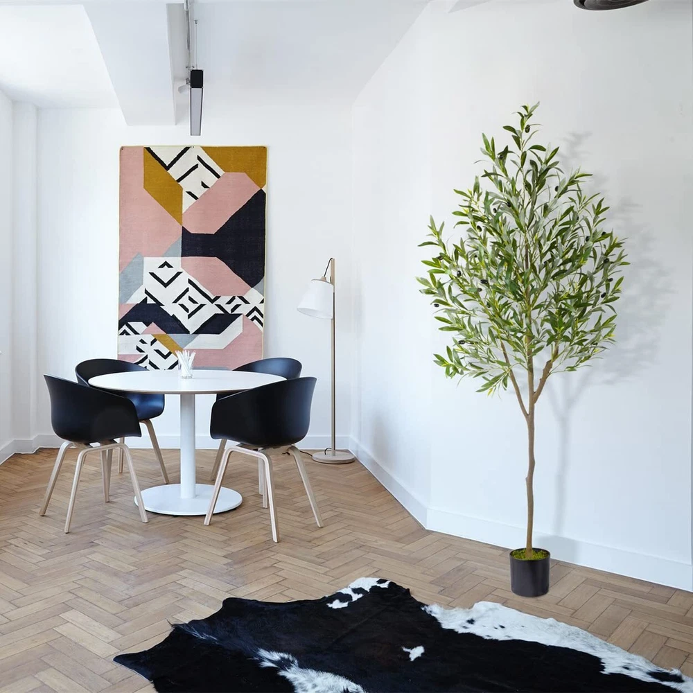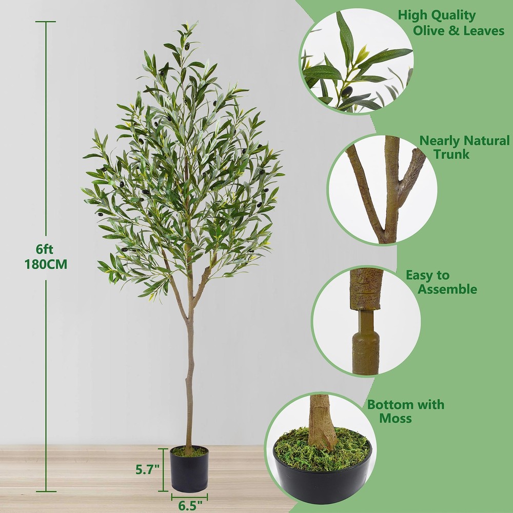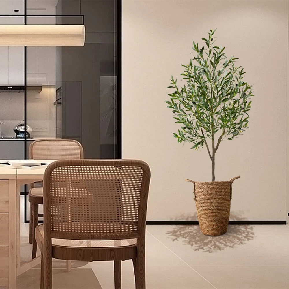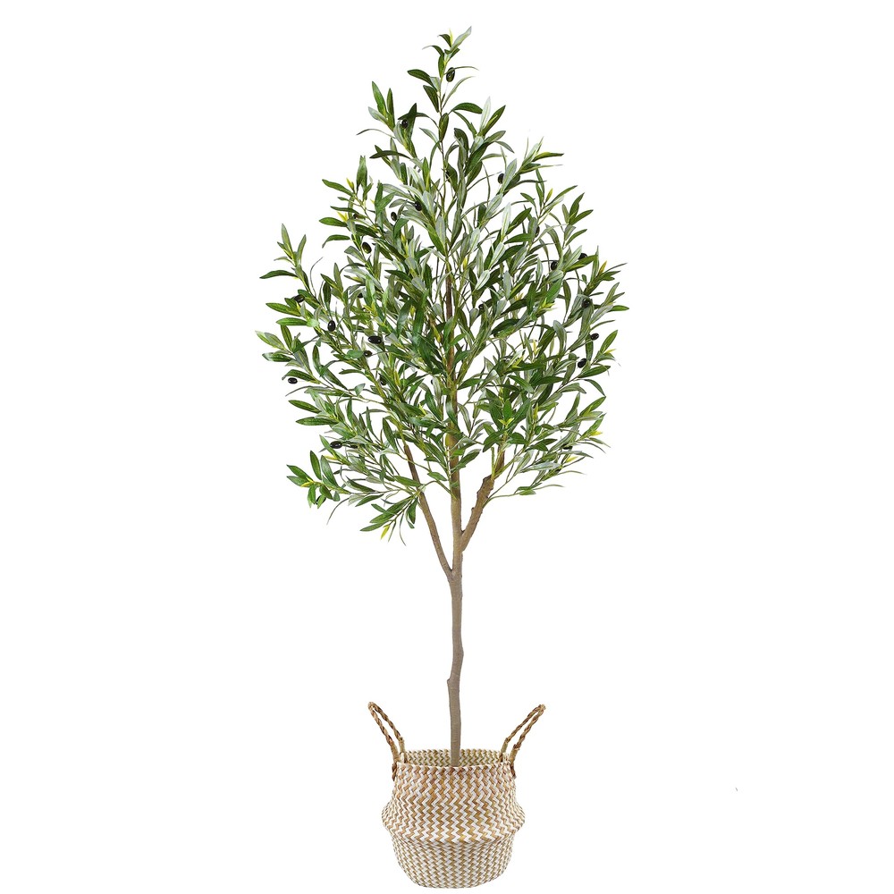 6ft tall artificial olive tree with black pot(6.5"Diameter,5.7"Height) and perfect seagrass woven basket. Nearly Natural Design: The trunk is easy to assemble and stable. The unique olive leaf design makes the olive tree more realistic and looks no different from a real tree. Shape Adjustment: There are wires inside the branches and leaves. When you receive the fake olive plant, you can shape the branches and twigs to present the perfect shape of the tree. High Quality Material: This faux olive tree can be used for a long time without maintenance and are safe for children and pets. Indoor and Outdoor Decor: This silk olive plant perfect to display in your Home, Garden, Office, Shop. Suitable for any season. It can make your place warmer and your life more colorful.