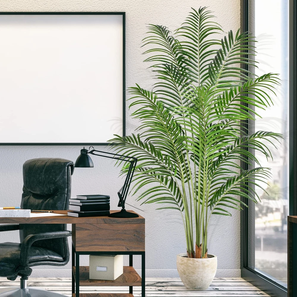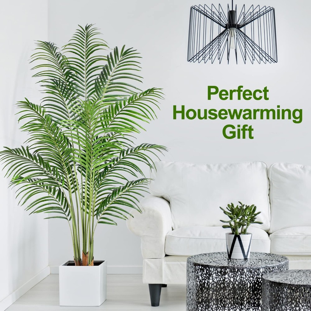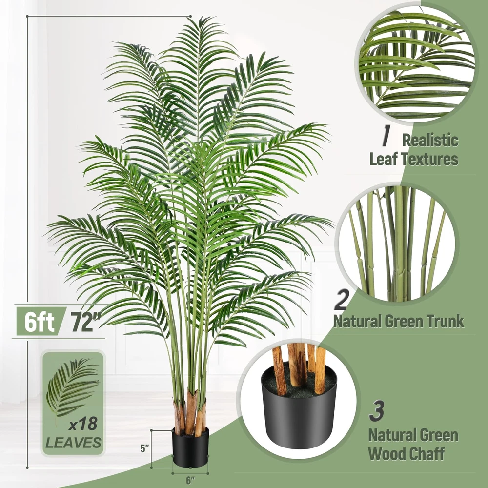 6ft Faux Areca Palm Tree 72" Tropical Paradise Palm Tree Tall Artificial Plant large in Pot Decorations for Indoor Home Office House Li2ving Room Bedroom Decor Perfect Housewarming Gift 2pcs This highly realistic artificial palm tree is made of durable and premium polyester material,the black pot base is covered by green wood chaff and hand-planted with real tree bark which is more realistic and natural than faux plastic bark, "looks so real, they're nearly green live plants!" This 6ft tall artificial palm tree has 18 smooth pristine trunks connected with up to 570 arching feather-like leaves with realistic texture, providing your coastal decor with an authentic and natural look that will last a lifetime,no watering or trimming,looks full and fresh every day This dypsis lutescens palm tree with UV Resistant technology, it will create a sunny atmosphere wherever you place it, it is the perfect decoration for indoor & outside, home, bedroom, office, patio, farmhouse, porch, balcony, entrance, fireplace, doorway, stairway, green garden, yard, dining room, living room, modern aesthetic decor, etc Overall Product Dimensions: 45"D x 45"W x 72"H; Pot Dimensions: 6"D x 6"W x 5"H; Measurements calculated from each furthest outstretched dimension (It depends on how much you bend the branches), the black pot is made of solid cement which to prevent children, pets knock it down Easily create a natural- looking shape, all the branches are outfitted with sturdy metal wires so they could be adjusted different position as needed, It is nestled inside an 6 inch black plastic planter pot for versatile appeal, but you can always tuck it into another beautiful planter pot of your choice so it fits right into your ensemble To achieve the best look, make sure to buy a good quality faux palm tree that is worth your money. Many different options are realistic and sturdy enough to last for years. Find the best artificial plant that suits your style and place it in your home