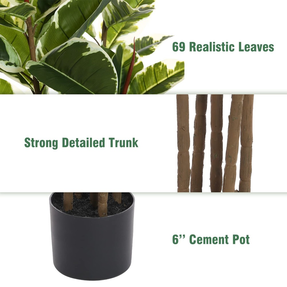 【Lifelike Appearance】Carefully crafted to mimic the appearance of a real live rubber tree plant,looking as close to reality as possible, perfect for any room or office decor. Three trunks adorned with 69 large leaves, clearly textured leaves and variegated color makes this faux rubber tree a timeless home decor for all seasons and will definitely make you feel the existence of nature. 【Lifelike Appearance】Carefully crafted to mimic the appearance of a real live rubber tree plant,looking as close to reality as possible, perfect for any room or office decor. Three trunks adorned with 69 large leaves, clearly textured leaves and variegated color makes this faux rubber tree a timeless home decor for all seasons and will definitely make you feel the existence of nature. 【Stay Green All Year Round】Artificial trees will not wither or die because of the changes of seasons, climates, watering conditions like real trees do. Our faux rubber plants will stay green and fresh for years to come. Just simply wipe it clean if it gets dust on. It will create a natural atmosphere wherever you place it. It’s energy and money saving, win-win! 【DIY Looks】Inserted with soft metal wires, this faux rubber tree can reach its fullness and intended looks by bending and adjusting its branches and leaves. Please be patient and fluff it out from the bottom leaves to the top. Pot Size: 5inx6in(HxW). You can put this artificial tree inside a decorative pot (larger than 6in Width)to match your room decor. 【Stable&Sturdy】This faux silk tree is made of premium silk, polyester and soft metal wire, stable and sturdy. The black nursery pot is made of hard PP material with cement poured inside which prevents children or pets from knocking it down. Once you have settle its look, this faux rubber tree will stay fresh and green all the time. 【Indoor&Outdoor Decor】Standing 6ft tall from the pot bottom to the top leaves, this artificial rubber tree is a perfect room decor piece. No matter it’s for indoor or outdoor decor, this faux tree will creates a finishing touch to any places. Please avoid direct sunlight and rain for outdoor use. It’s a perfect gift choice on Parties, Housewarming, Birthdays, Ceremonies, Weddings,etc.