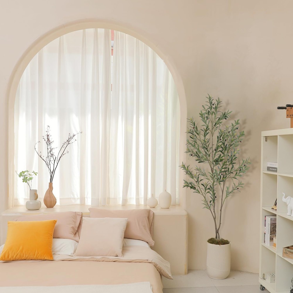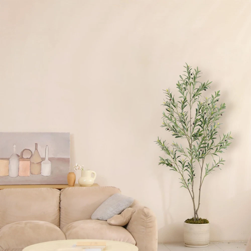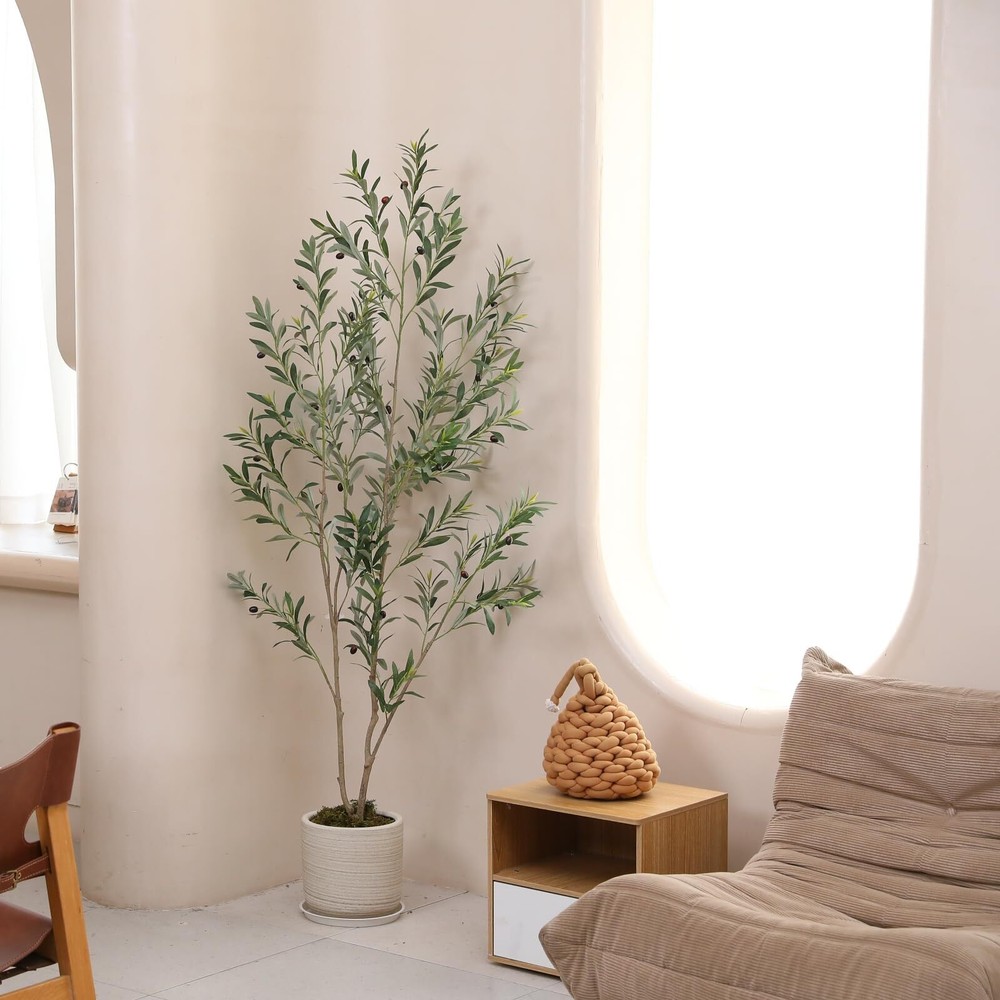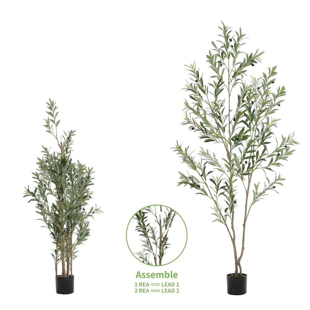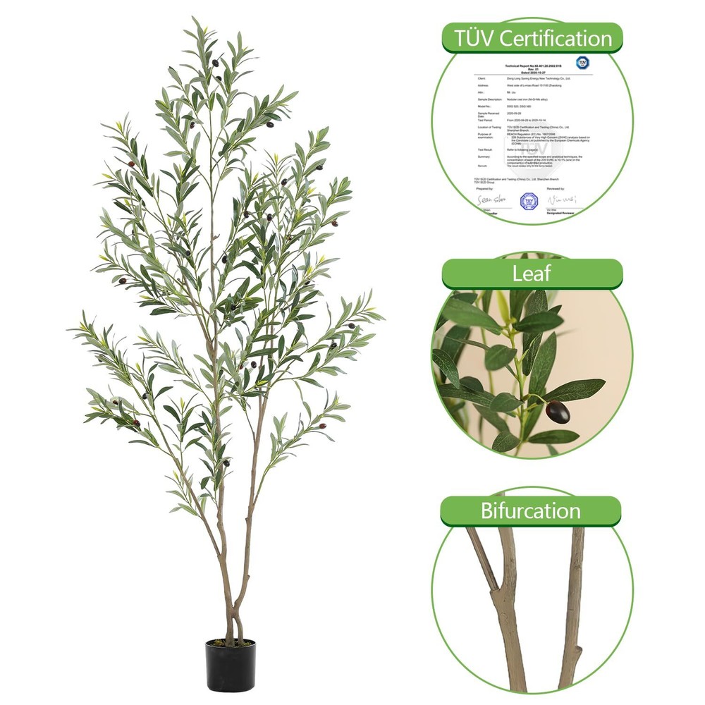 【Fairly Lifelike Faux Plants】This 6 feet faux olive tree is carefully crafted to mimic the appearance of olive tree, looking as close to reality as possible. Single trunk splits into several stems, adorned with dozens of olive fruits, which made of rubber silk fabric. Clearly textured olive leaves and vivid color makes this fake tree a timeless seasonal home decor and will make your environment more comfortable and trendy. 【Easy to Maintenance】This fake olive tree doesn't need sunlight, and fertilizing and watering it will save you from the trouble of falling leaves. Make sure Artificial Olive Trees are lifelike, evergreen, and require no pruning. Just wipe it off with a damp cloth when it gets dusty. You will love how it brings life to your room without the added maintenance of a live plant. 【Adjustable Olive Tree Branches】Featuring lush silvery-green oblong leaves, long slender branches, and dark purple olives. Packed with plastic bag and shipped in carton, Our faux plants outfitted with sturdy inner metal wires, adjust the branch to the shape you like. This artificial plants indoor will maintain its height, color and shape for years without pruning and shaping to ensure the aesthetic is maintained. Craft your ideal olive tree to decor your home ! 【Safe Materials】This artificial tree is made of durable and premium silk material(real touch, waterproof). All materials are flame-retardant treated, TÜV certified, without any odor, so it is no problem even if placed in a sealed environment. 【Easy to Assemble】Our artificial olive trees indoor are easy to install, just insert the corresponding numbered branches into the trunk. And the main tree trunk come pre-assembled in heavy-duty pots made of plastic and concrete, so each tree can stand on its own. The black nursery pot is 4.5 inch tall and 6 inch width. Recommend you place this tree into a decorative pot, which will enhance the overall decorative effect. 【Perfect Size for Decoration】This 72 inch tall fake olive tree is is perfectly sized for interior decoration. It is a great ideal decorating for living rooms, bedrooms, study room, dining rooms and offices, and is also perfect for entryways, patios and commercial locations such as bookstores and coffee shops. It's also a great gift for Christmas, Thanksgiving, housewarming, for friends or family. You’ll wish you found this years ago !